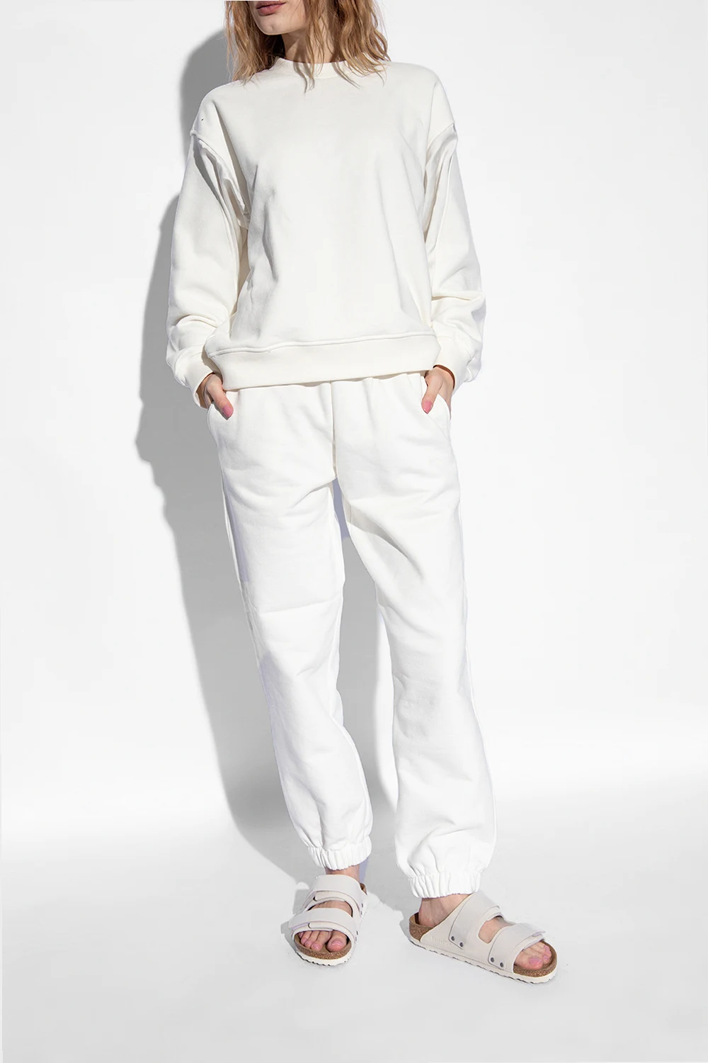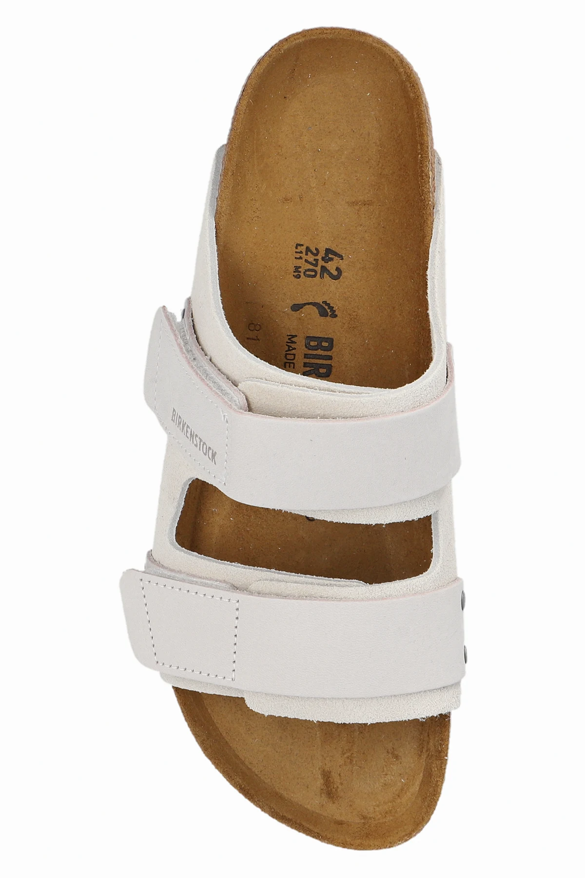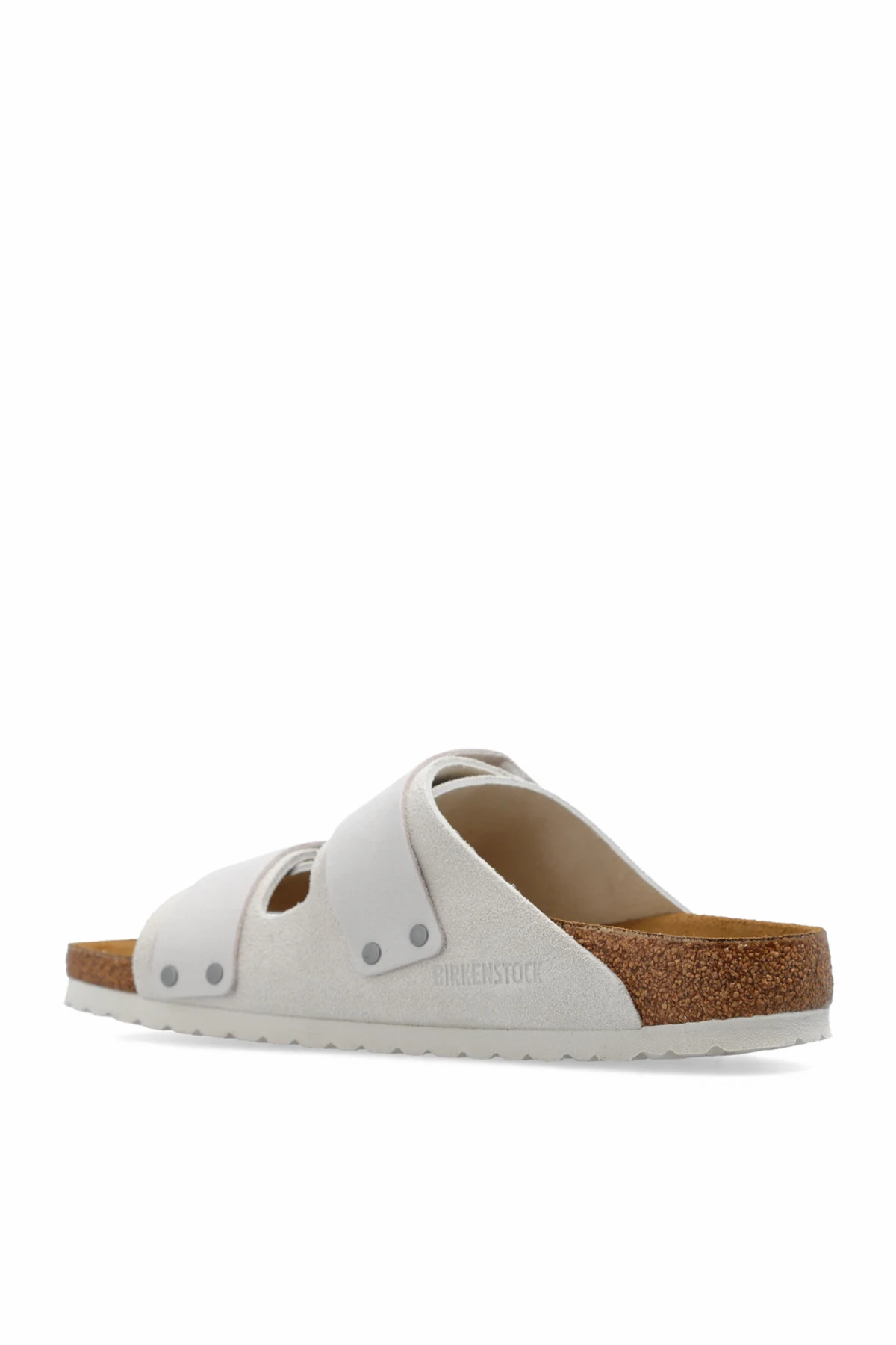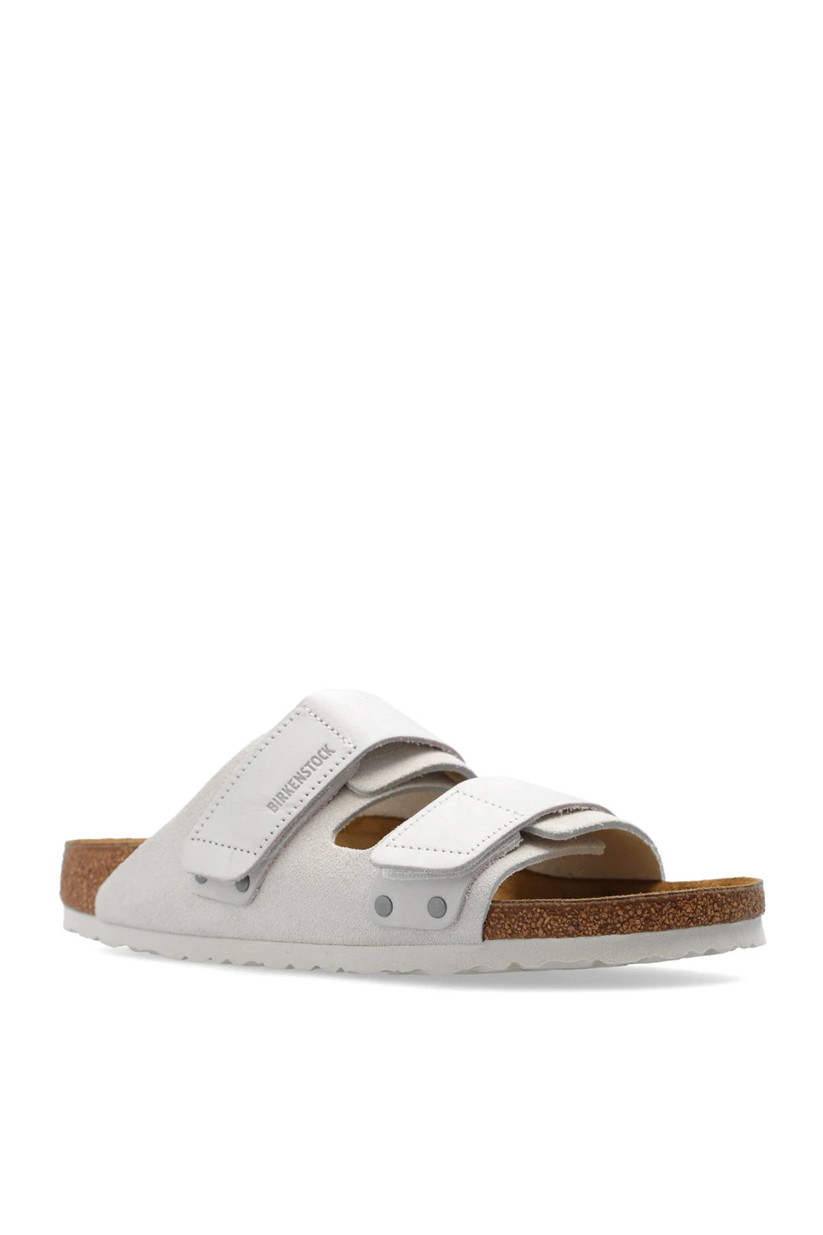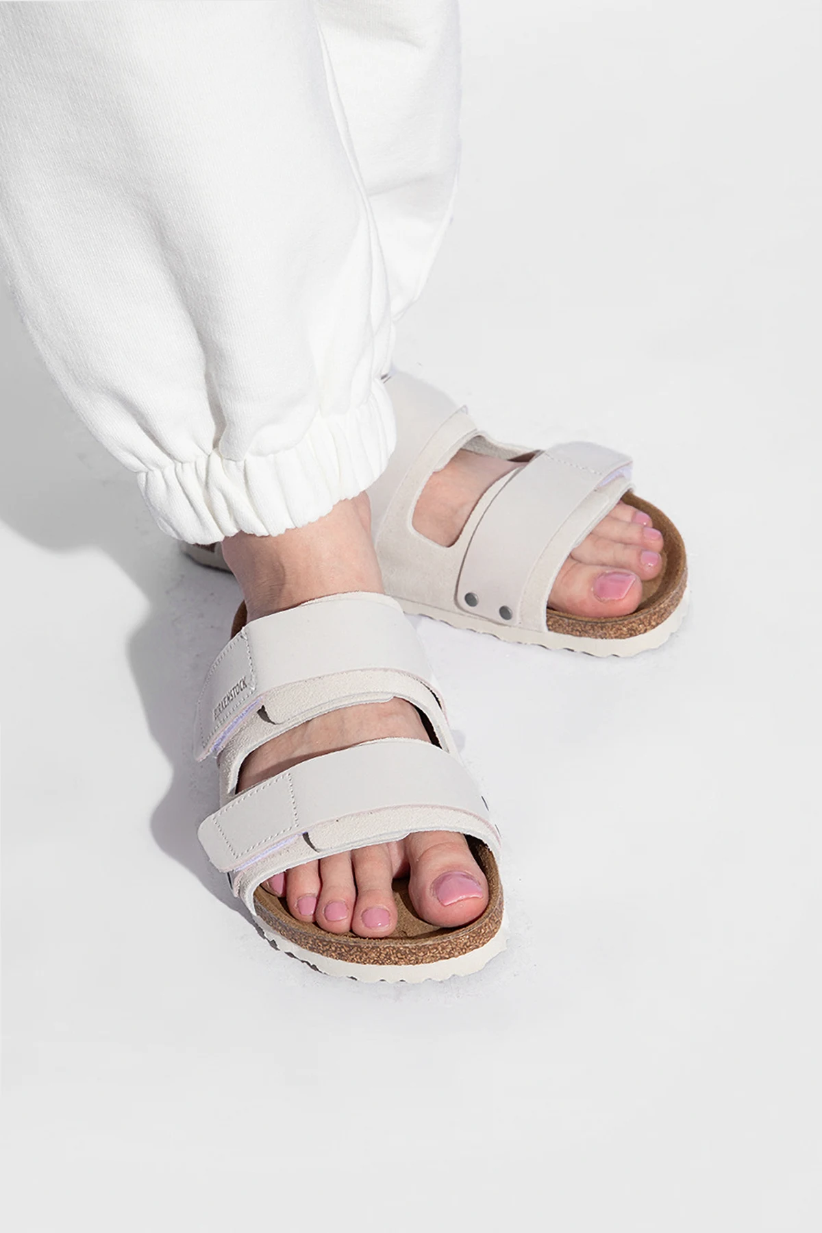 Jasnoszare klapki, model ‘Uji’ Birkenstock. Wykonane z nubuku i zamszu. Zapinane na rzepy. Ozdobione wytłoczonym logo. Anatomicznie ukształtowana wkładka korkowo-lateksowa o zwężanej szerokości. Brązowo-szara podeszwa wykonana z naturalnego korka oraz pianki EVA.