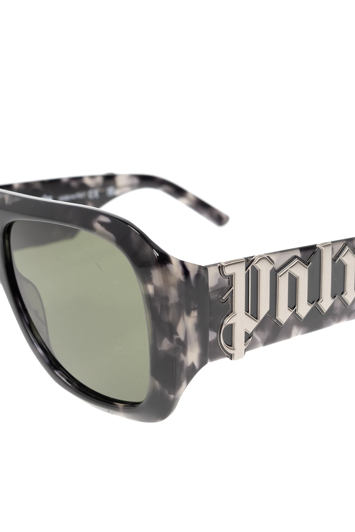 Czarno-szare, szylkretowe okulary przeciwsłoneczne, model ‘Sonoma’ Palm Angels. Szerokie zauszniki ozdobione metalową aplikacją w kształcie logo w kolorze srebrnym. Zielone soczewki ze 100% ochroną przed promieniowaniem UV. Dołączone etui.