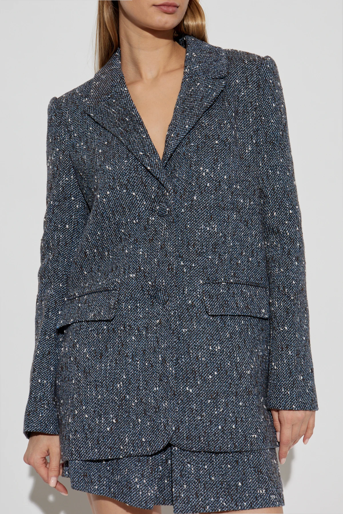 Prezentujemy Marynarkę o luźnym kroju z ekskluzywnej kolekcji marki Self-Portrait, która łączy w sobie ponadczasową elegancję z nowoczesnym stylem. Uszyta z tkaniny inspirowanej tweedem, ukazuje subtelny melanżowy wzór , harmonijnie łączący odcienie niebieskiego, białego i czarnego.