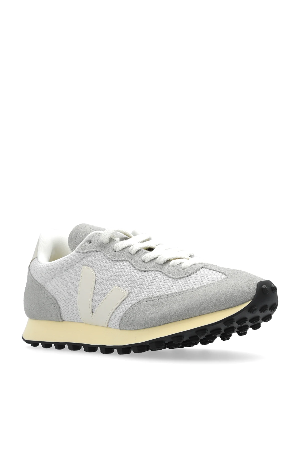 Biało-szaro-kremowe, sznurowane buty sportowe, model ‘Rio Branco Alveomesh’ Veja. Wykonane z oddychającej siatki ‘Alveomesh’ pochodzącej z recyklingu. Wykończone zamszem. Naszywka z logo wykonana z gumy oraz odpadów ryżowych. Warstwa wewnętrzna o specjalnej, siateczkowej strukturze wykonana z materiału pochodzącego z recyklingu – cechuje się wyjątkową odpornością na tarcie. Wkładka wykonana z trzciny cukrowej, gumy Amazon, bawełny organicznej i pochodzącej z recyklingu pianki EVA. Czarno-kremowa, gumowa podeszwa wykonana z materiałów organicznym oraz pochodzących z recyklingu.