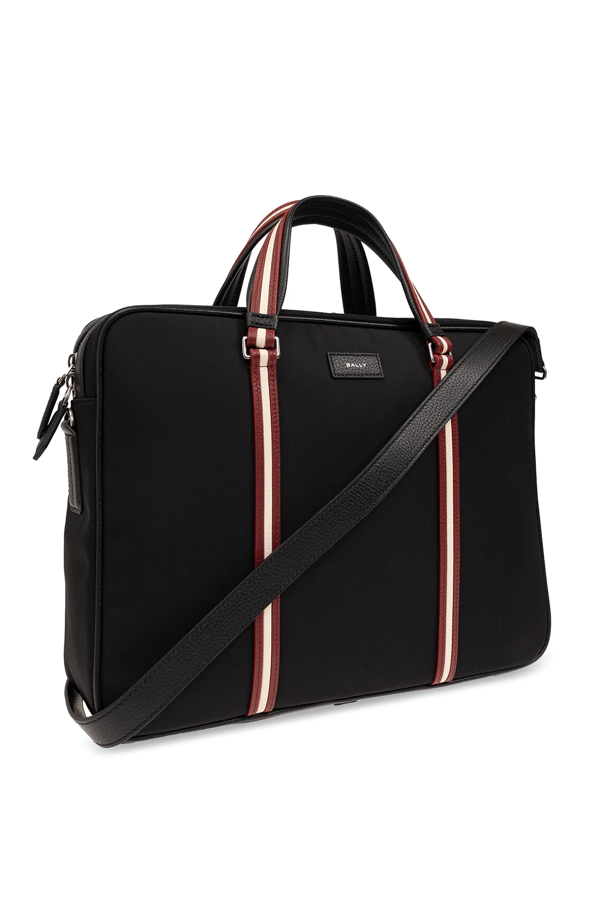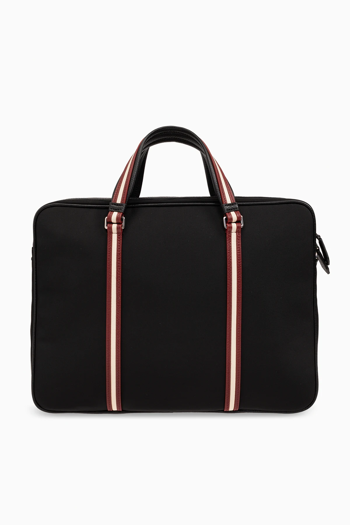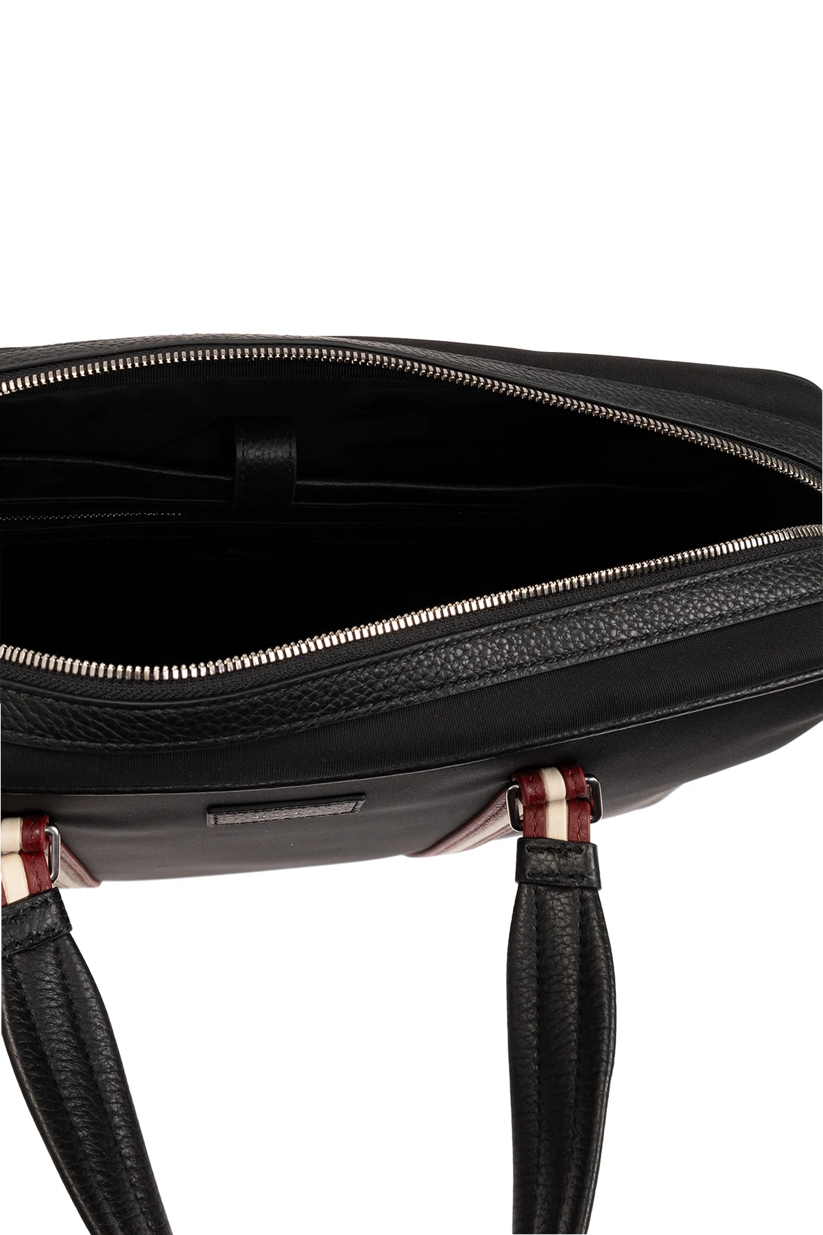 Czarno-bordowo-kremowa torba na dokumenty Bally. Wykonana z materiału. Wykończona skorą. Zamykana na dwubiegunowy zamek. Z przodu naszywka z nadrukowanym logo w kolorze srebrnym. Dwie półokrągłe rączki. Odpinany, regulowany pasek. Wewnątrz komora, kieszeń na laptop zapinana na zatrzask, kieszeń zamykana na zamek i wsuwana kieszeń. Metalowe elementy w kolorze srebrnym.