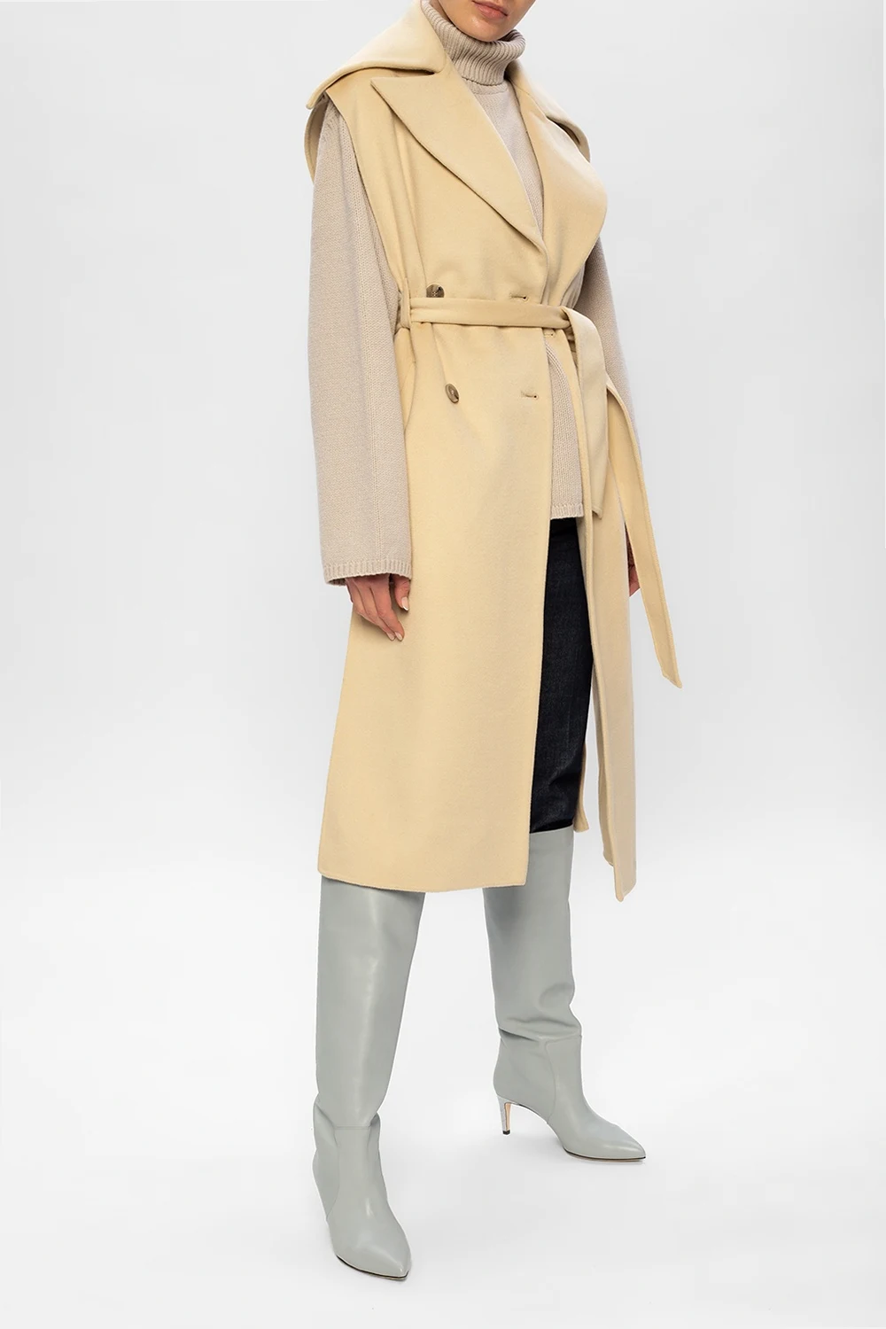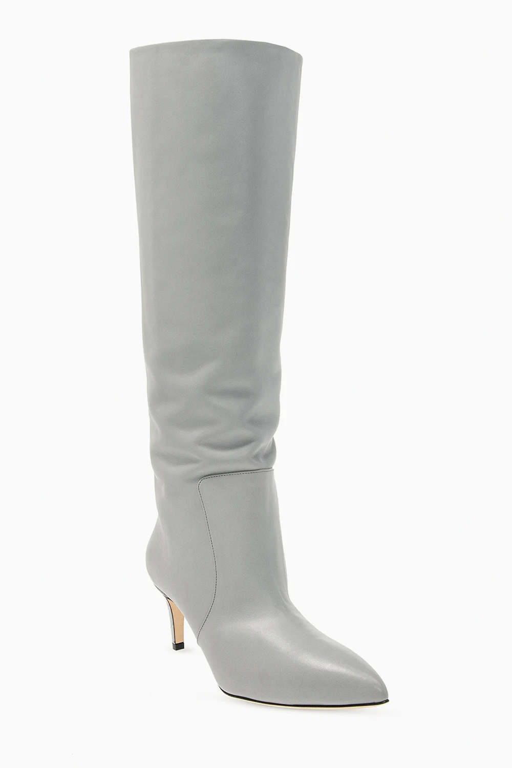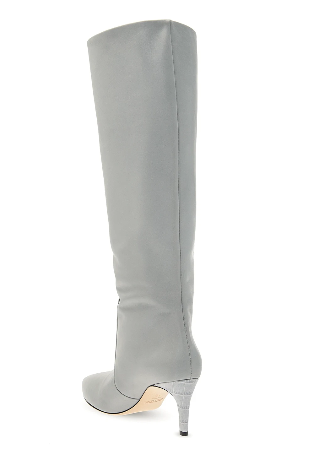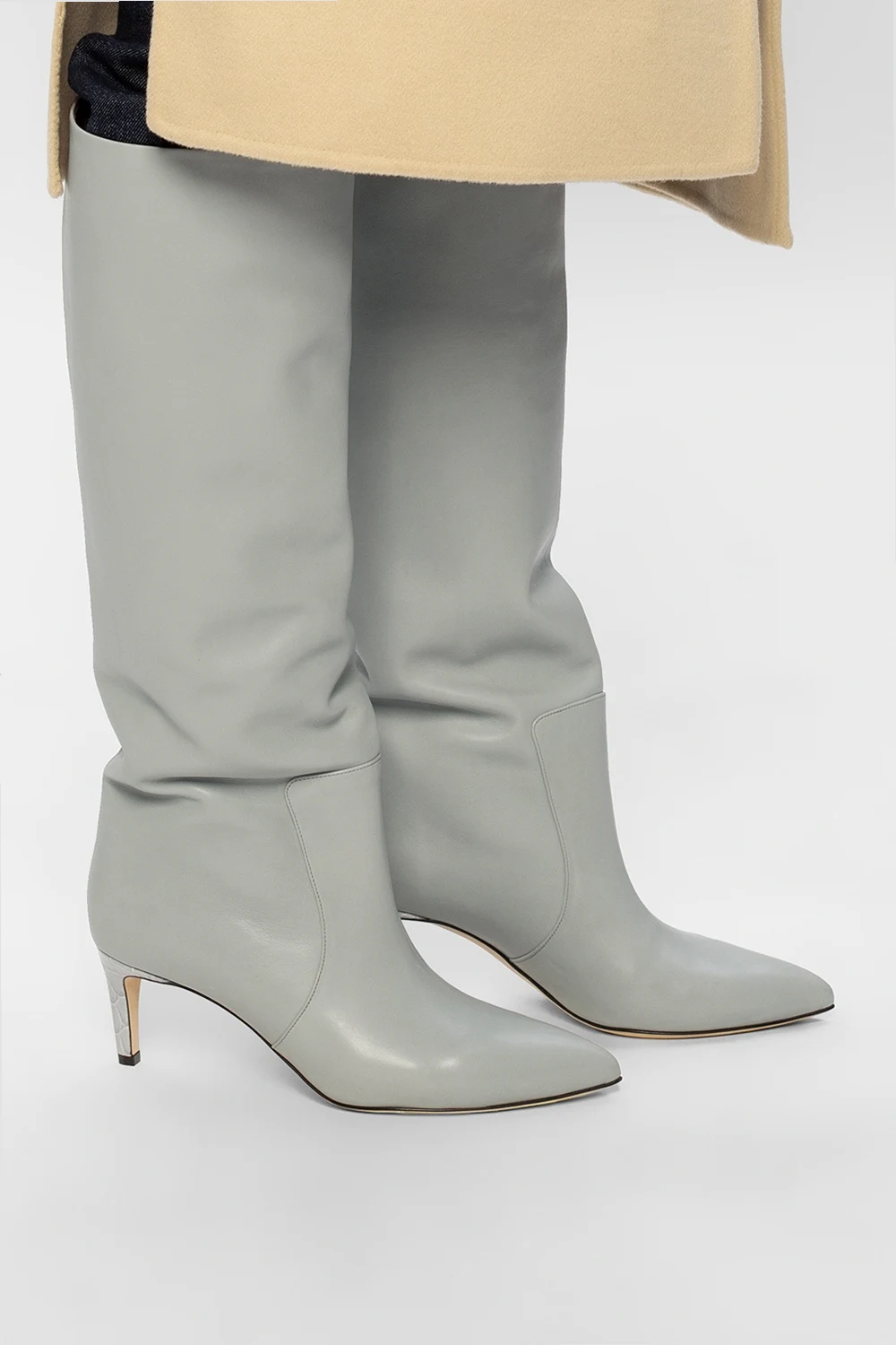 Szare kozaki Paris Texas. Wykonane ze skóry. Nosek w szpic. Beżowa, skórzana podeszwa.