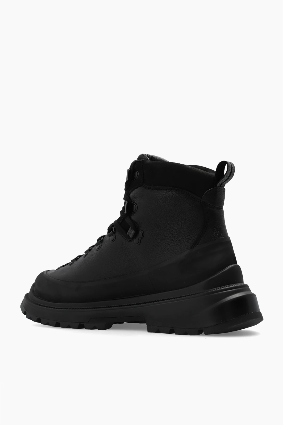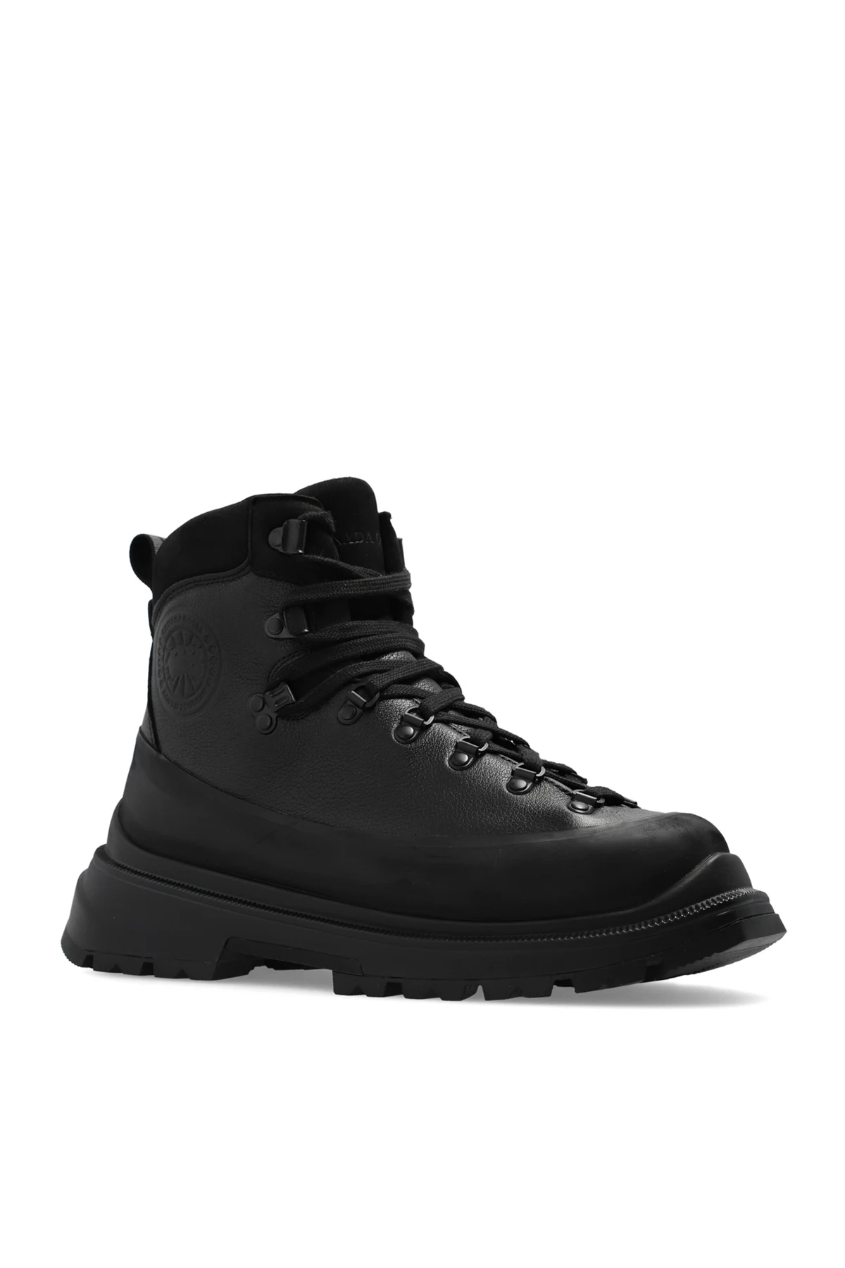 Czarne, sznurowane buty za kostkę, model ‘Journey’ Canada Goose. Wykonane ze skóry Terracare® o ziarnistej fakturze. Miękka i elastyczna cholewka zbudowana z zaledwie trzech części, co eliminuje szwy, aby zmniejszyć punkty nacisku i tarcie. Z boku wytłoczone logo. Z tyłu odblaskowe detale. Wnętrze z wodoodporną membraną Hdry® tworzące całkowicie szczelną barierę. Podeszwa środkowa zapewniająca amortyzację i śródstopie z dodatkowym stabilizatorem. Czarna, gumowa podeszwa.