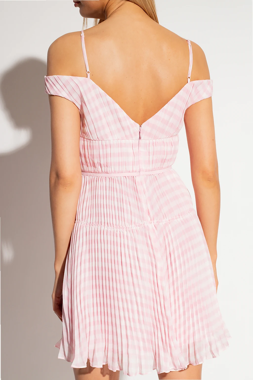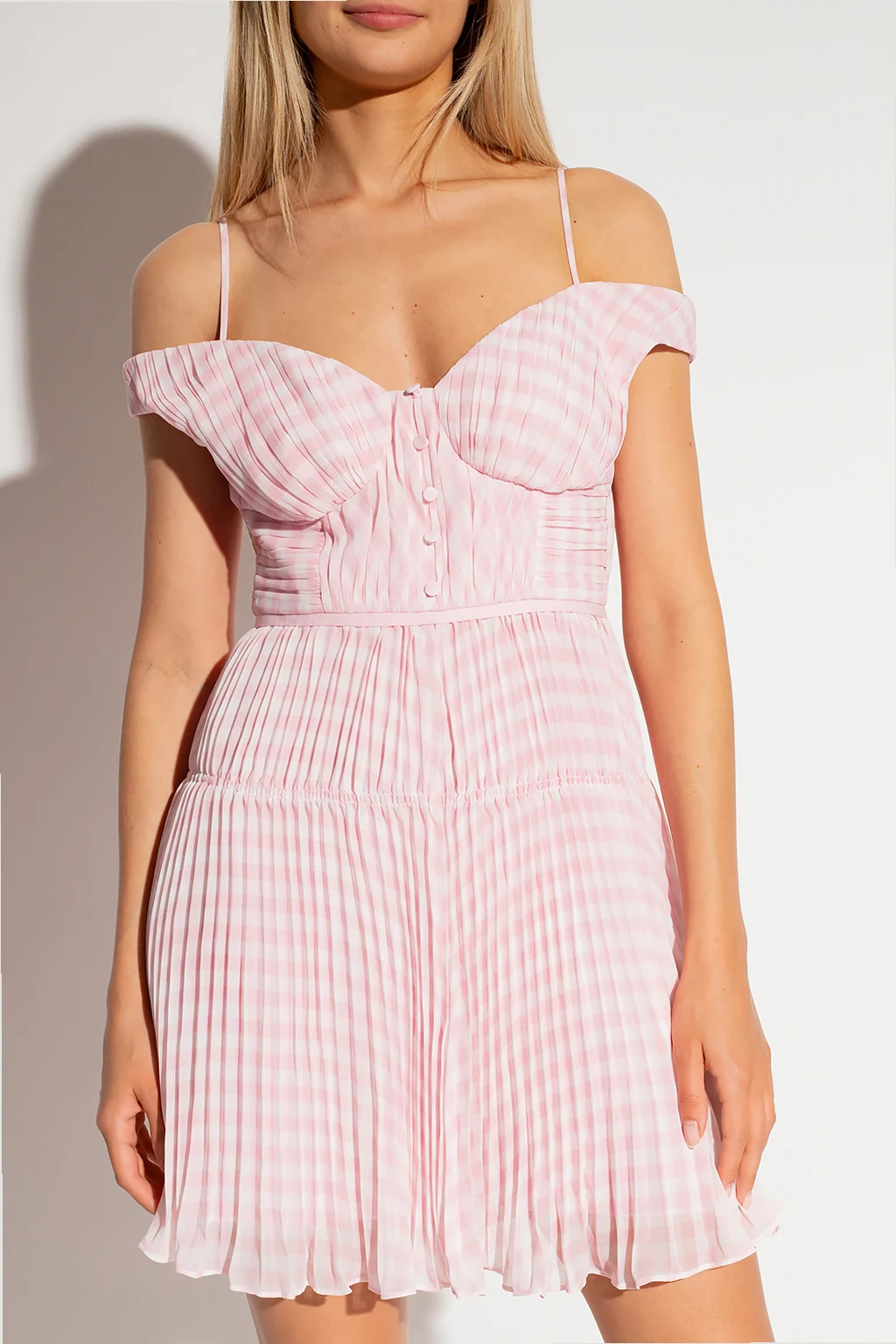 Jasnoróżowo-biała sukienka Self Portrait. Wykonana z szyfonu wzorem w kratę ‘gingham’. Krój inspirowany latami 50-tymi zapinany z tyłu na kryty zamek oraz haftkę. Z przodu dekoracyjne guziki. Dopasowana góra z zaznaczonymi miseczkami, dekoltem w łódkę oraz cienkimi, regulowanymi ramiączkami. Plisowana, krótka spódnica.