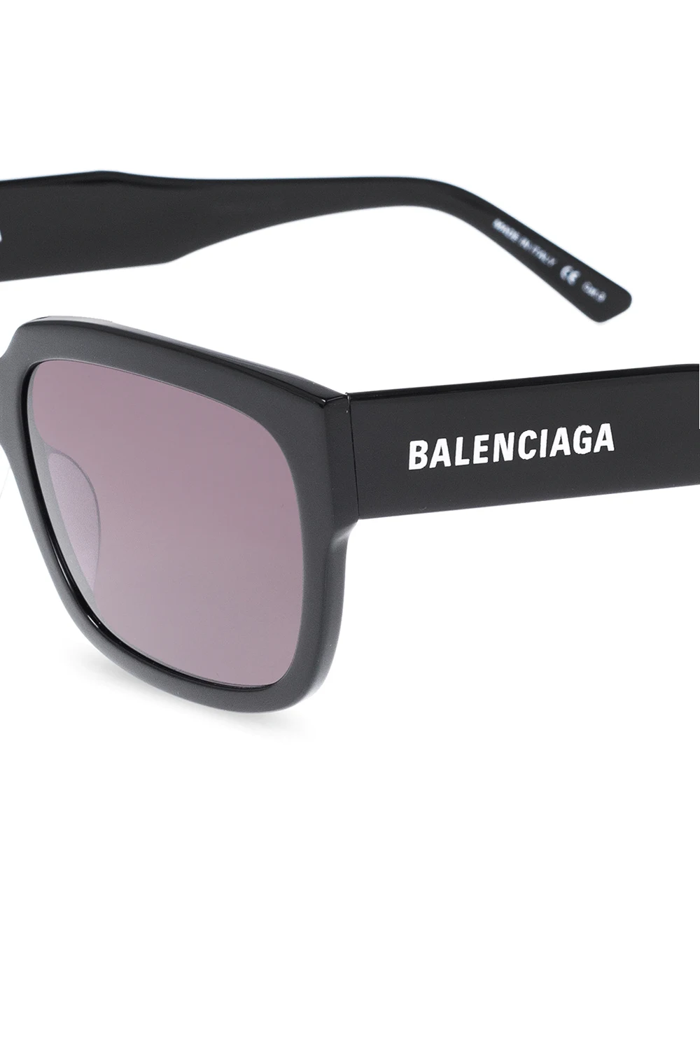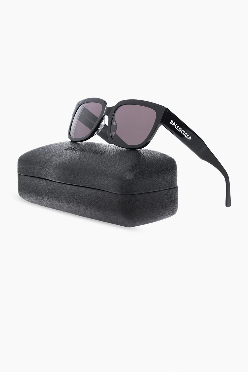 Czarne okulary przeciwsłoneczne Balenciaga. Z boku ozdobione nadrukowanym logo w kolorze białym. Szare, certyfikowane soczewki 100% UVA/UVB. Dołączone etui.