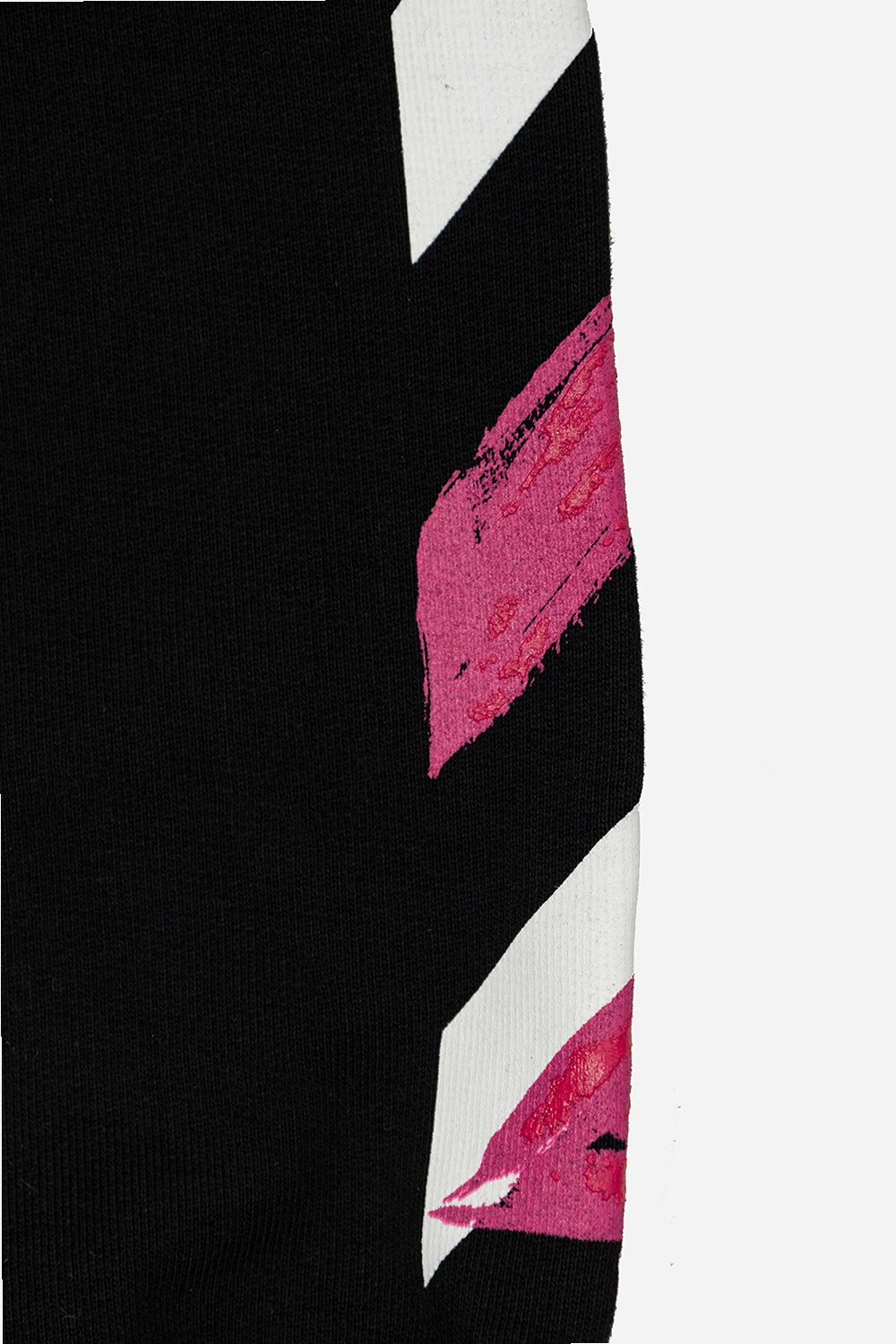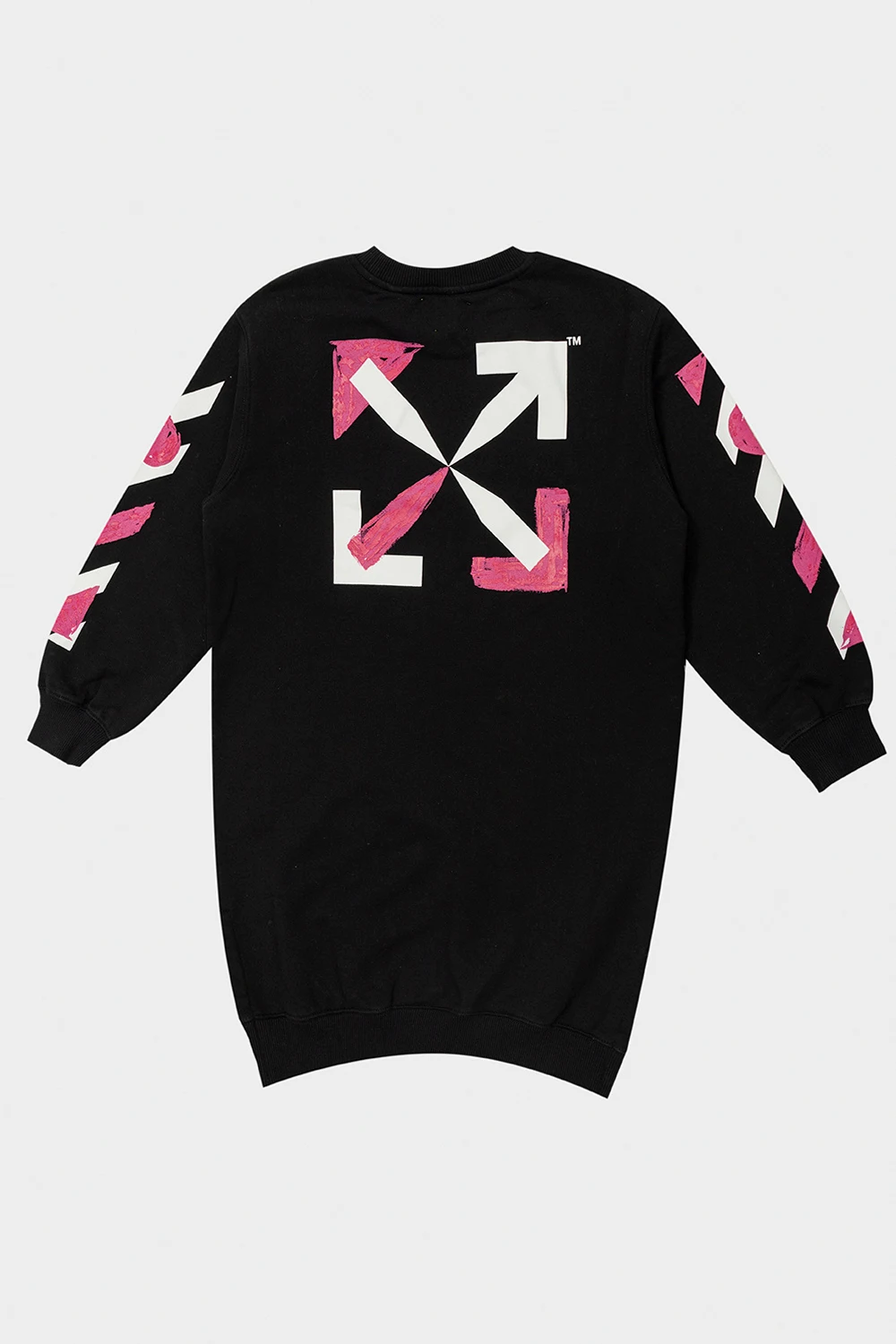 Czarna sukienka dresowa Off-White Kids. Wykonana z bawełny. Z przodu ozdobiona nadrukowanym logo w kolorze białym. Na rękawach oraz z tyłu charakterystyczne dla marki nadruki: ‘Arrows’ i diagonalne pasy, z dekoracyjnym efektem malowania pędzlem w kolorze różowym. Po bokach krótkie rozcięcia. Okrągły dekolt, dół oraz długie rękawy zakończone ściągaczami.