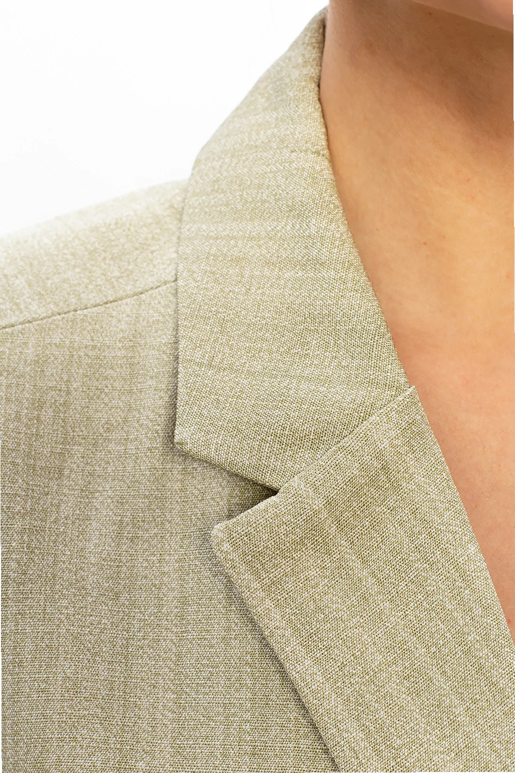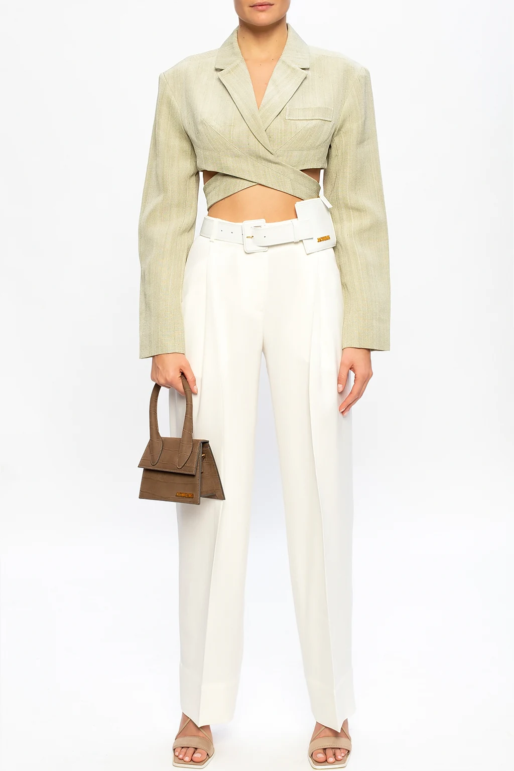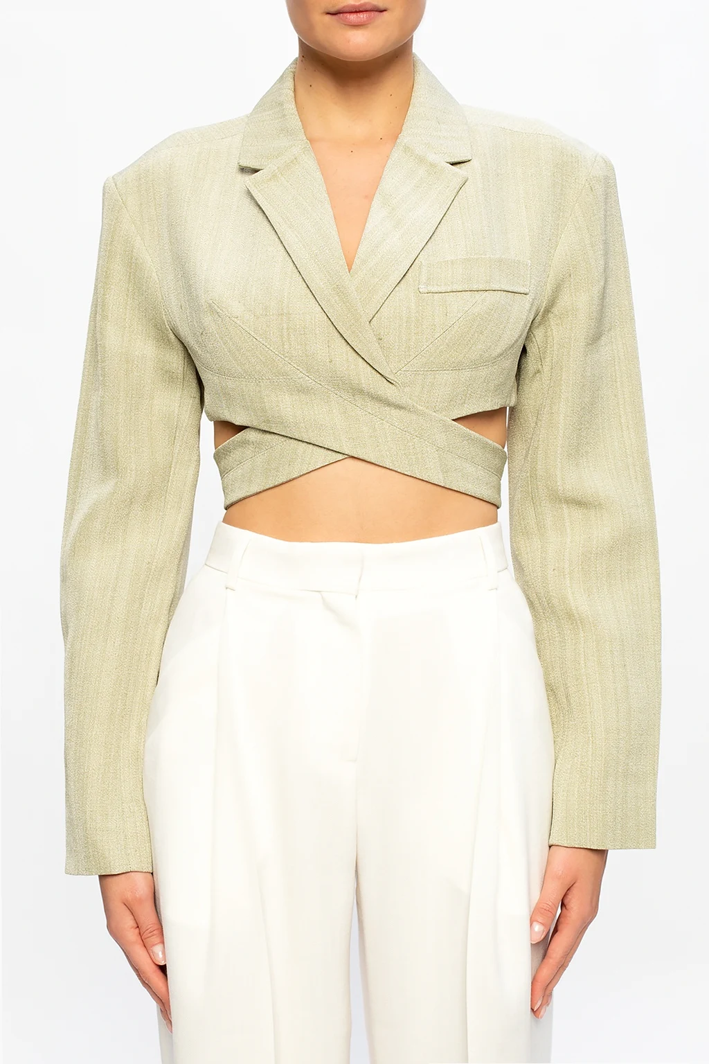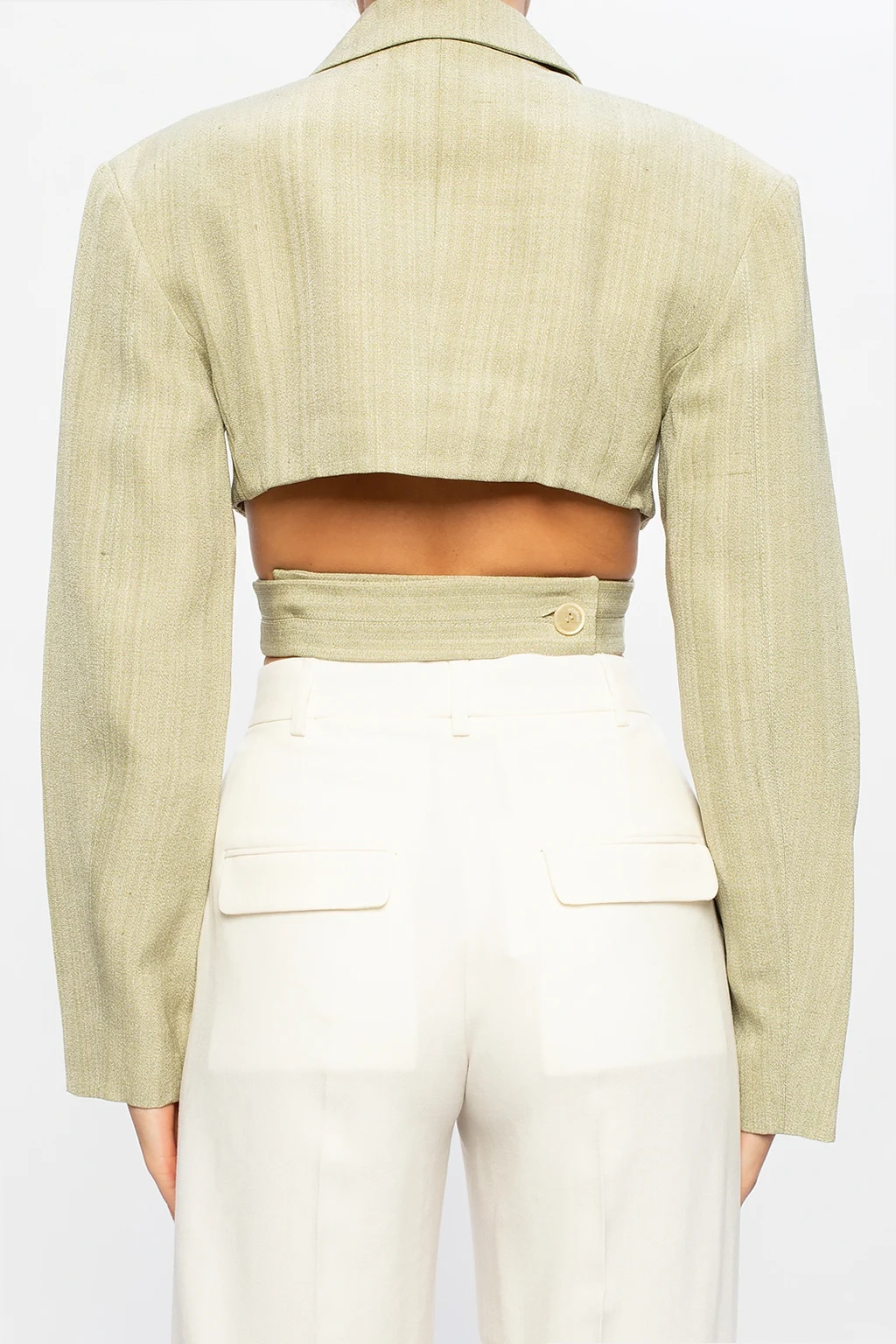 Zielona, krótka marynarka z otwartymi klapami, model 'Azur' Jacquemus. Zapinana na guzik. Z przodu wsuwana kieszeń.