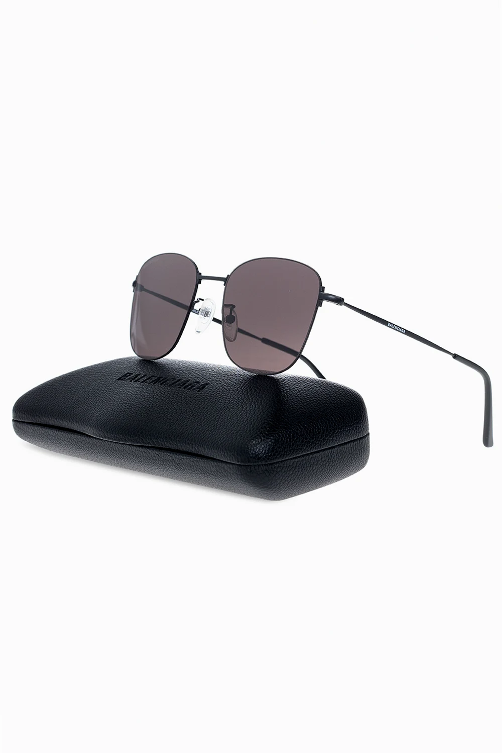 Czarne okulary przeciwsłoneczne, model ‘Invisible Square’ Balenciaga. Cienkie, metalowe oprawki o kwadratowym kształcie, z pojedynczym mostkiem. Zauszniki z elastycznego metalu z białym logo. Czarne, nylonowe soczewki z laserowo wyciętym logo z 100% ochroną UVA/UVB. Dołączone etui.