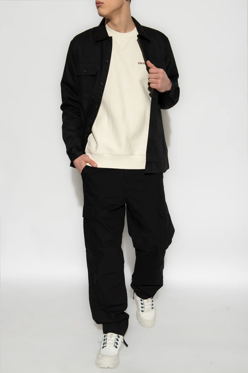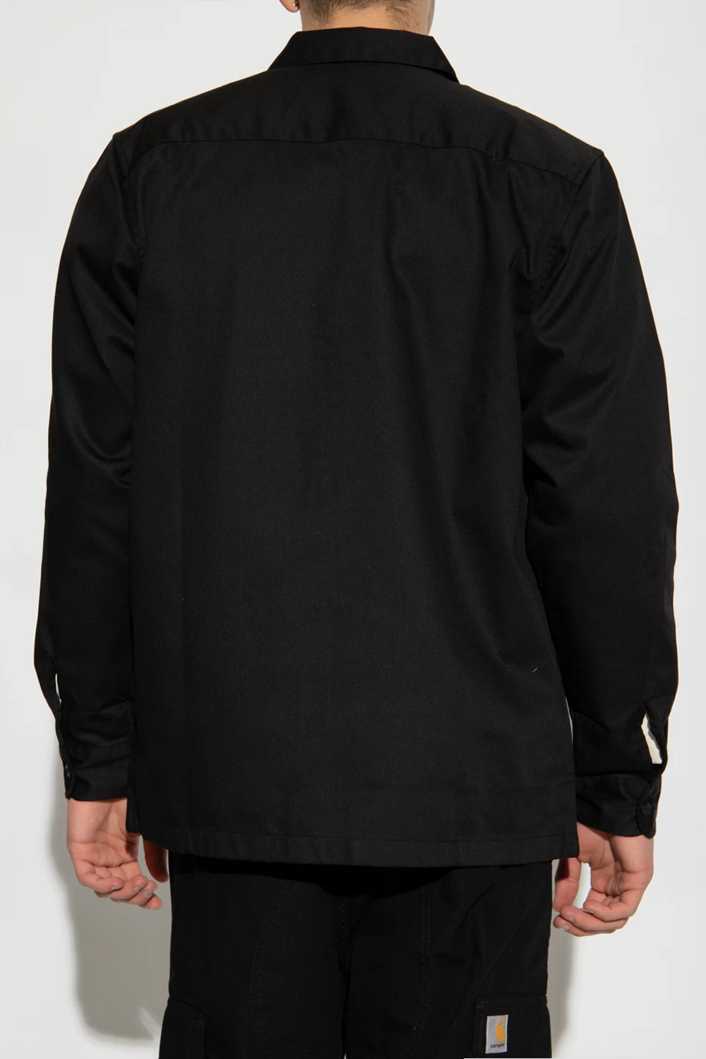 Czarna koszula, model ‘Master’ Carhartt WIP. Przód, dwie kieszenie oraz mankiety przy długich rękawach zapinane na guziki. Ozdobiona naszywką z logo. Prosty krój.