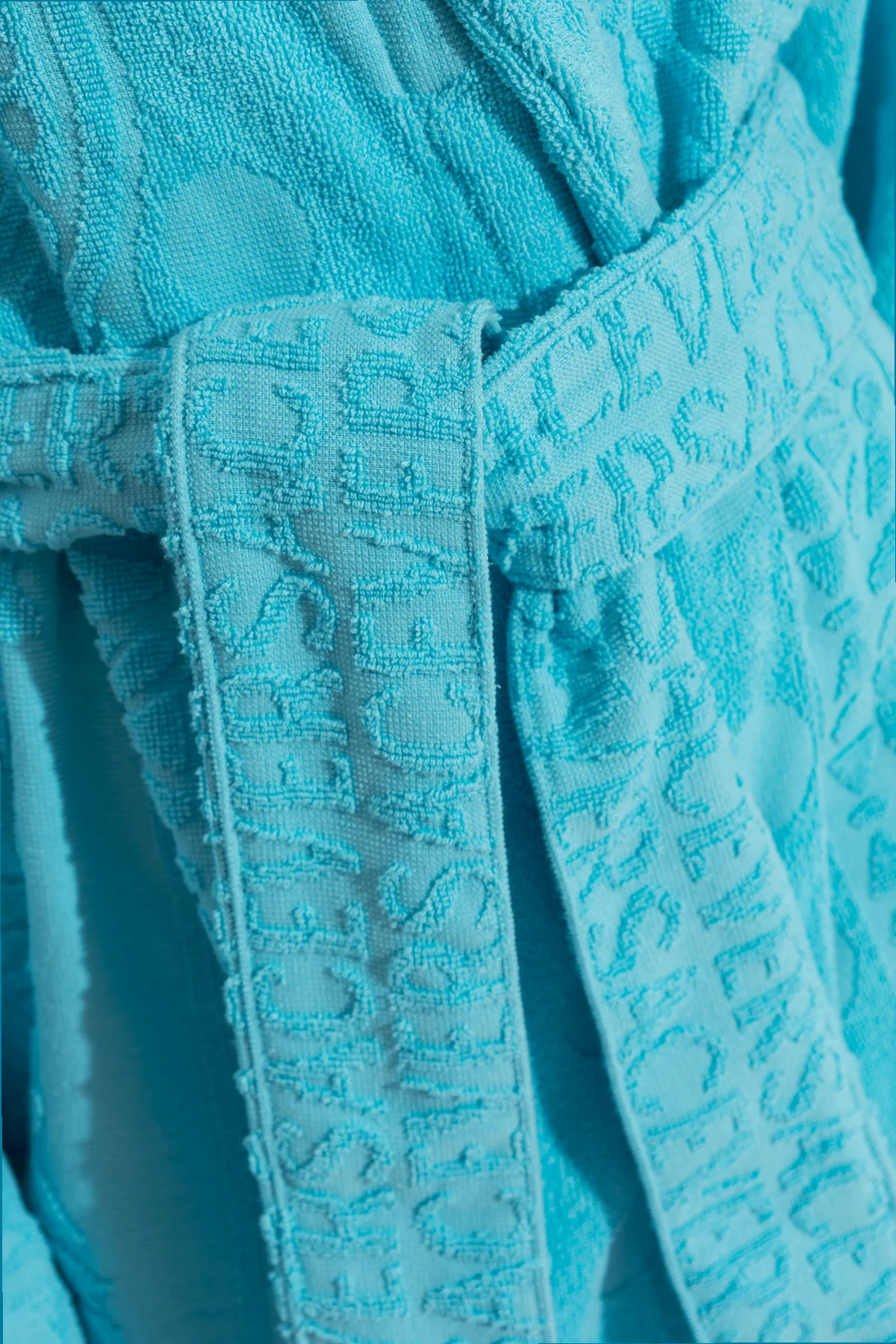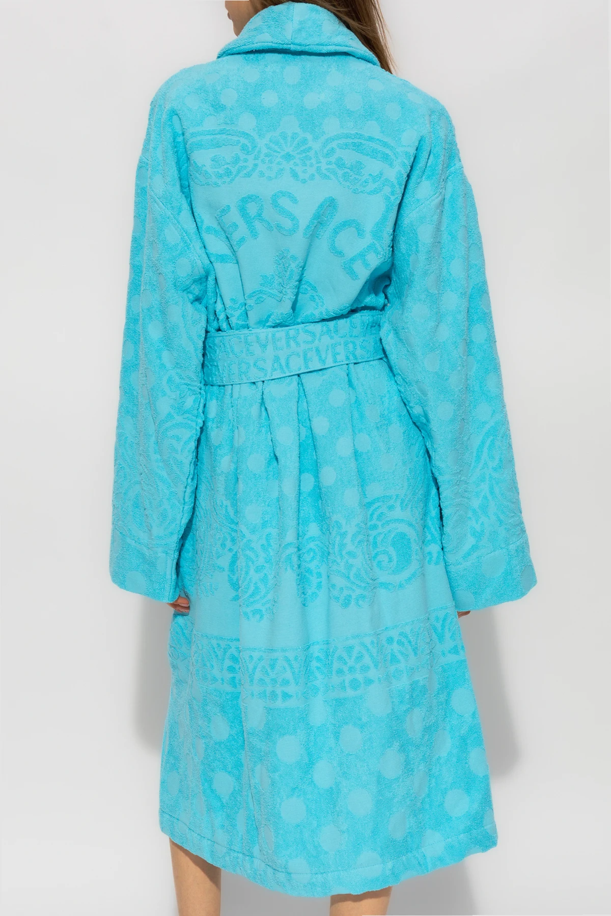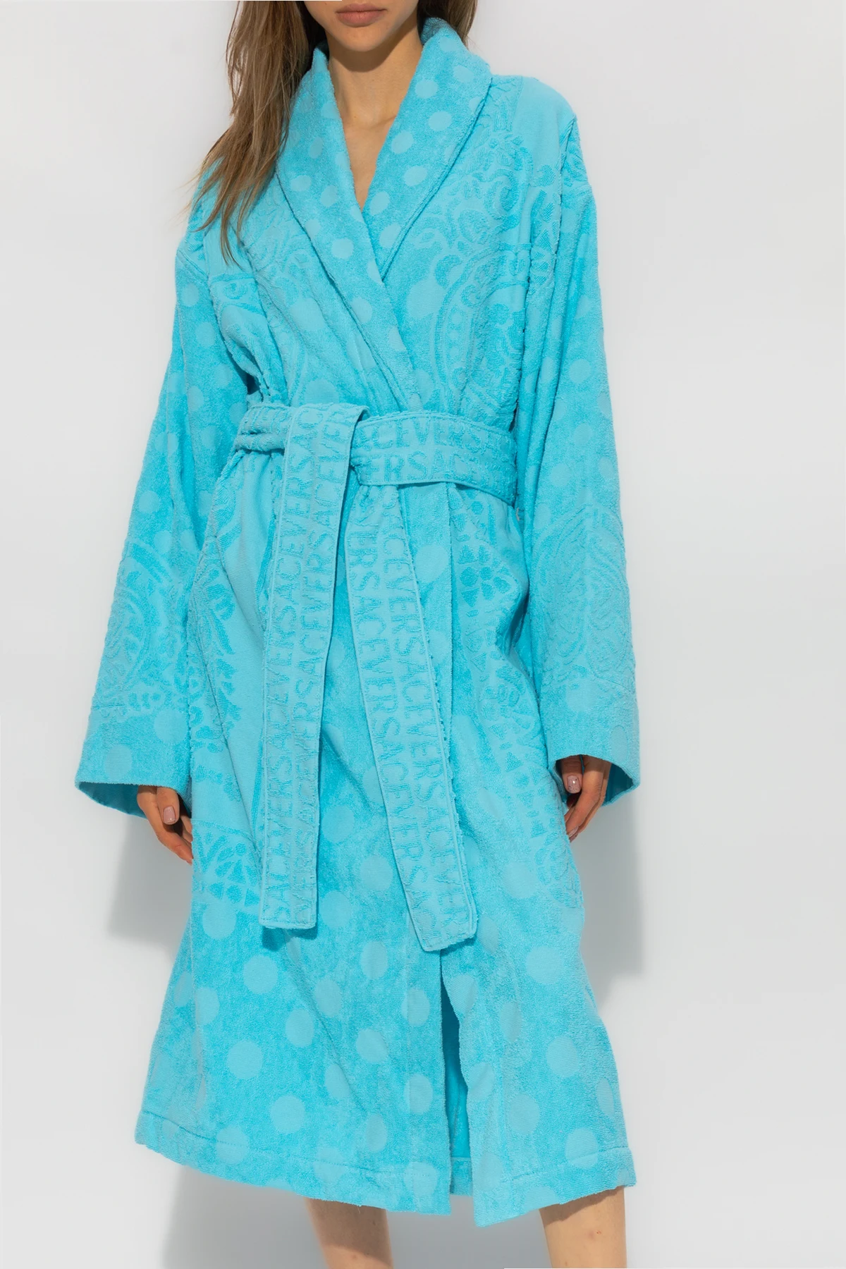 Jasnoniebieski, bawełniany szlafrok Versace Home. Wiązany paskiem. Ozdobiony wzorem w grochy i charakterystycznym motywem barokowym. Długie rękawy.