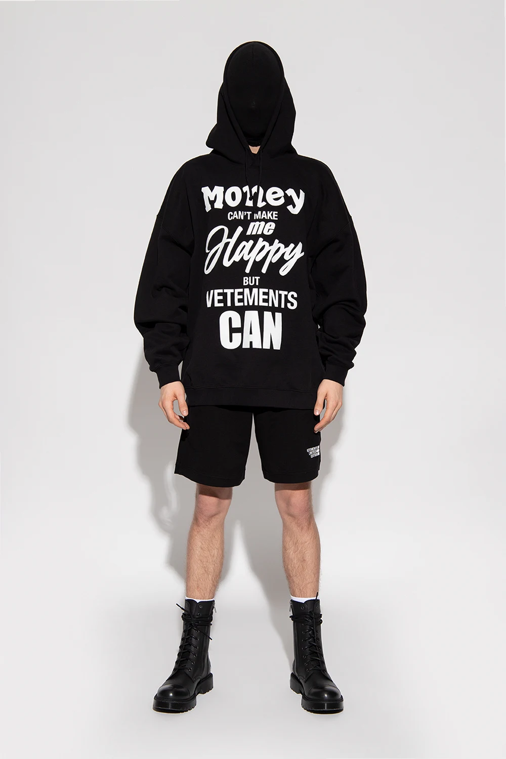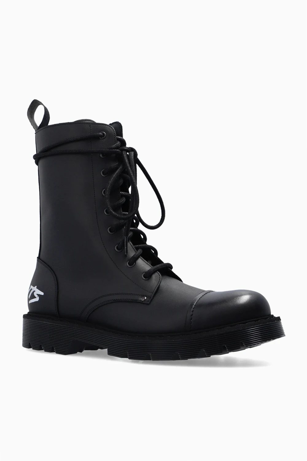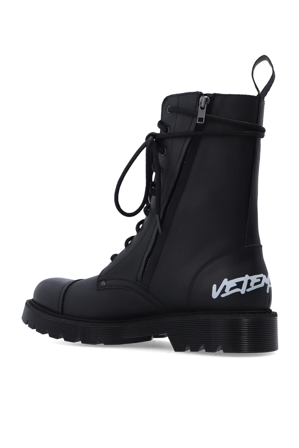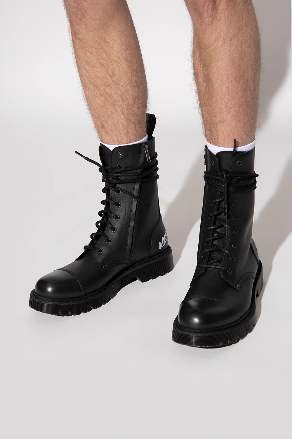 Czarne, sznurowane buty VETEMENTS. Wykonane ze skóry. Z boku zapinane na zamek. Z przodu przeszycie. Z tyłu nadrukowane białe logo. Czarna, gumowa podeszwa.