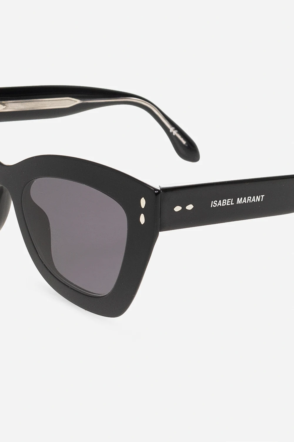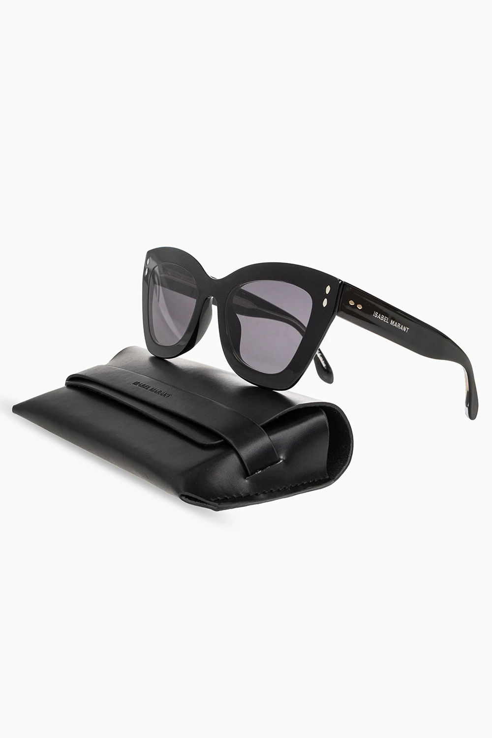 Czarne okulary przeciwsłoneczne, model ‘Louny’ Isabel Marant. Oprawki w kształcie kocich oczu wykonane z lśniącego acetatu i ozdobione aplikacjami w kolorze srebrnym. Szerokie zauszniki ozdobione logo. Szare, gradientowe szkła z 100% ochroną przed promieniami UV. Dołączone etui.
