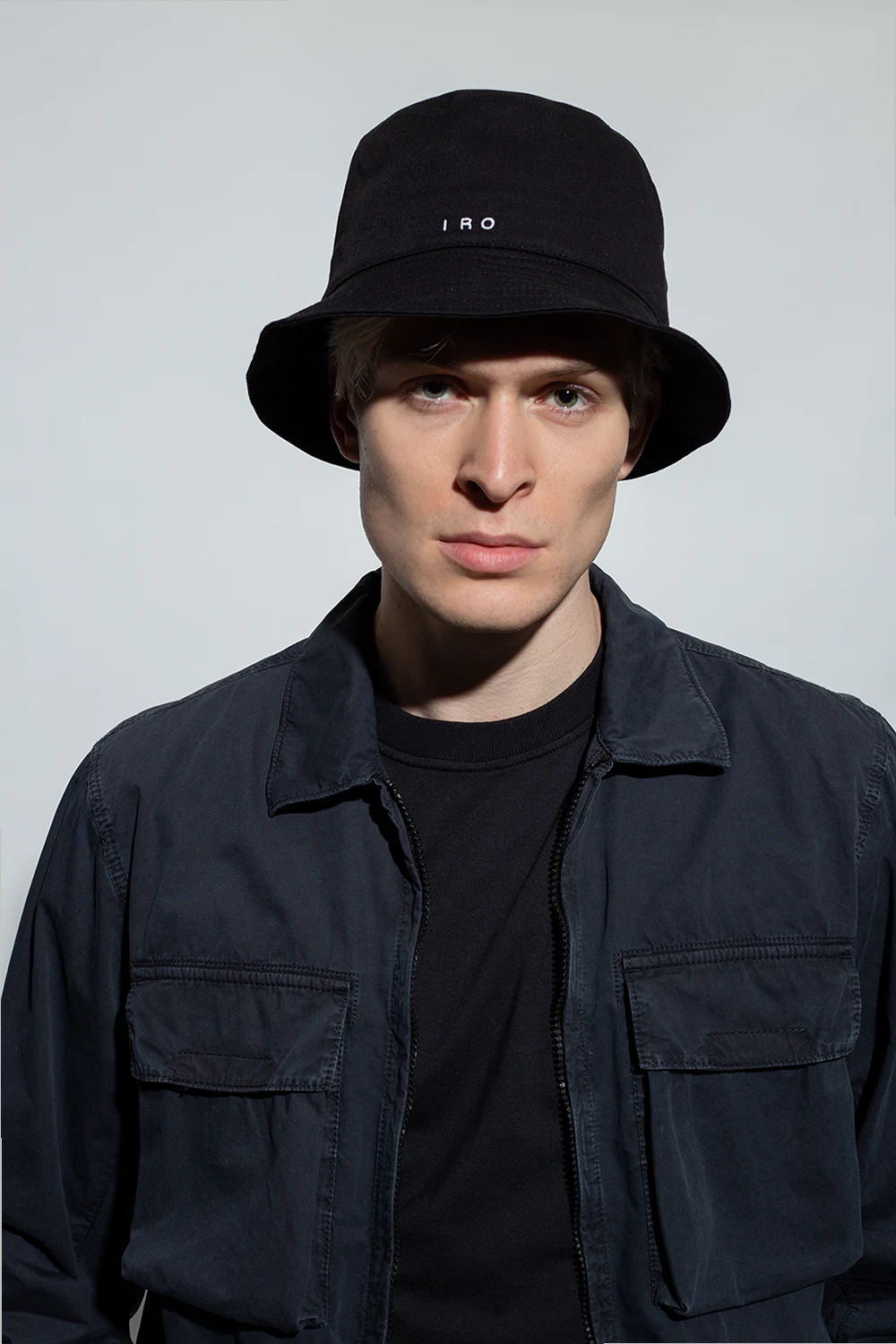 Czarny kapelusz Iro. Wykonany z bawełny. Ozdobiony wyszytym wzorem z logo w kolorze białym.