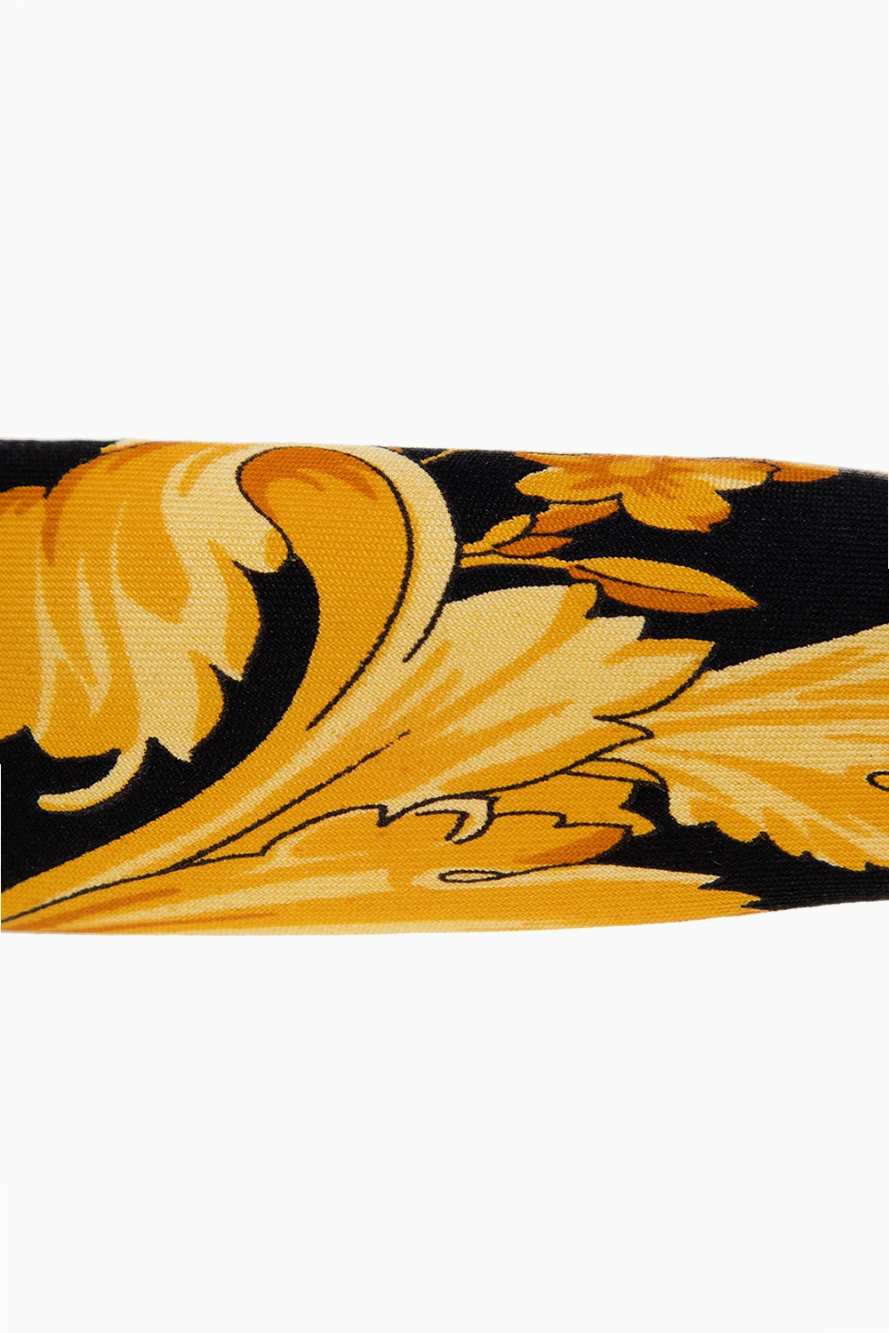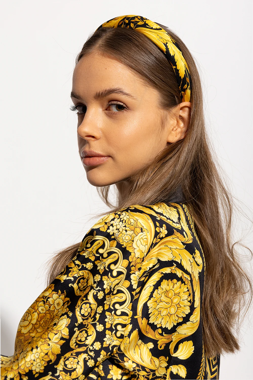 Czarna opaska na głowę Versace. Wykonana z jedwabiu. Ozdobiona charakterystycznym, żółto-brązowym wzorem ‘Barocco’.