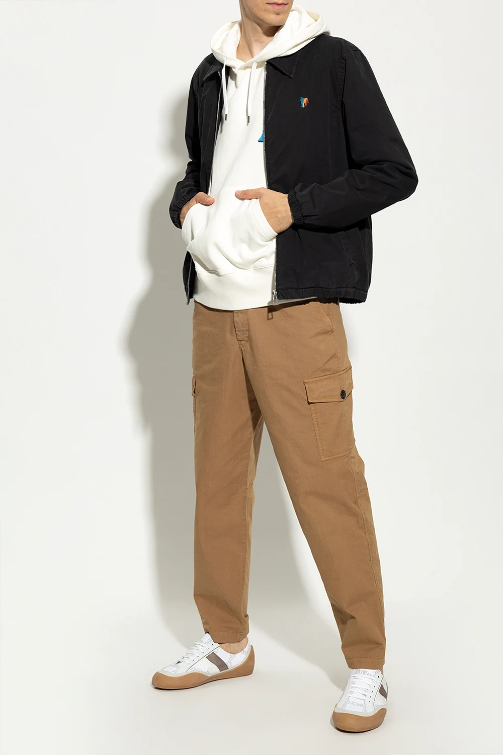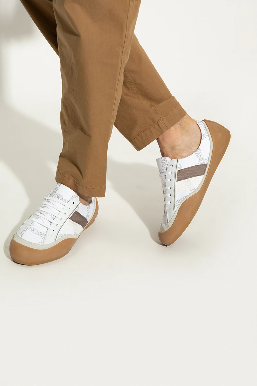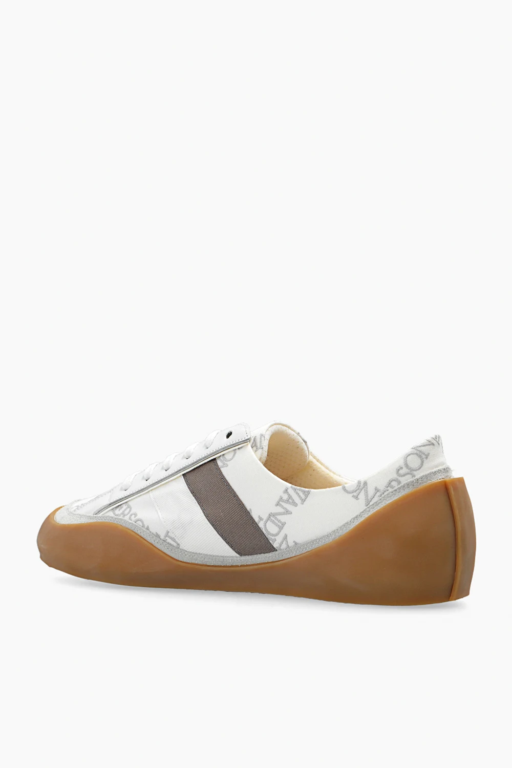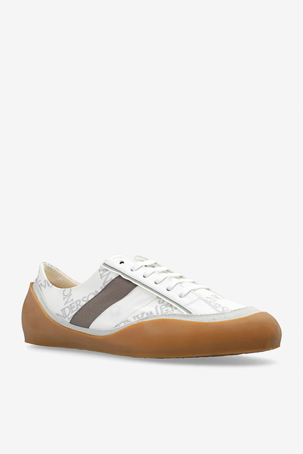 Biało-szaro-beżowe, sznurowane buty sportowe, model ‘Bubble’ JW Anderson. Wykonane z płótna i wykończone zamszem, skórą oraz gumą. Ozdobione wyszytym wzorem z logo. Profil z dwoma paskami w kolorze biało-brązowym. Beżowa, gumowa podeszwa.