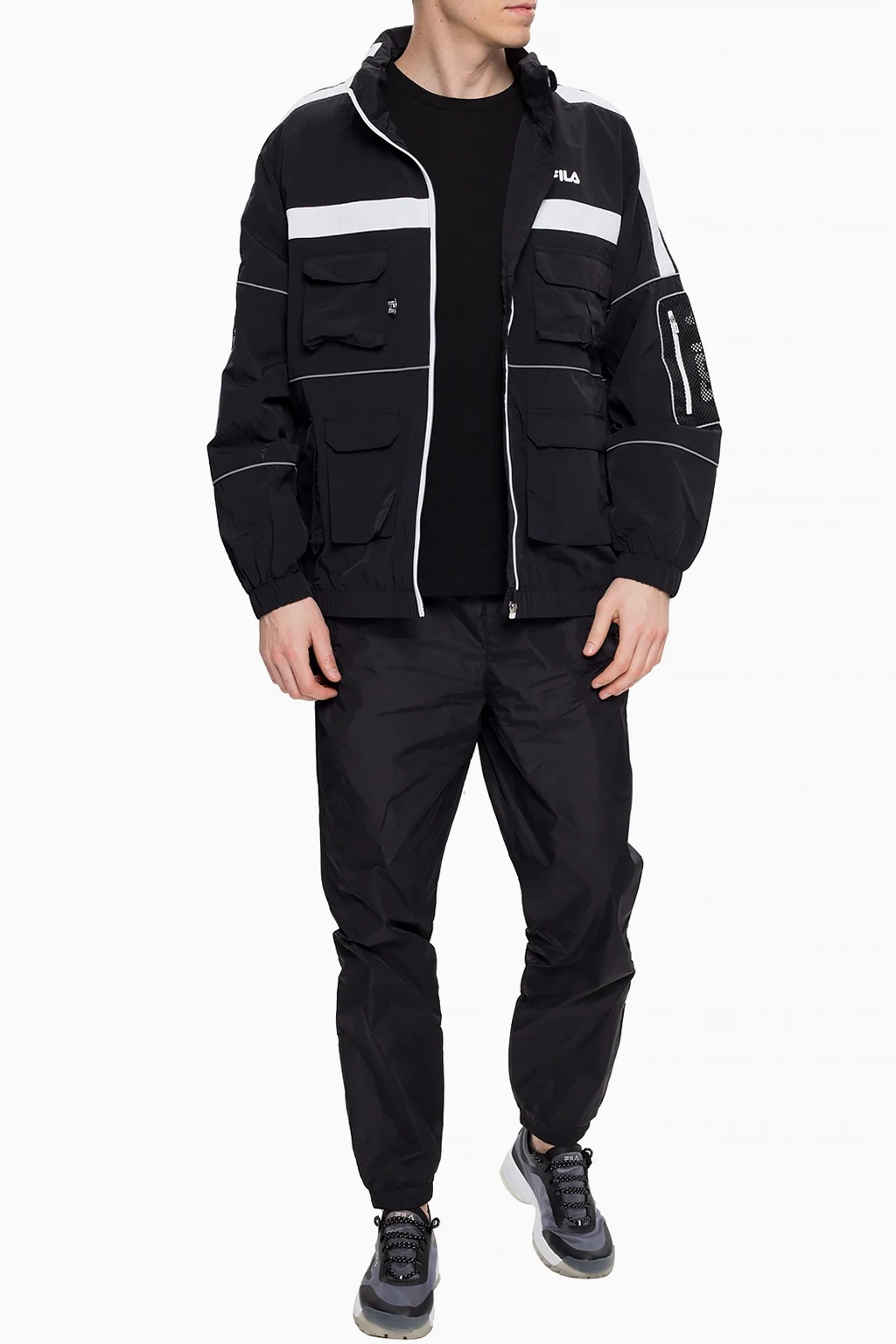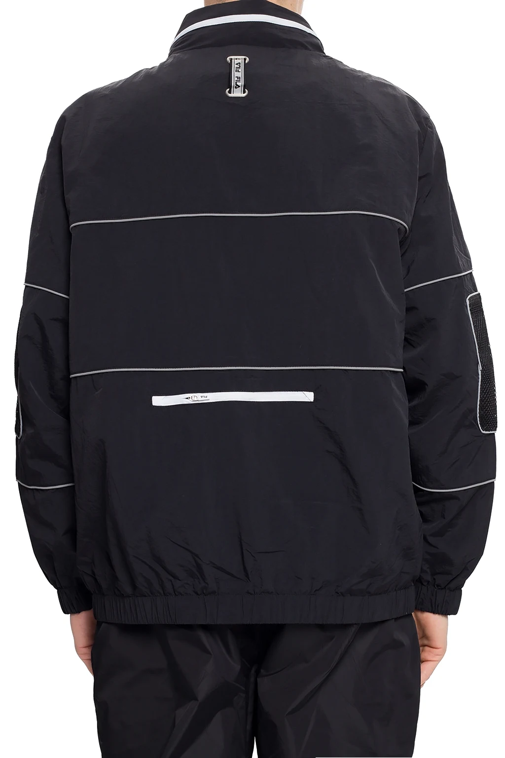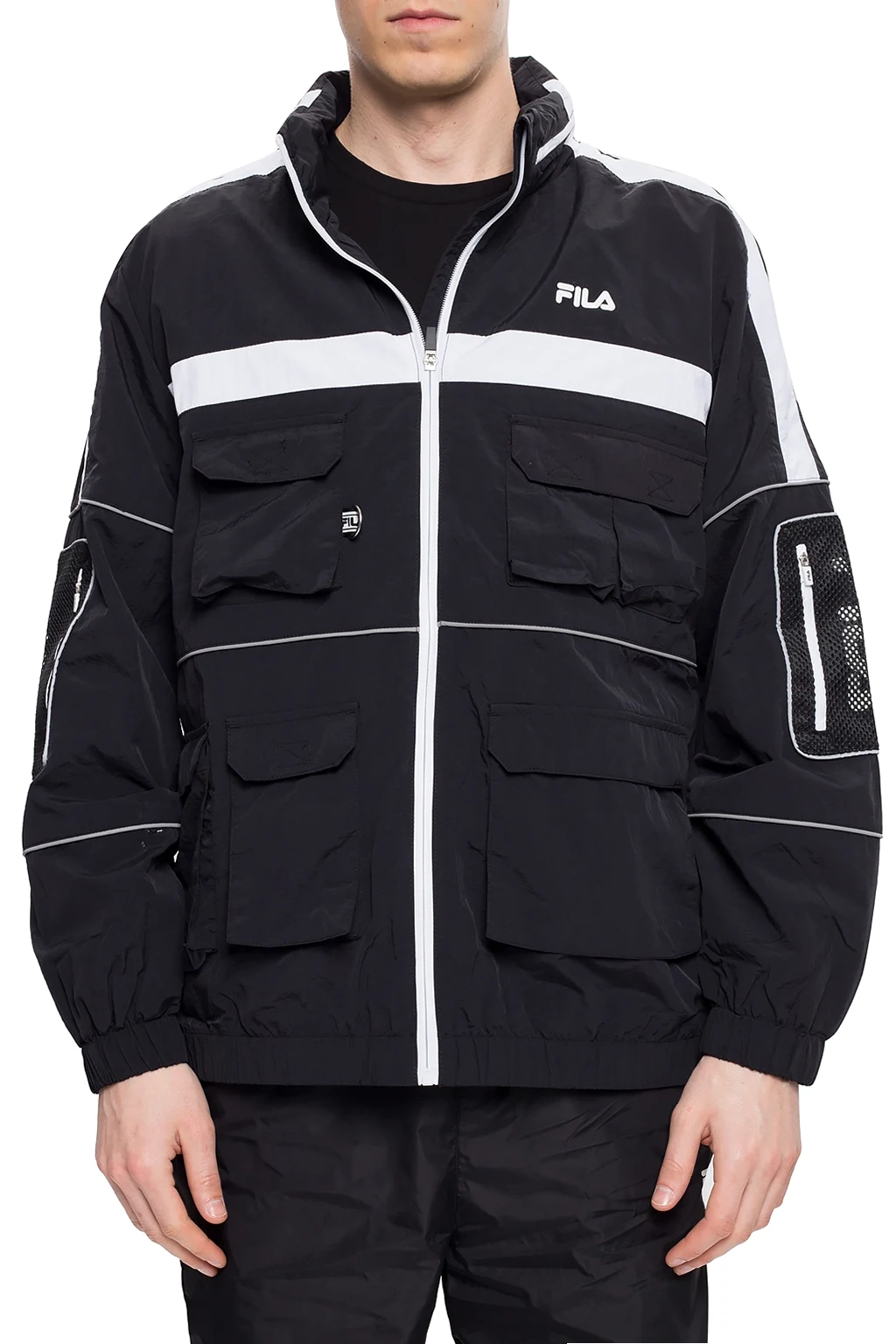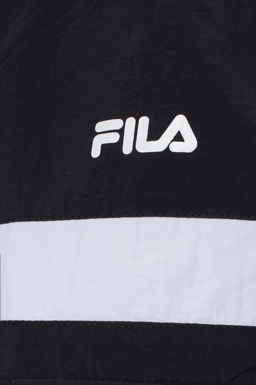 Czarno-biała kurtka Fila. Zapinana na zamek. Kaptur chowany w kołnierzu. Z przodu biały nadruk z logo. Cztery kieszenie z patkami zapinane na rzepy. Na rękawach dwie zapinane na zamek, jedna z tyłu. Odblaskowe elementy. Zakończona ściągaczami.