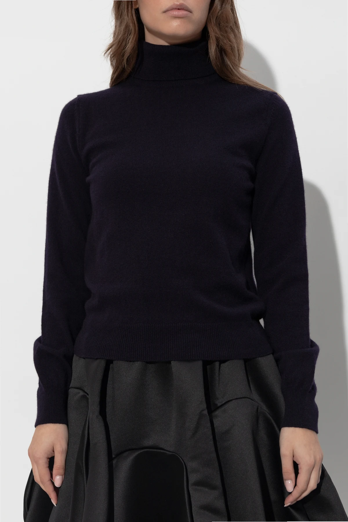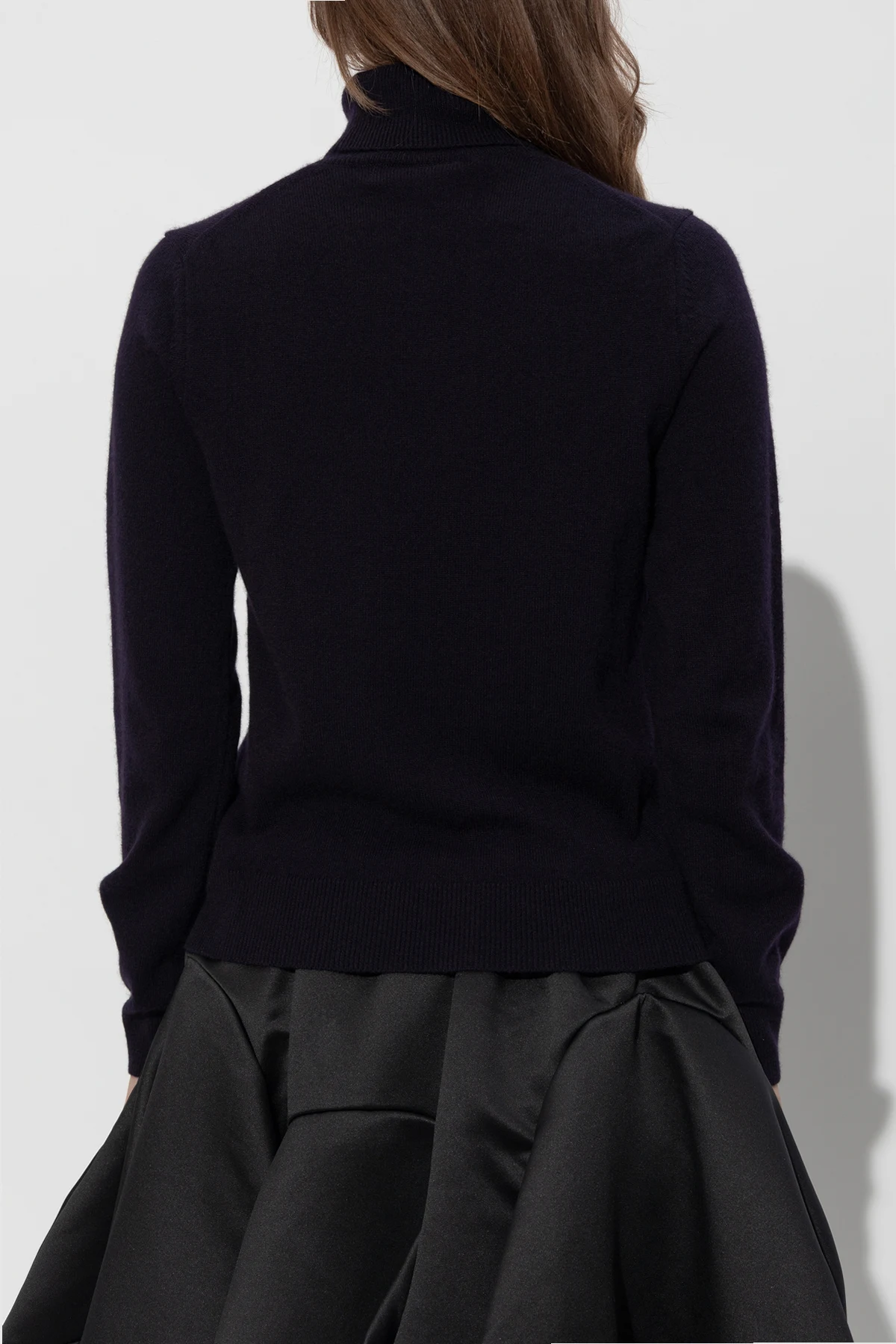 Golf prezentowany jest na modelce w różnych ujęciach: z przodu, z boku, z tyłu oraz w zbliżeniu na detale kołnierza. Na jednym ze zdjęć zestawiony z czarną spódnicą o nietypowym kroju, co dodatkowo ukazuje jego wszechstronność w stylizacjach.