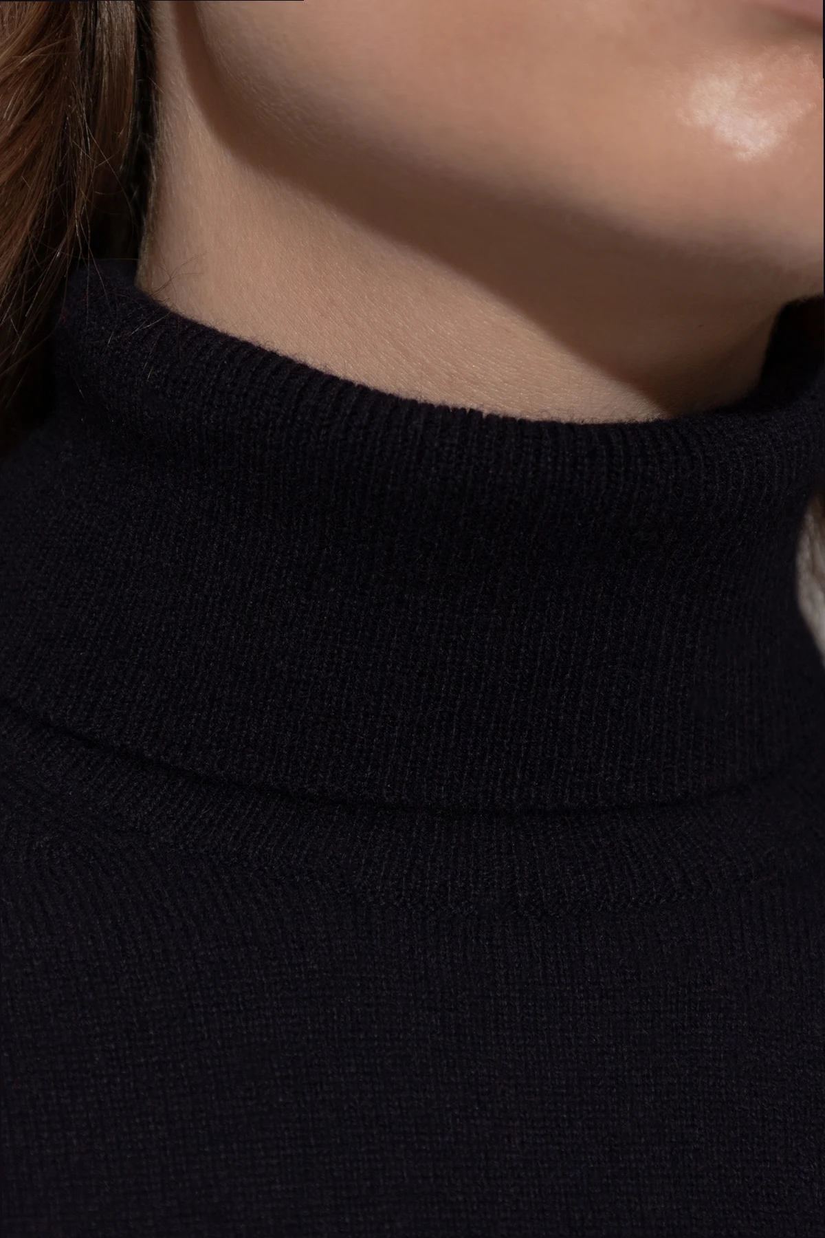 Granatowy kolor nadaje golfowi uniwersalności, czyniąc go doskonałym wyborem zarówno na formalne, jak i codzienne stylizacje. Dolny brzeg, mankiety rękawów oraz kołnierz zakończone są ściągaczami, co zapewnia lepsze dopasowanie i wygodę noszenia. Brak widocznych napisów czy logotypów projektanta podkreśla minimalistyczny styl tego wyrafinowanego elementu garderoby.