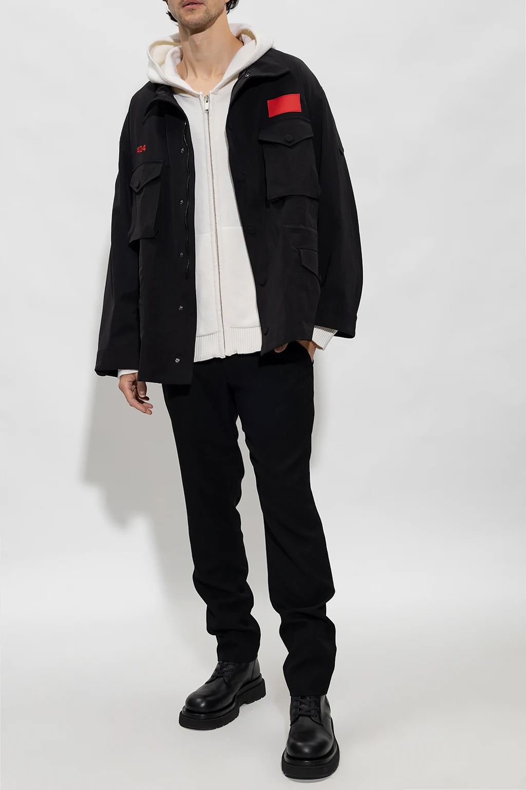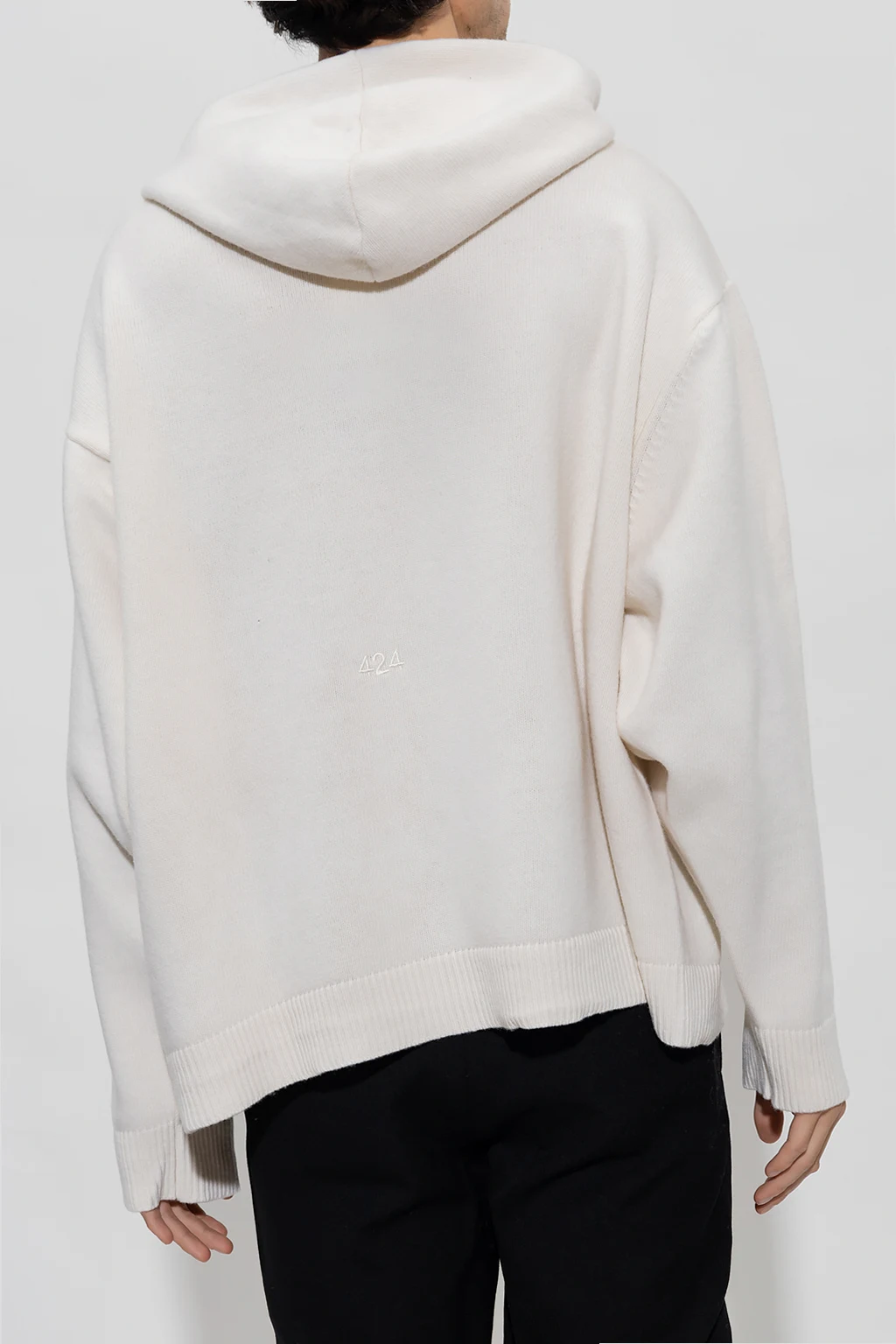 Kremowa bluza z kapturem 424. Wykonana z wełny. Zapinana na zamek. Z tyłu ozdobiona czerwoną naszywką i wyszytym logo. Dwie wsuwane kieszenie. Długie rękawy i dół zakończone ściągaczem.