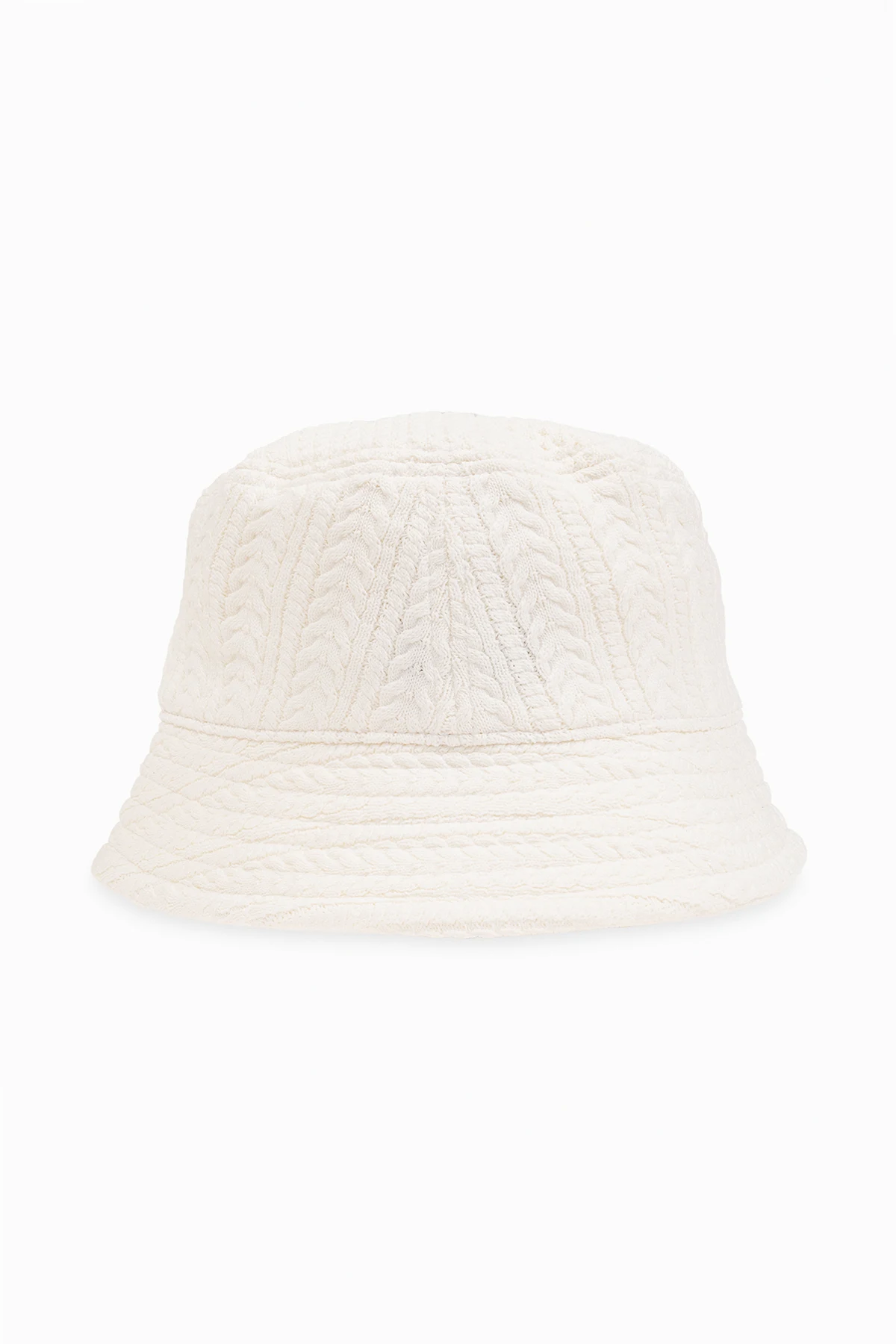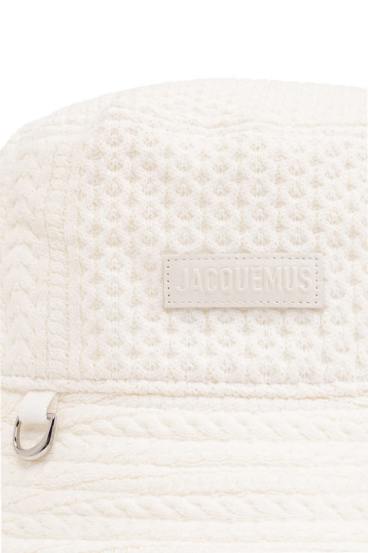Biały kapelusz typu ‘bucket’, model ‘Belo’ Jacquemus. Wykonany z dzianiny i ozdobiony dekoracyjnym ściegiem. Z przodu zawieszka w kolorze srebrnym i naszywka z logo.