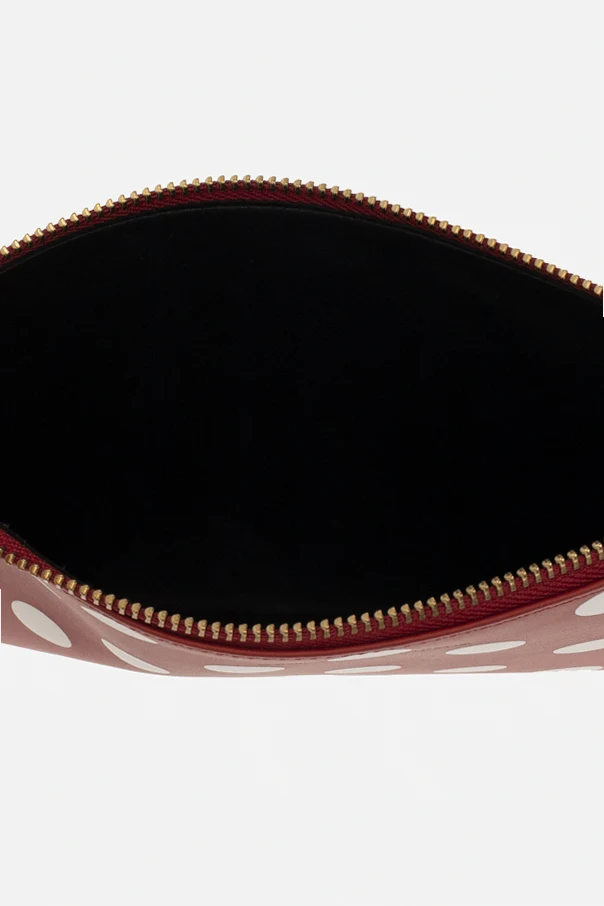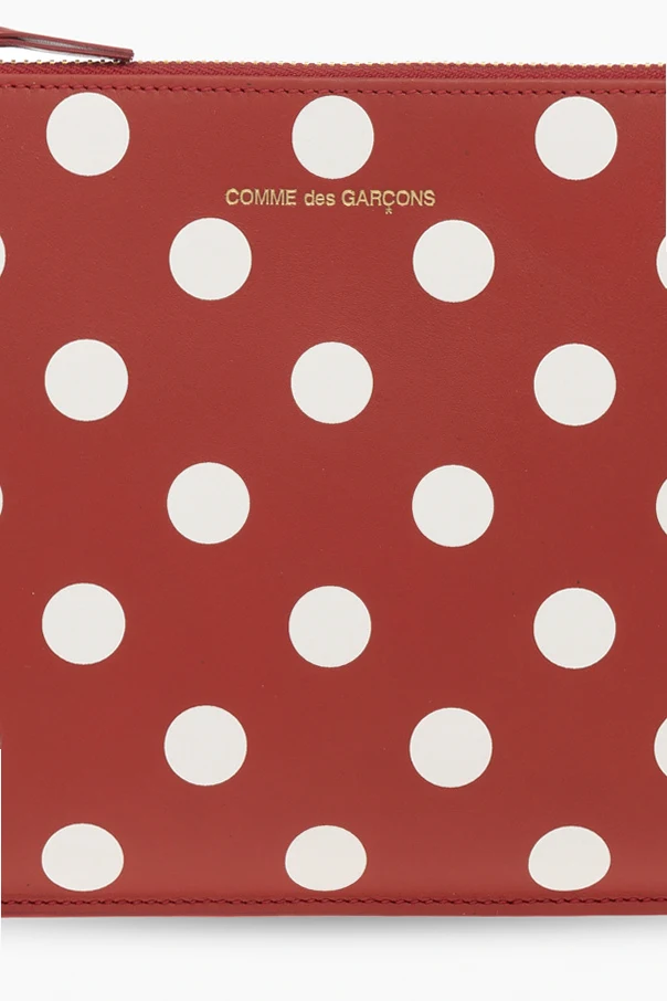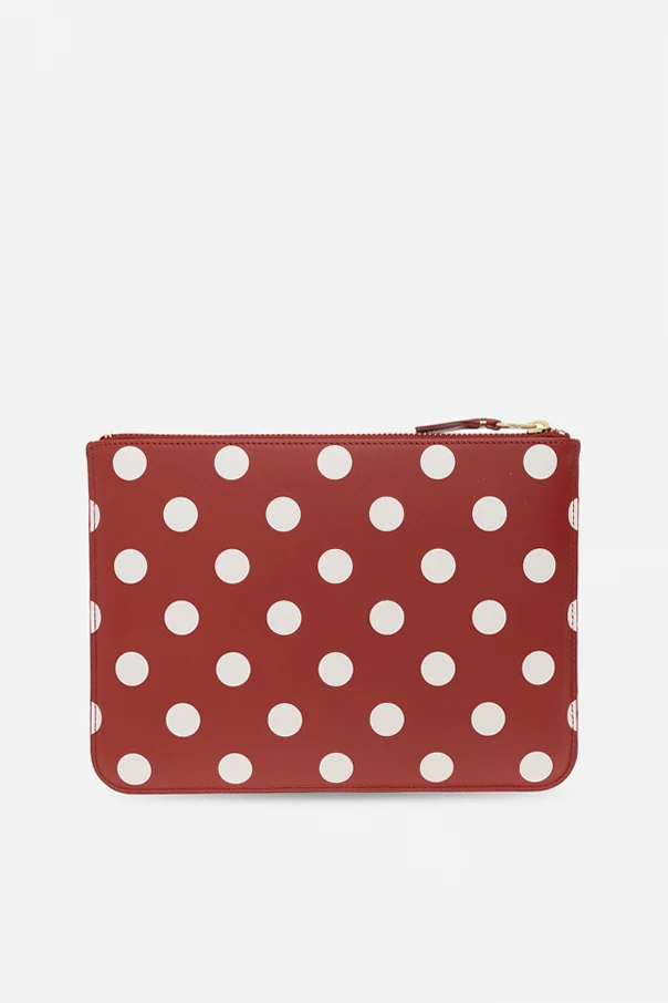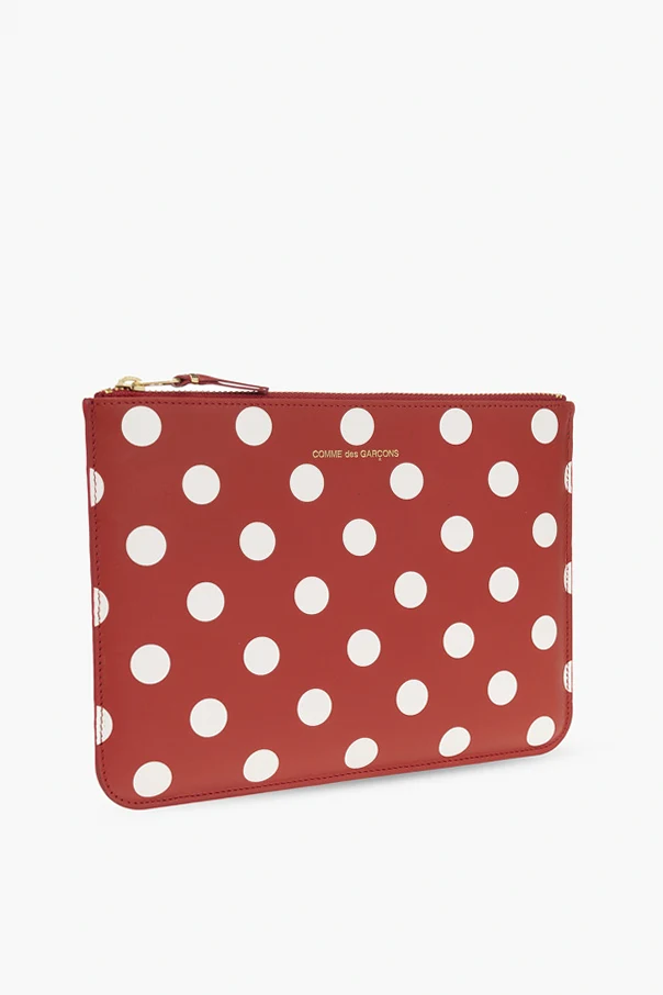Czerwona saszetka Comme des Garcons. Wykonana ze skóry. Zamykana na zamek. Ozdobiona wzorem w białe kropki oraz nadrukowanym logo w kolorze złotym. Wewnątrz komora.
