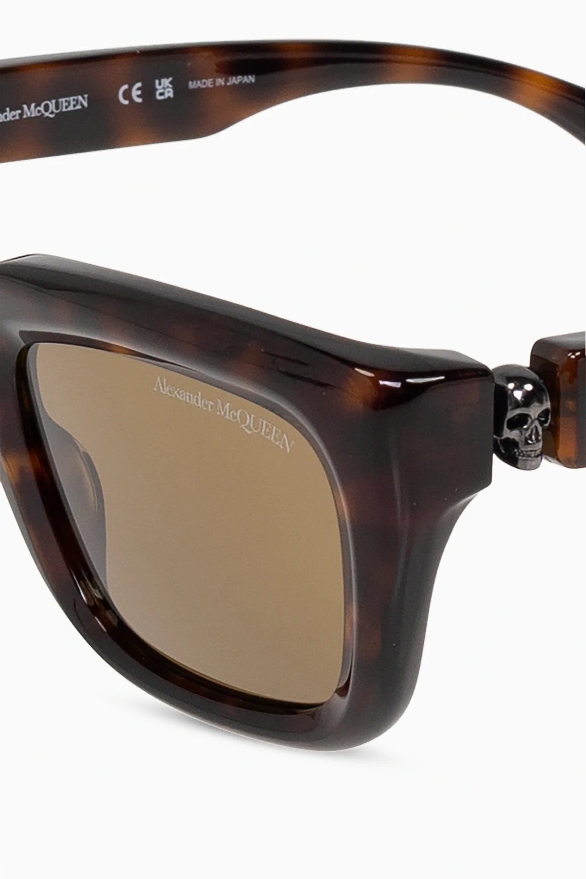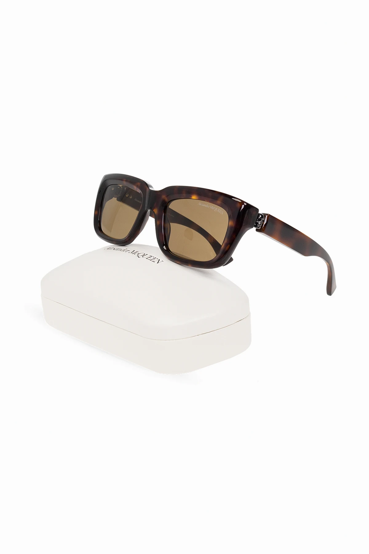 Brązowe, szylkretowe okulary przeciwsłoneczne Alexander McQueen. Wykonane z tworzywa pozyskanego z recyklingu. Prostokątne oprawki z pojedynczym mostkiem i zintegrowanymi noskami. Zauszniki z dekoracyjnymi zawiasami w kształcie charakterystycznej dla marki czaszki. Brązowe szkła ze 100% ochroną przed promieniami UV i wygrawerowanym logo. Dołączone etui.