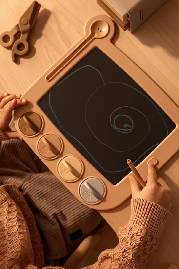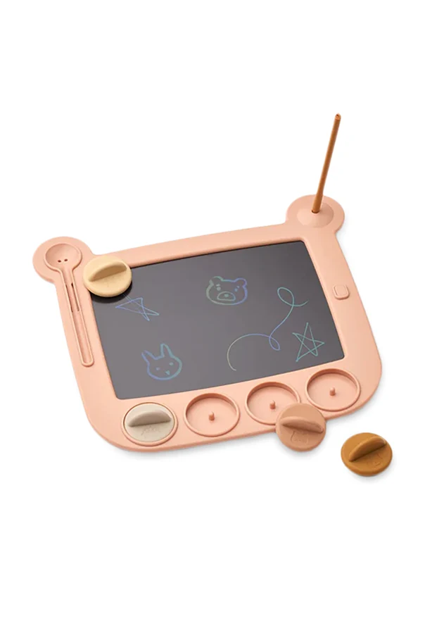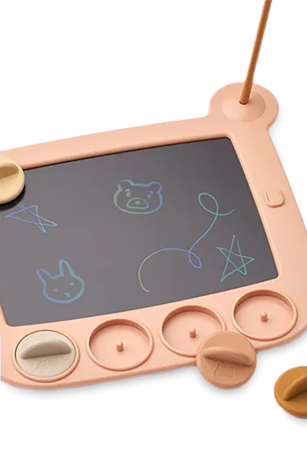 Tablica do rysowania Venzora marki Liewood zachwyca nowoczesną estetyką i starannie przemyślanymi detalami. Prostokątna forma z łagodnie zaokrąglonymi rogami oraz urokliwymi, zabawnie wystylizowanymi „uszami” w górnej części sprawia, że produkt emanuje subtelną, dziecięcą elegancją. Ramka w pastelowo-różowym odcieniu, zestawiona ze złotymi i beżowymi akcentami przycisków, podkreśla wyrafinowanie oraz wyjątkowość konstrukcji.