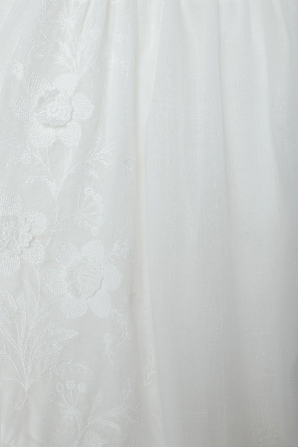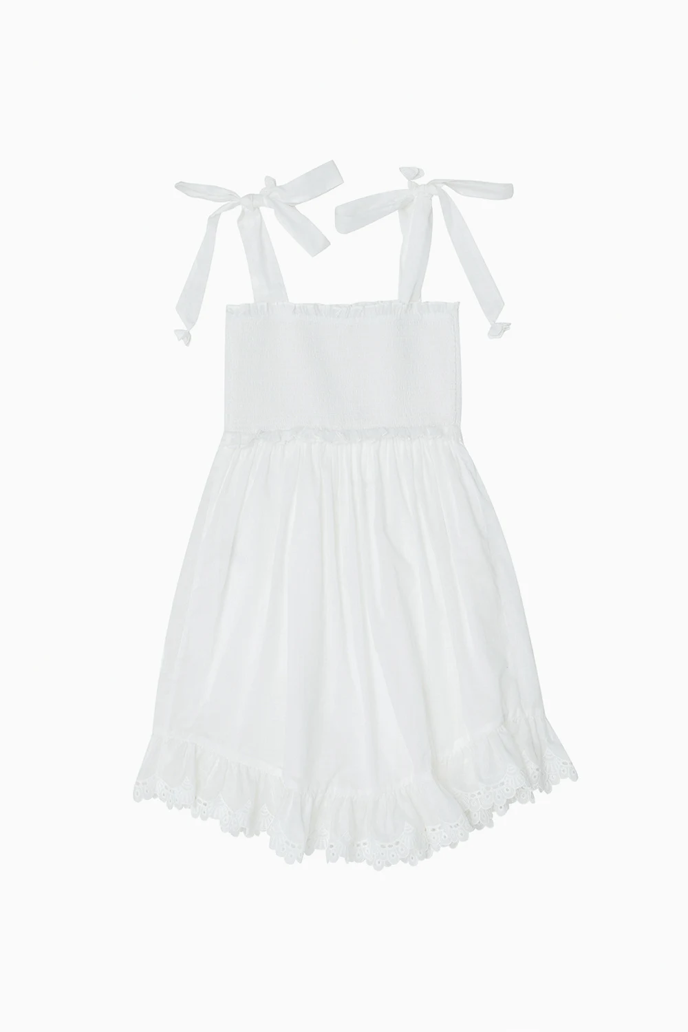 Biała, bawełniana sukienka Zimmermann Kids. U góry wszyta guma. Ramiączka z dekoracyjnymi kokardami. Ozdobiona wyszytym wzorem z motywem kwiatowym. Dół wykończony falbaną.
