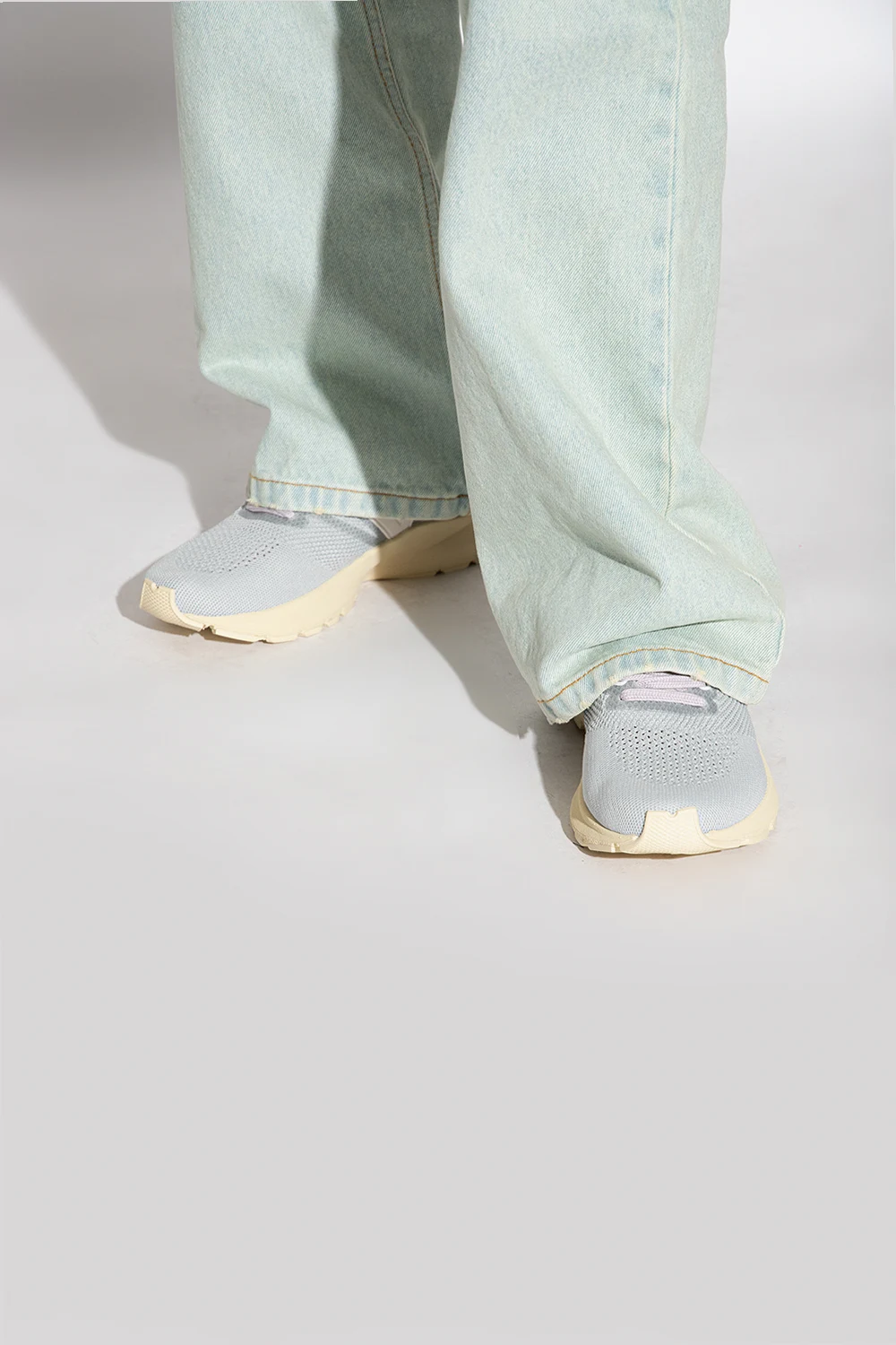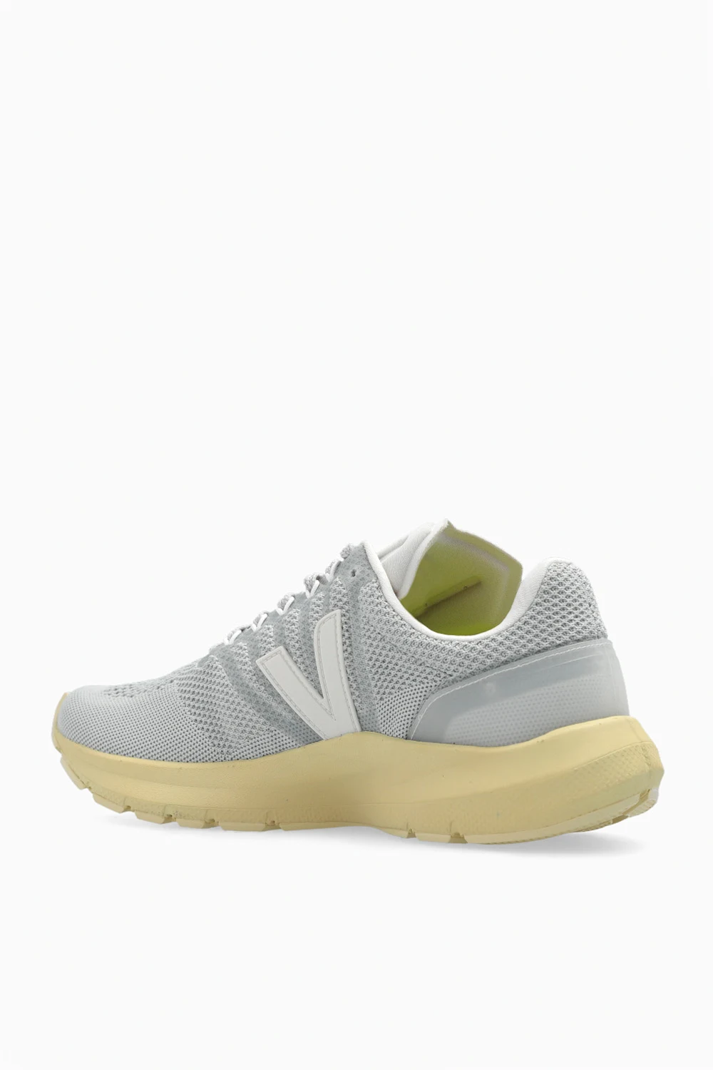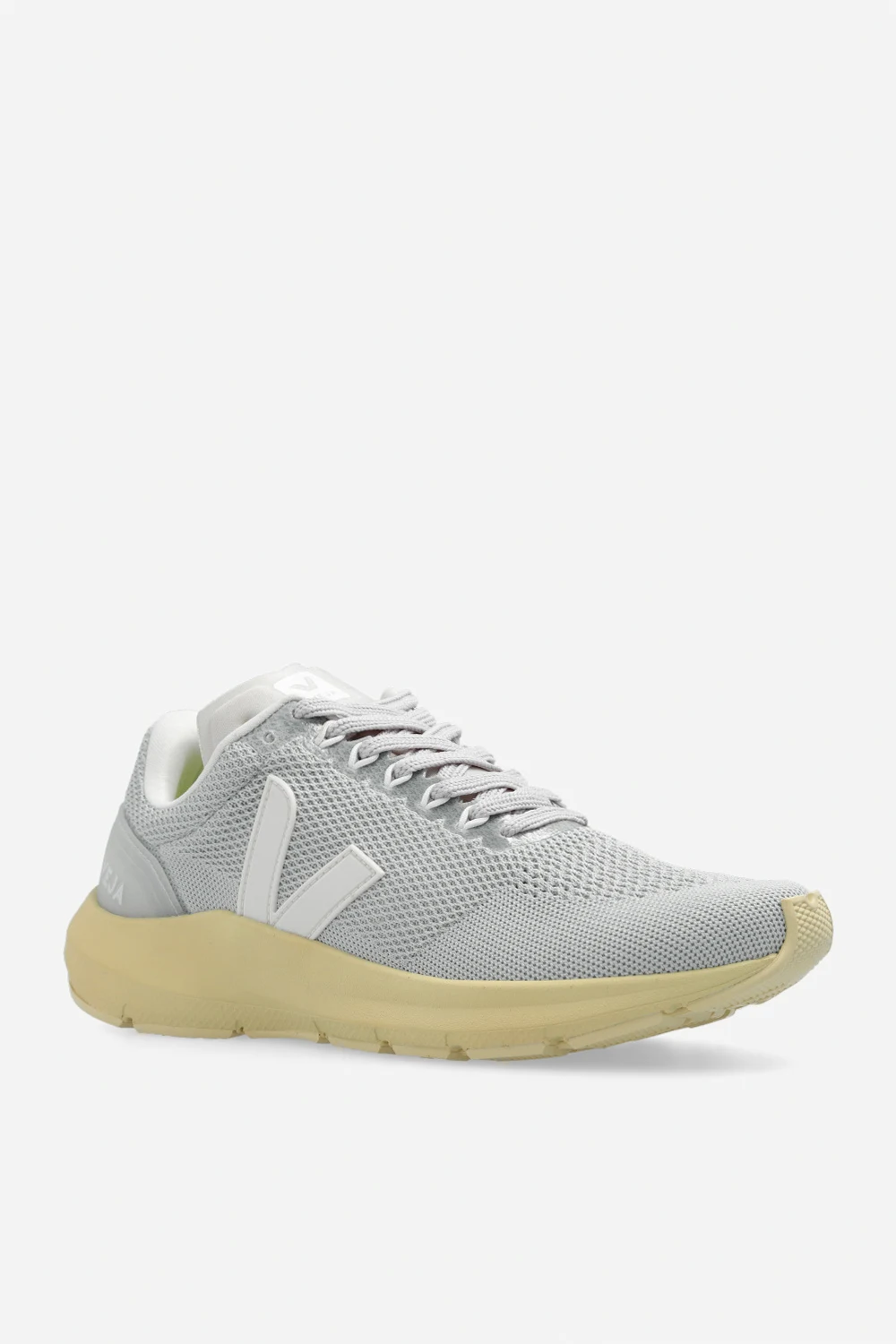 Jasnoniebiesko-kremowo-fioletowo-szare, sznurowane buty sportowe, model ‘MARLIN LT V-KNIT’ Veja. Wykonane z materiału, Ozdobione aplikacją z logo. Kremowa, gumowa podeszwa.