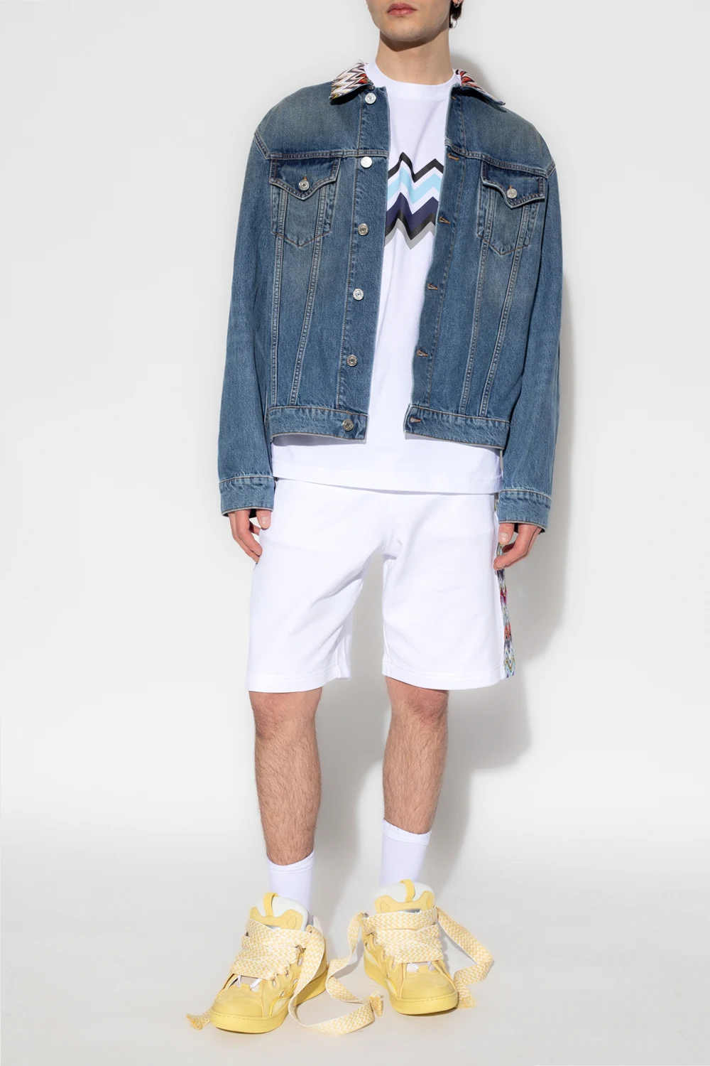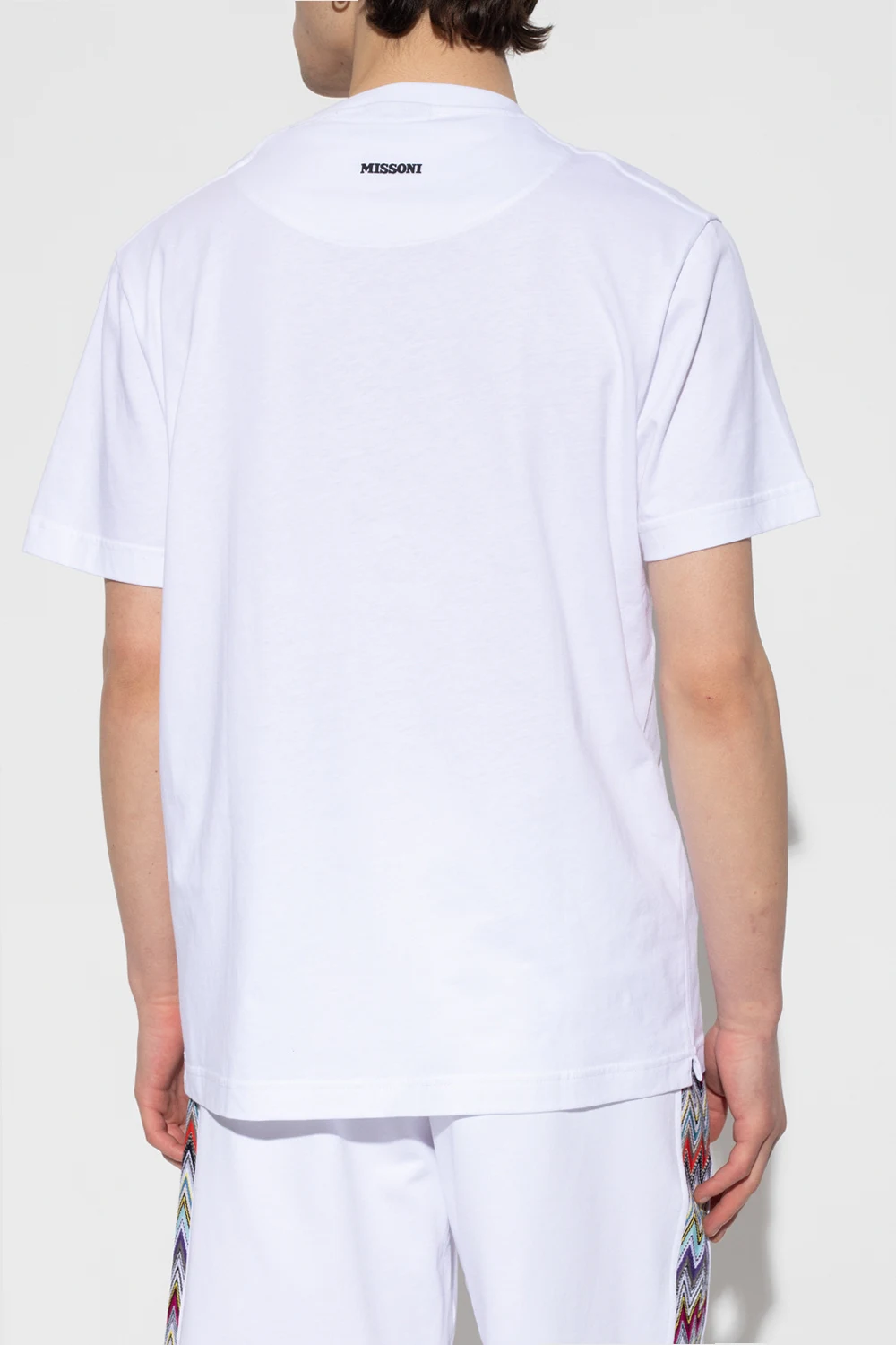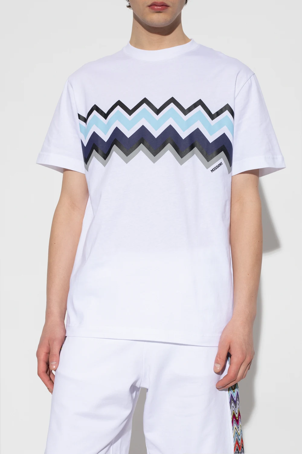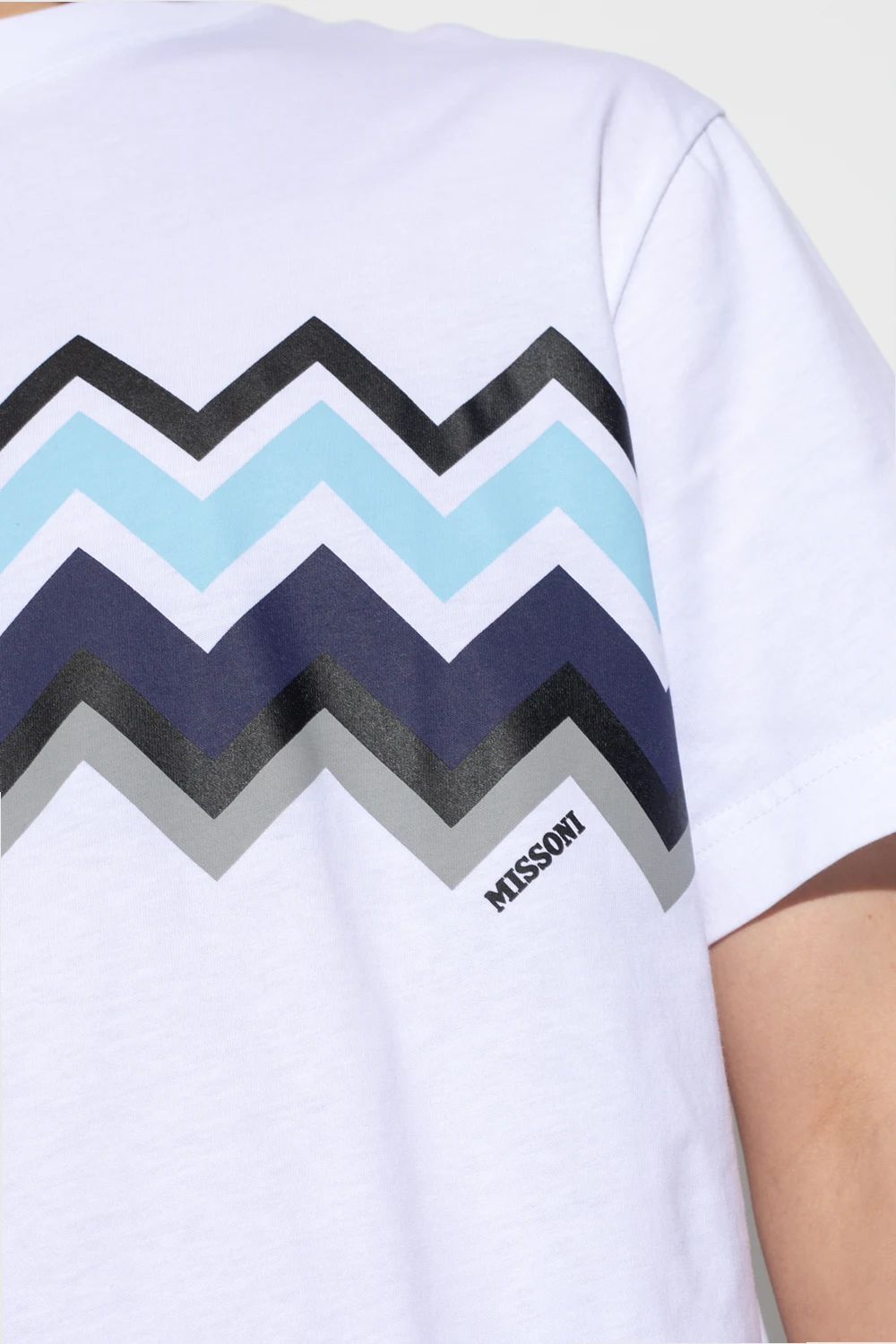 Biały, bawełniany t-shirt Missoni. Z przodu ozdobiony niebiesko-czarno-szarym nadrukiem z motywem charakterystycznych dla marki zygzaków. Ozdobiony logo w kolorze czarnym. Okrągły dekolt wykończony ściągaczem, krótkie rękawy.
