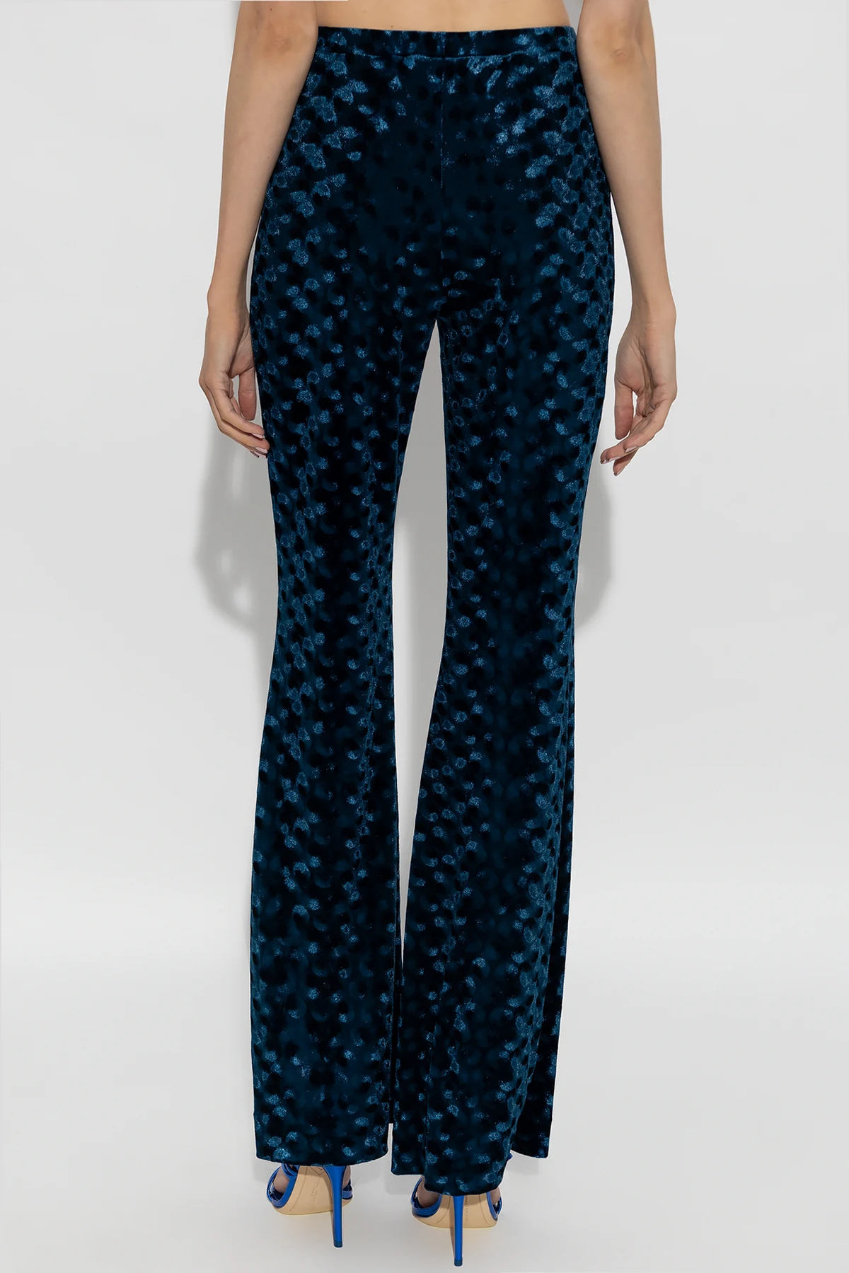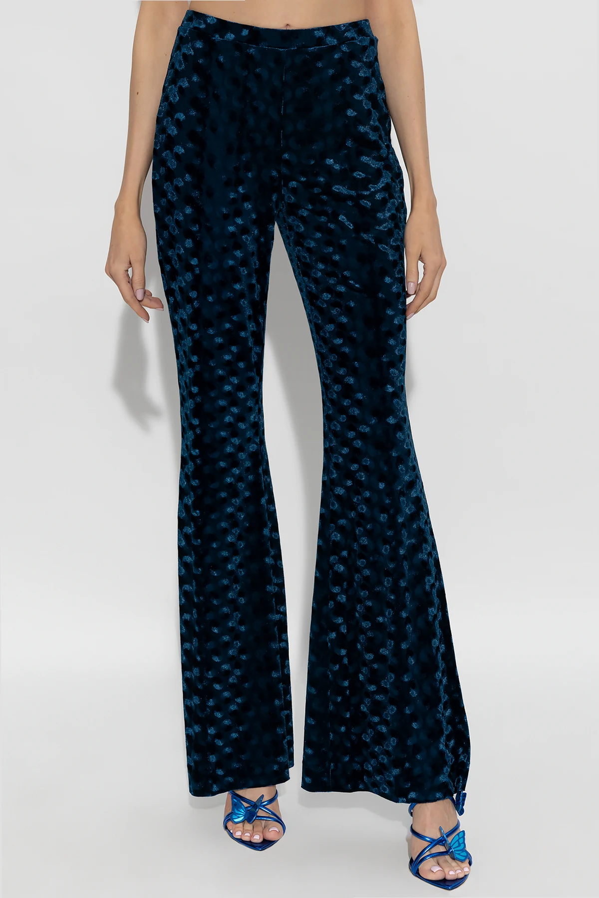 Granatowe, aksamitne spodnie Diane Von Furstenberg. W pasie wszyta guma. Ozdobione wzorem w grochy. Rozszerzane nogawki.