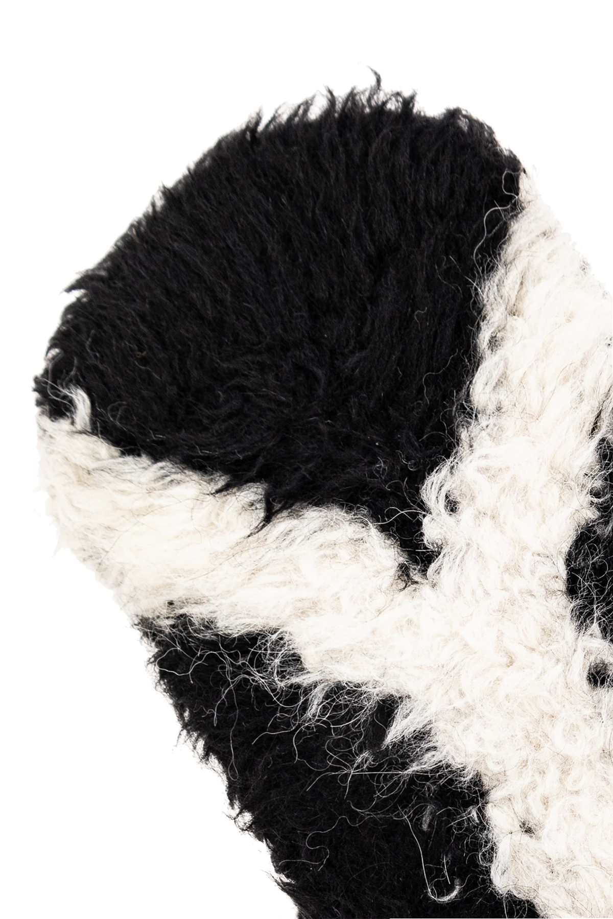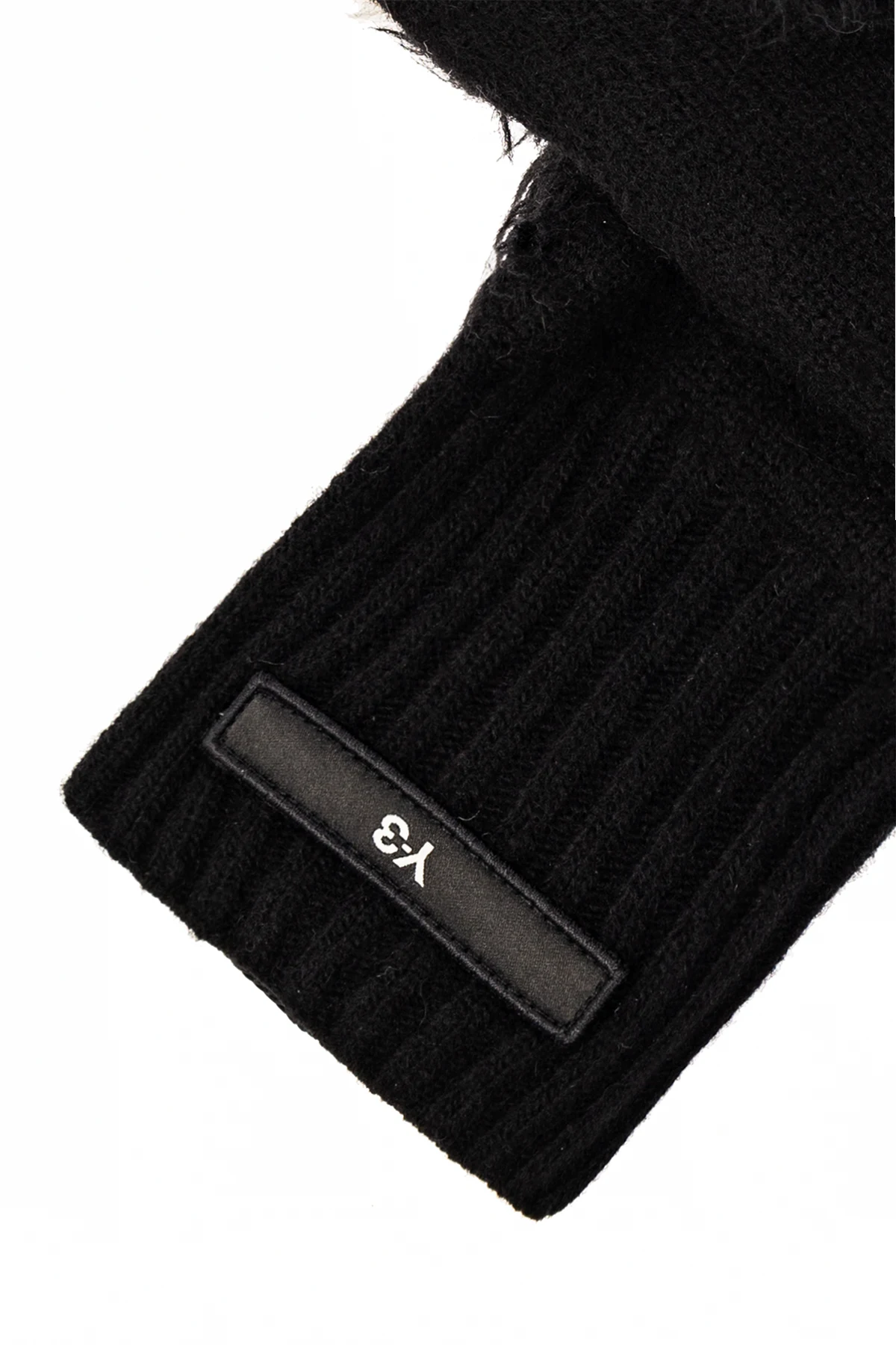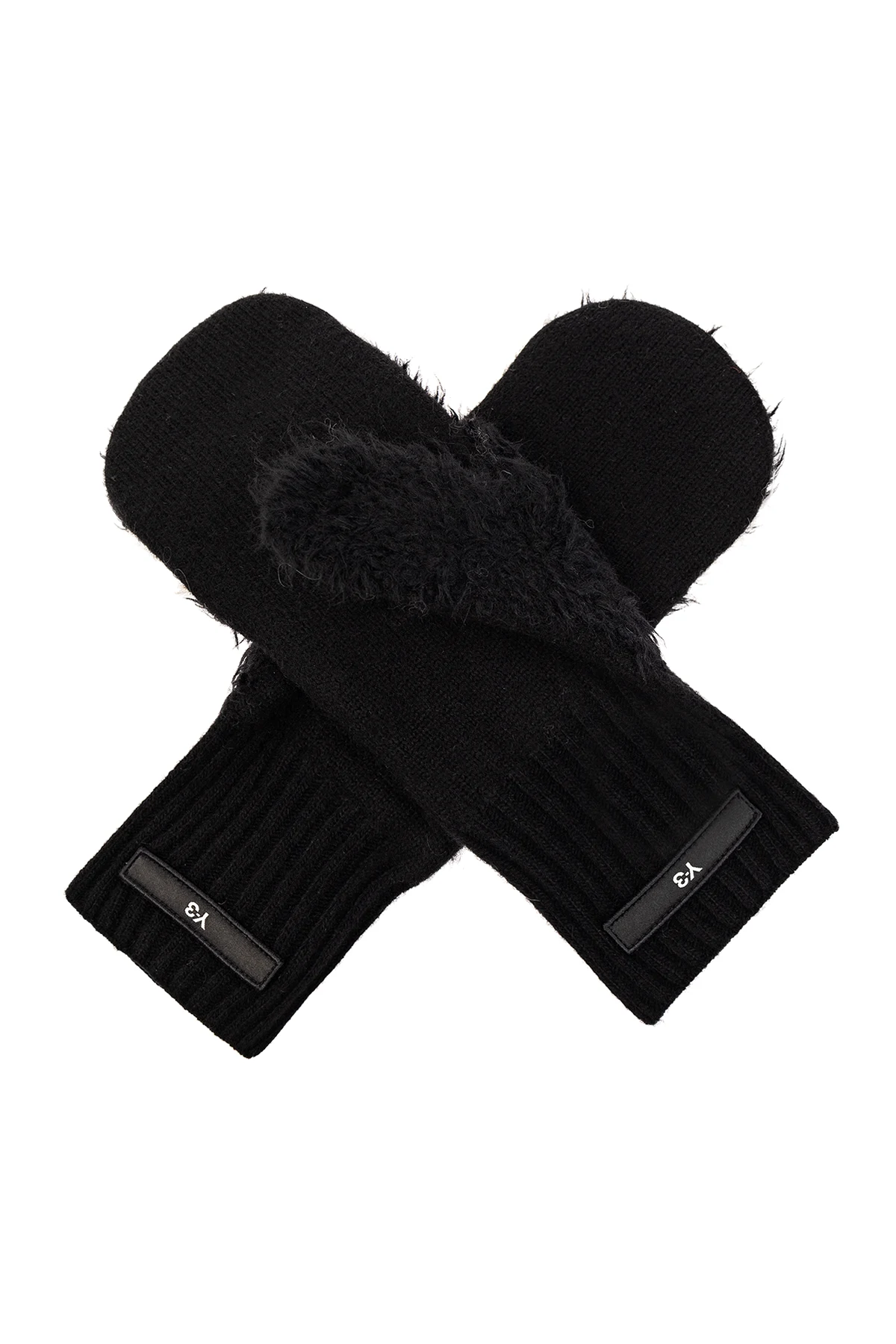 Czarne rękawiczki Y-3 Yohji Yamamoto. Wykonane częściowo z wełny. Ozdobione logo w kolorze białym. Ozdobione naszywką. Wykończone ściągaczem.