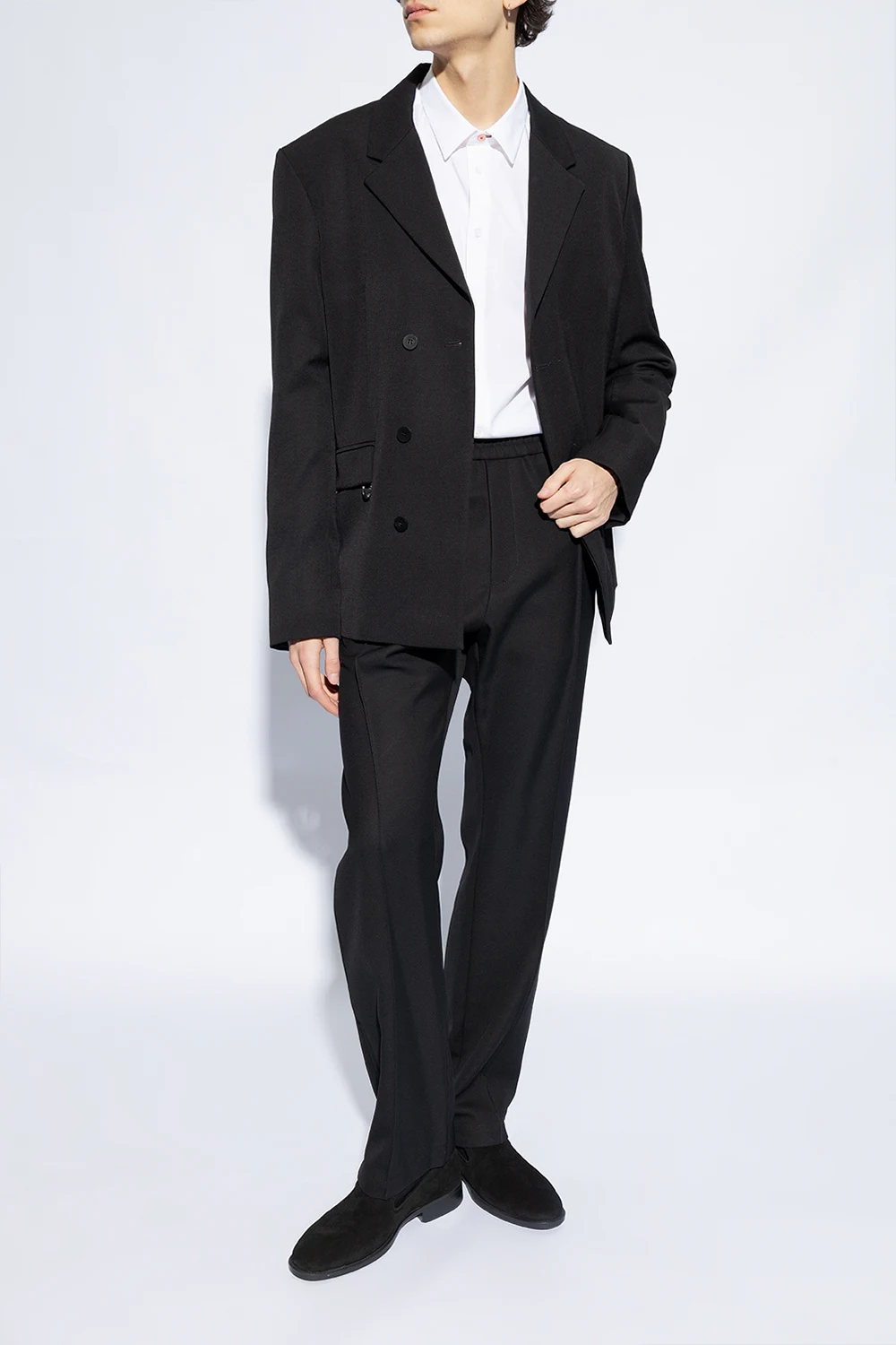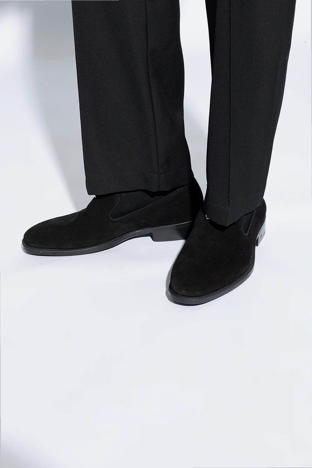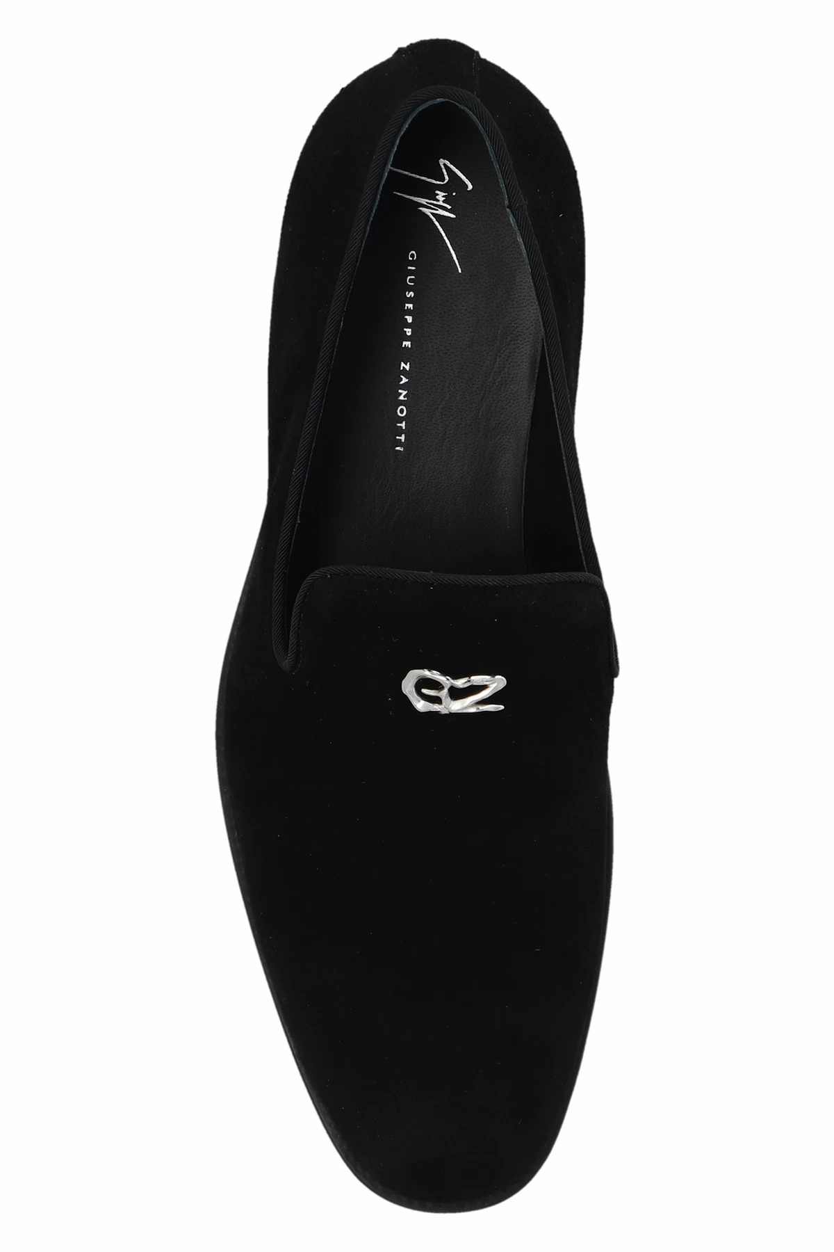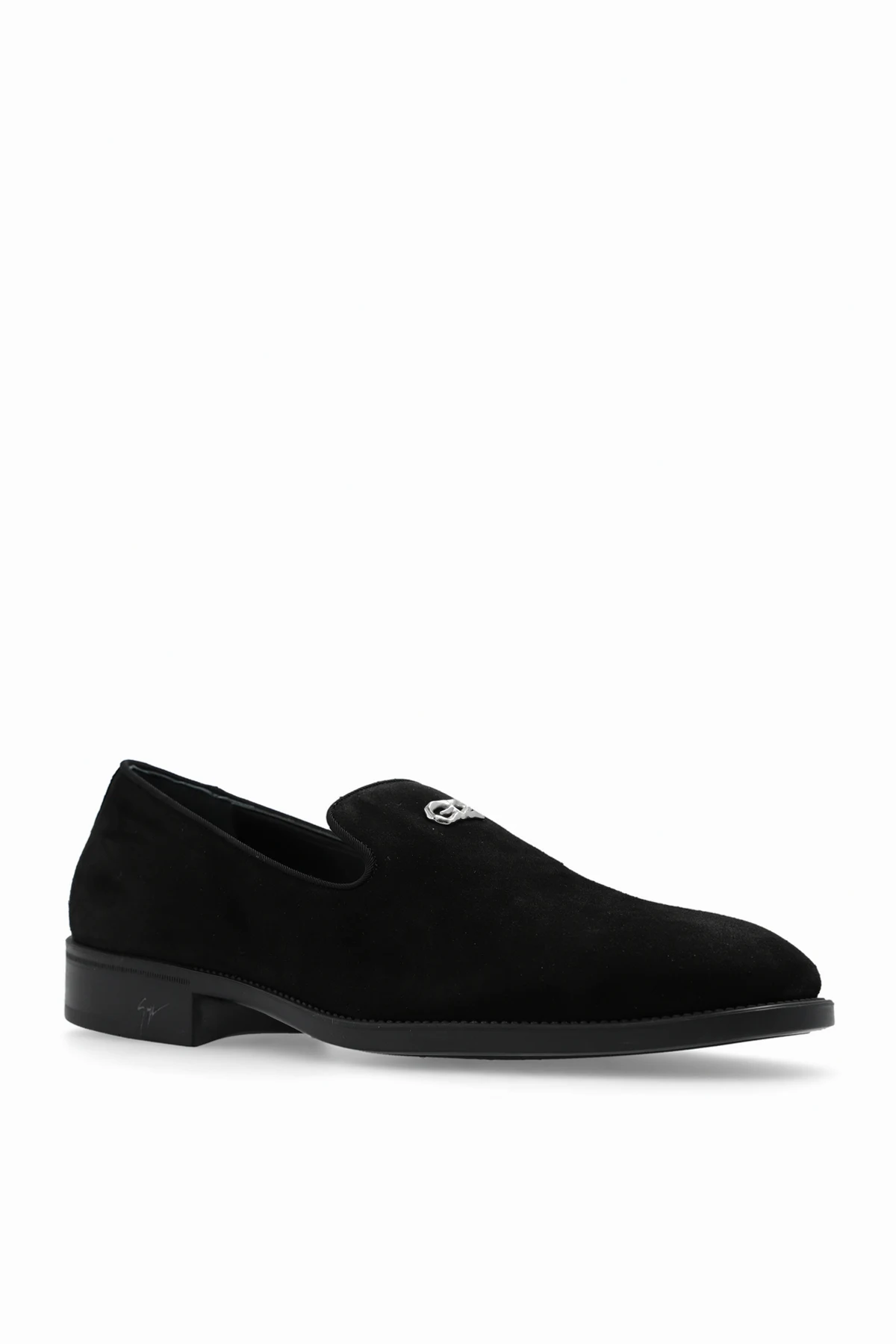 Czarne buty typu ‘loafers’, model ‘Imrham’ Giuseppe Zanotti. Wykonane z zamszu. Z przodu ozdobione metalową aplikacją w kształcie logo w kolorze srebrnym. Czarna, gumowa podeszwa.