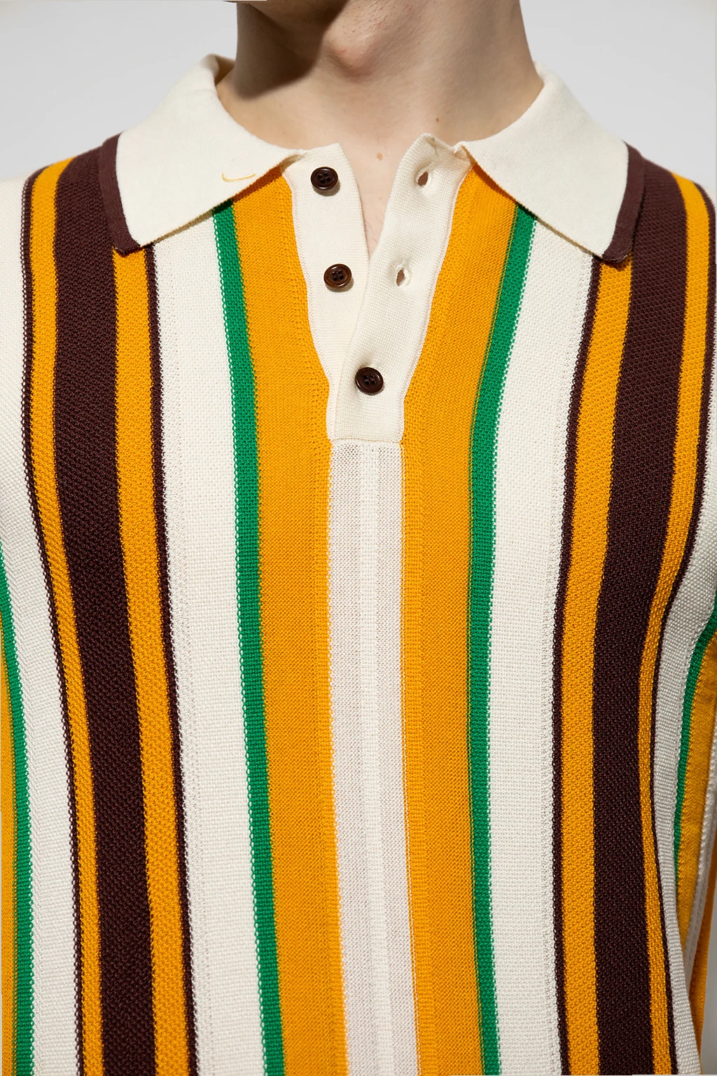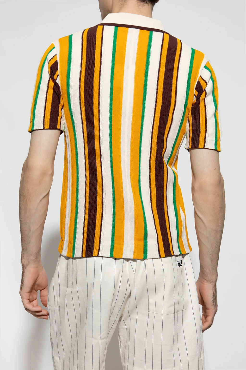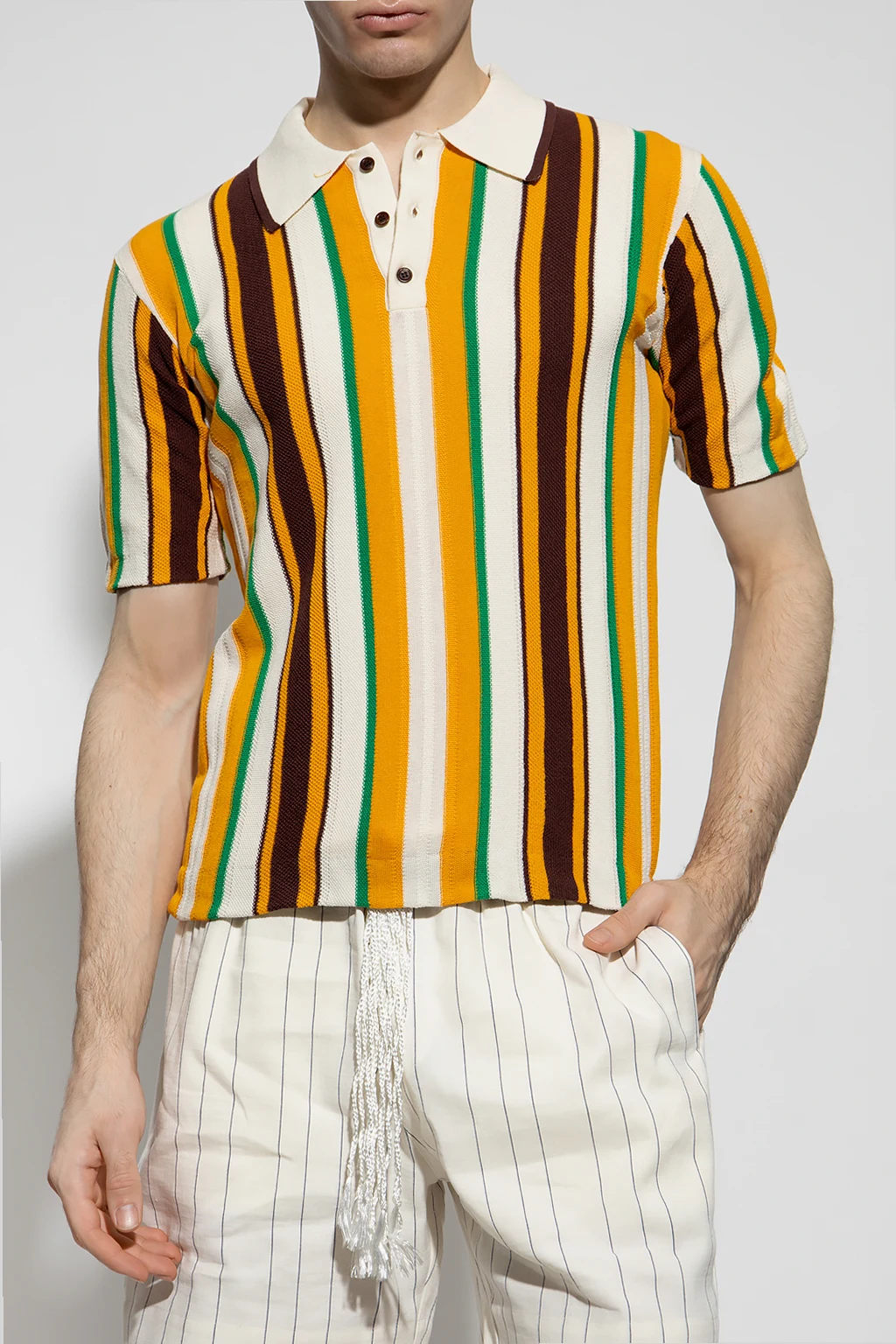 Kolorowe polo, model ‘Optimist’ Wales Bonner. Wykonane z bawełny. Pod szyją zapinane na guziki. Ozdobione pionowym wzorem w pasy. Krótkie rękawy.