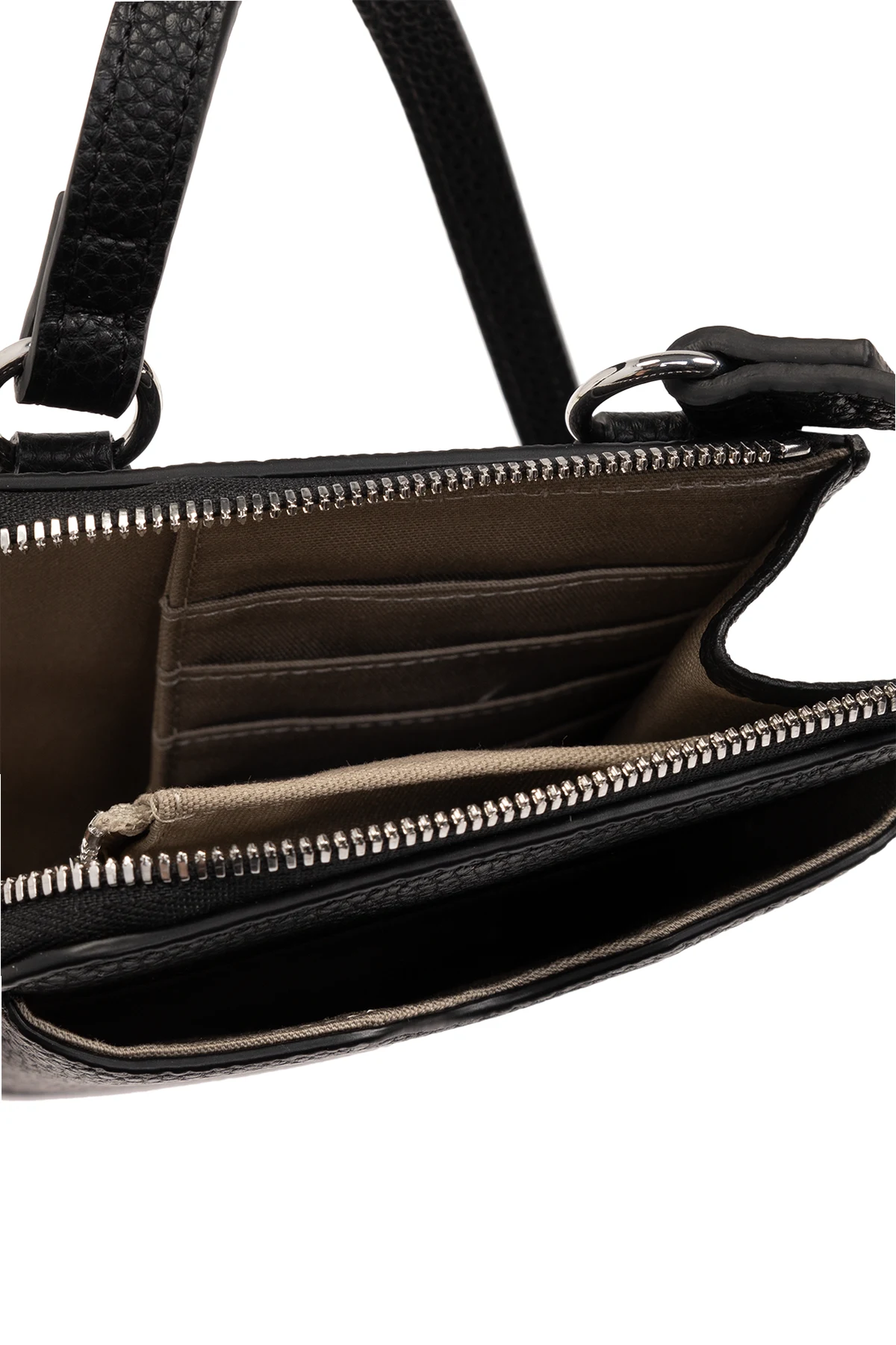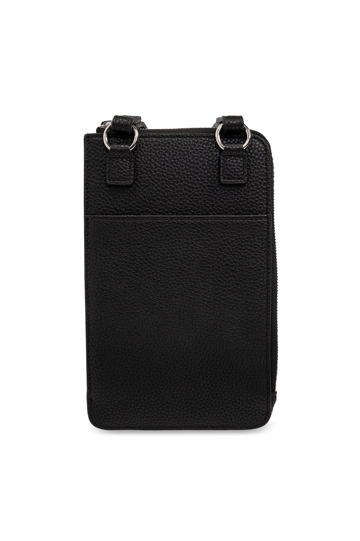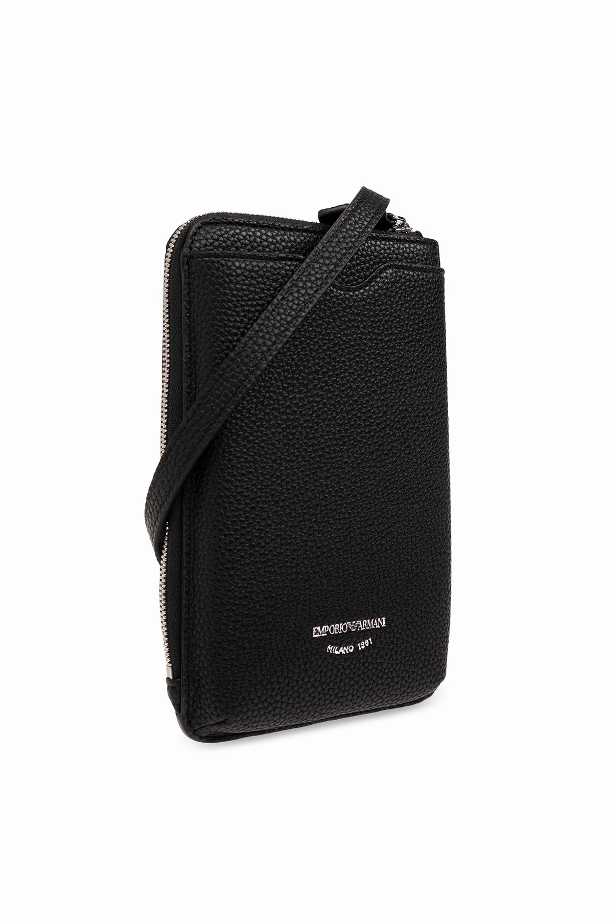 Czarne etui na telefon Emporio Armani. Wykonane z materiału imitującego skórę o ziarnistej fakturze. Zamykane na zamek. Ozdobione wytłoczonym logo w kolorze srebrnym. Z przodu i z tyłu wsuwana kieszeń. Długi, regulowany pasek. Wewnątrz komora, kieszeń na monety zamykana na zamek, wsuwana kieszeń i cztery miejsca na karty. Metalowe elementy w kolorze srebrnym.