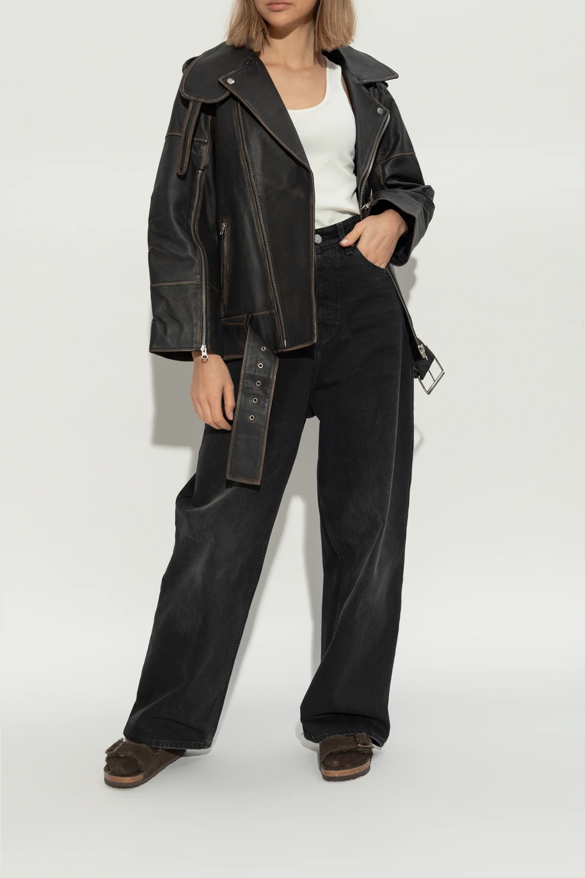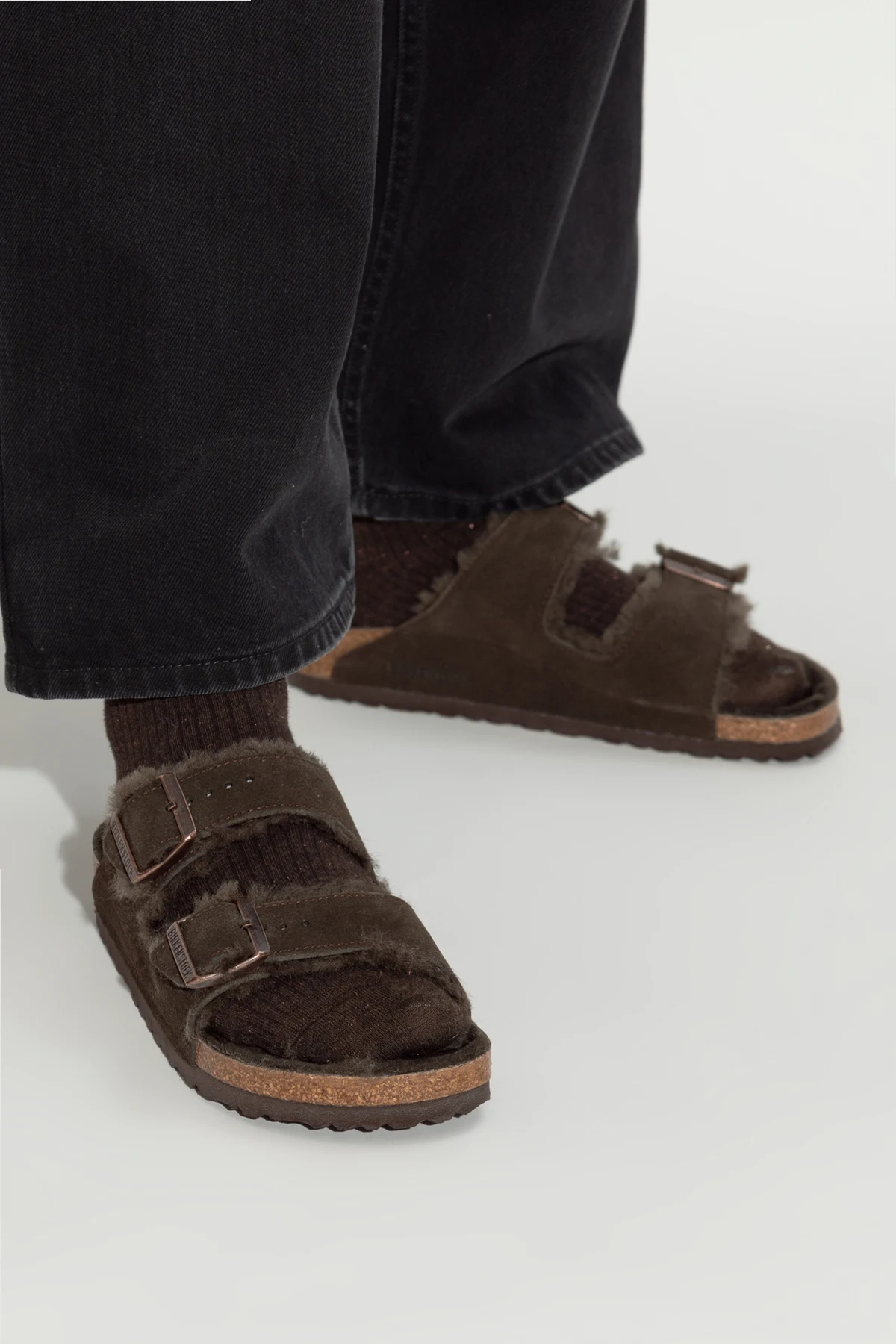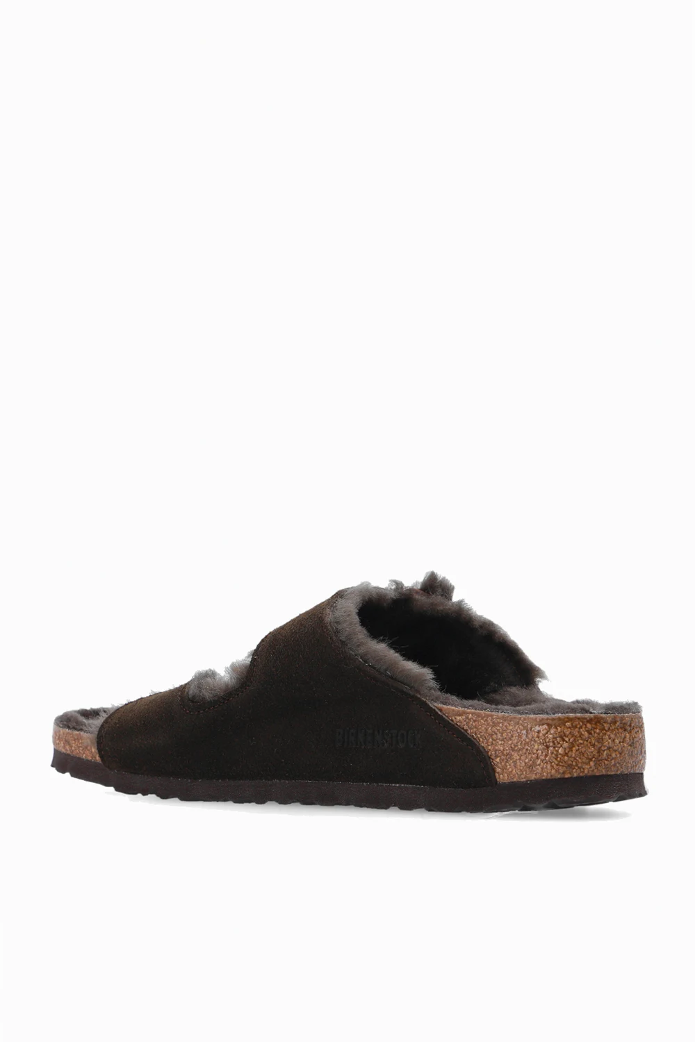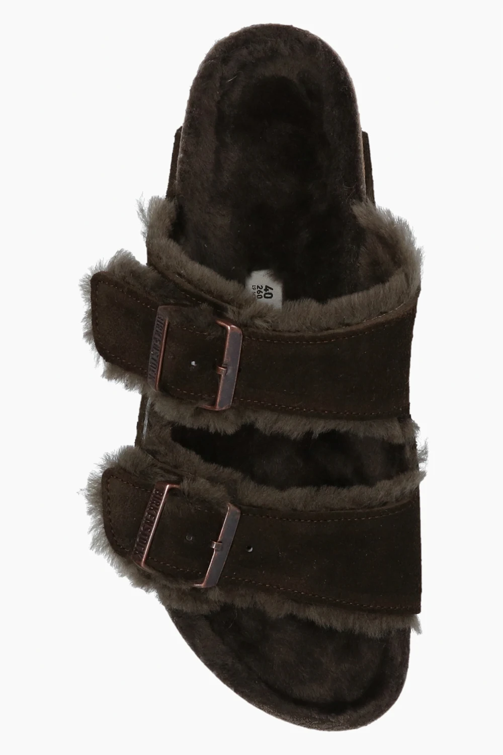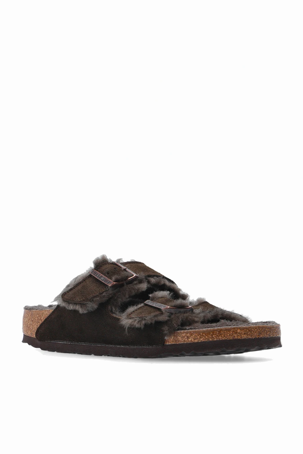 Ciemnobrązowe klapki, model ‘Arizona Shearling’ Birkenstock. Wykonane z zamszu. Paski z klamrami z wytłoczonym logo. Warstwa wewnętrzna wykończona strzyżonym futrem owczym. Brązowa podeszwa wykonana z naturalnego korka oraz pianki EVA.