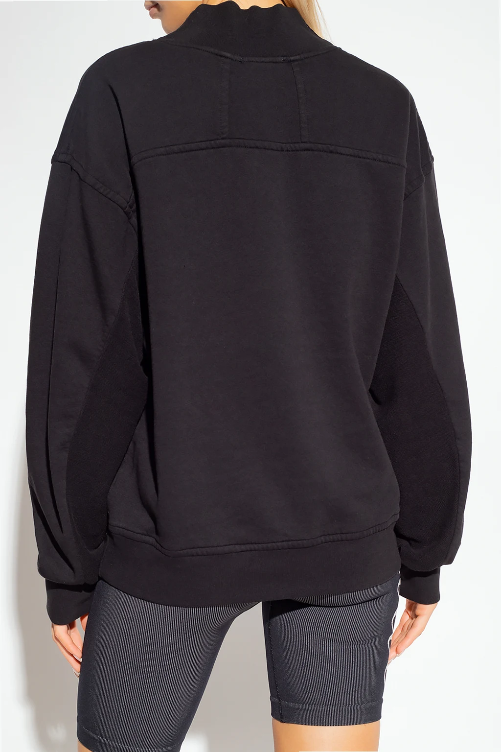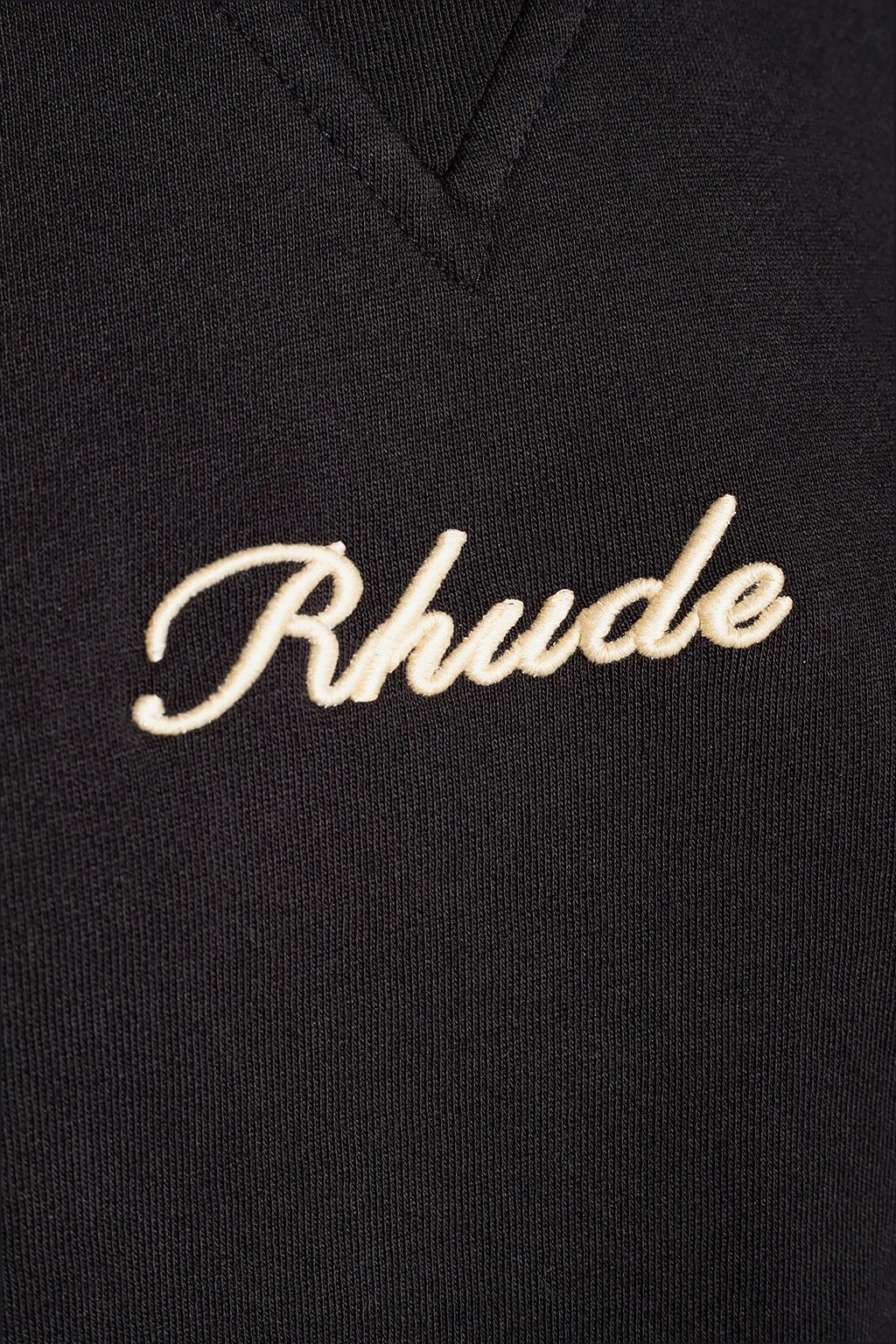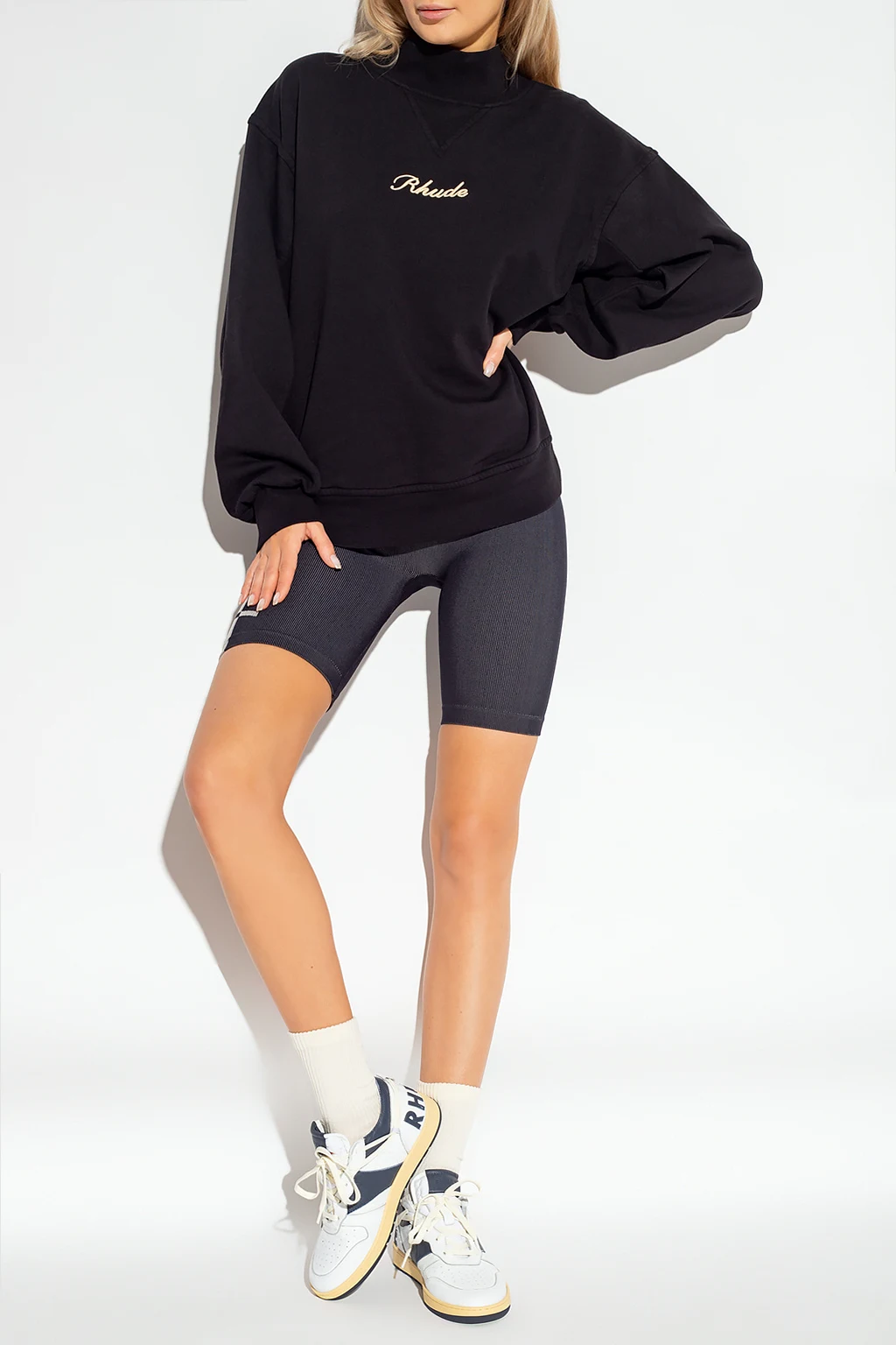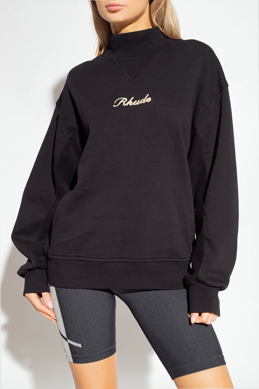 Czarna, bawełniana bluza o luźnym kroju ze stójką Rhude. Z przodu ozdobiona wyszytym kremowym logo. Długie rękawy i dół bluzy zakończone ściągaczem.