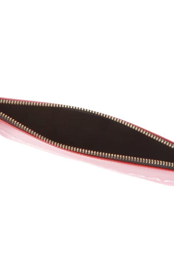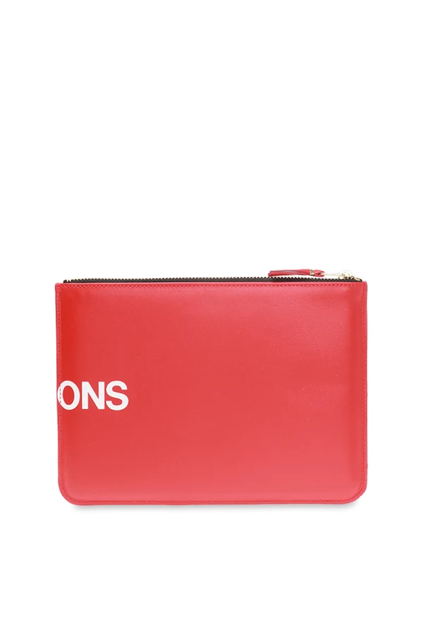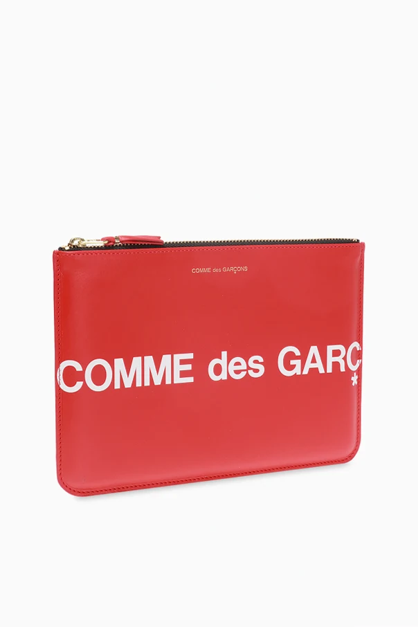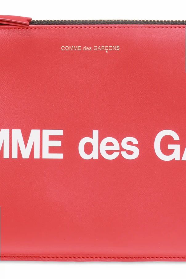 Czerwona, skórzana saszetka Comme des Garçons. Zamykana na zamek. Ozdobiona nadrukowanym logo w kolorze białym. Wewnątrz komora.