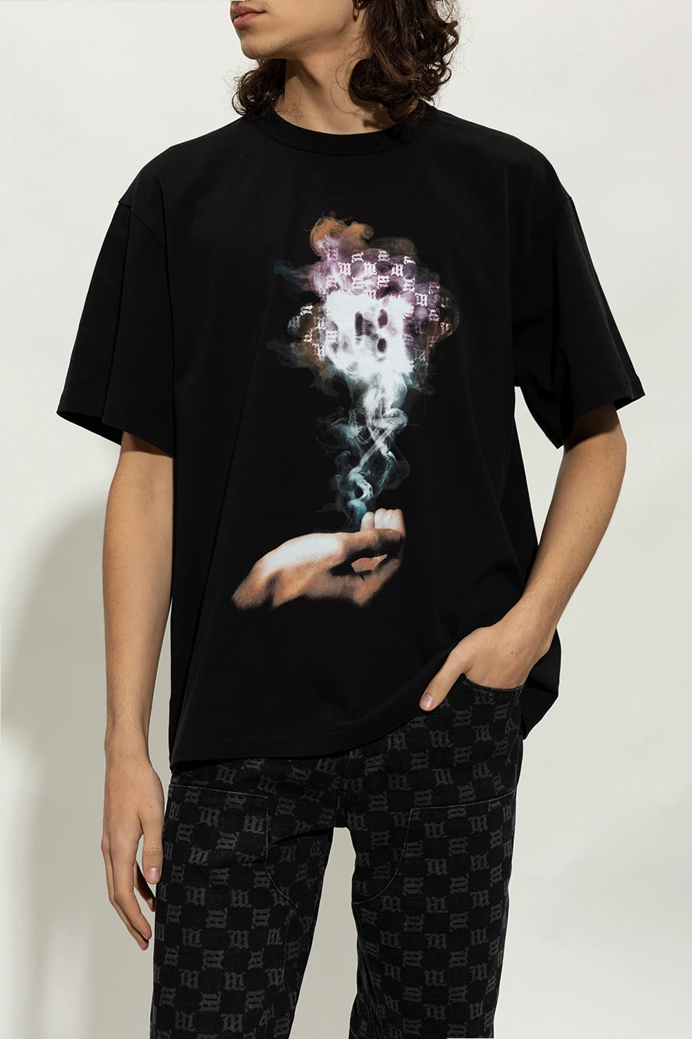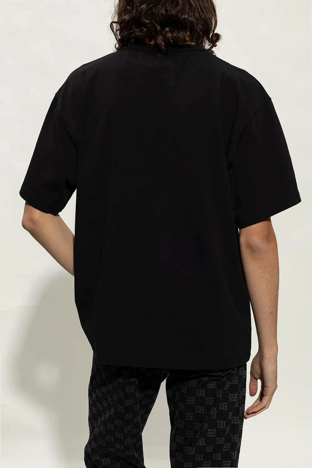 Czarny t-shirt, model ‘Tulum II’ MISBHV. Wykonany z bawełny. Ozdobiony kolorowym nadrukiem z monogramem. Okrągły dekolt wykończony ściągaczem. Krótkie rękawy.