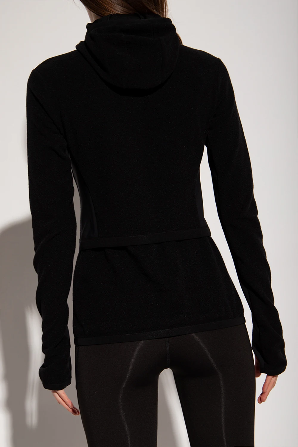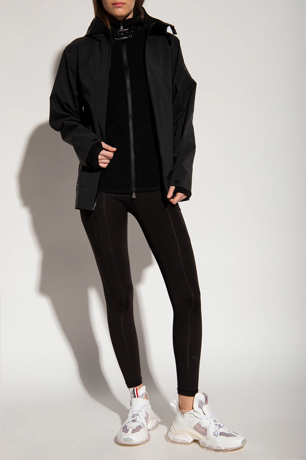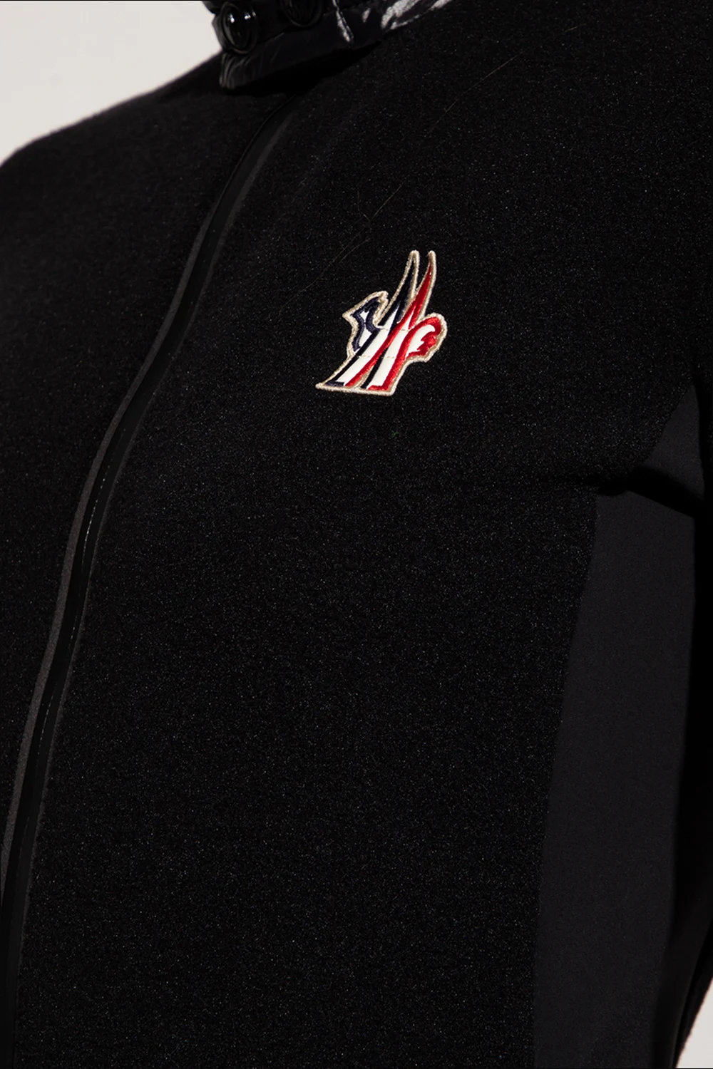 Czarna bluza z kapturem Moncler. Zapinana na dwubiegunowy zamek. Ozdobiona naszywką z logo w kolorze kremowo-granatowo-czerwonym. Dwie kieszenie zapinane na zamek. Długie rękawy.