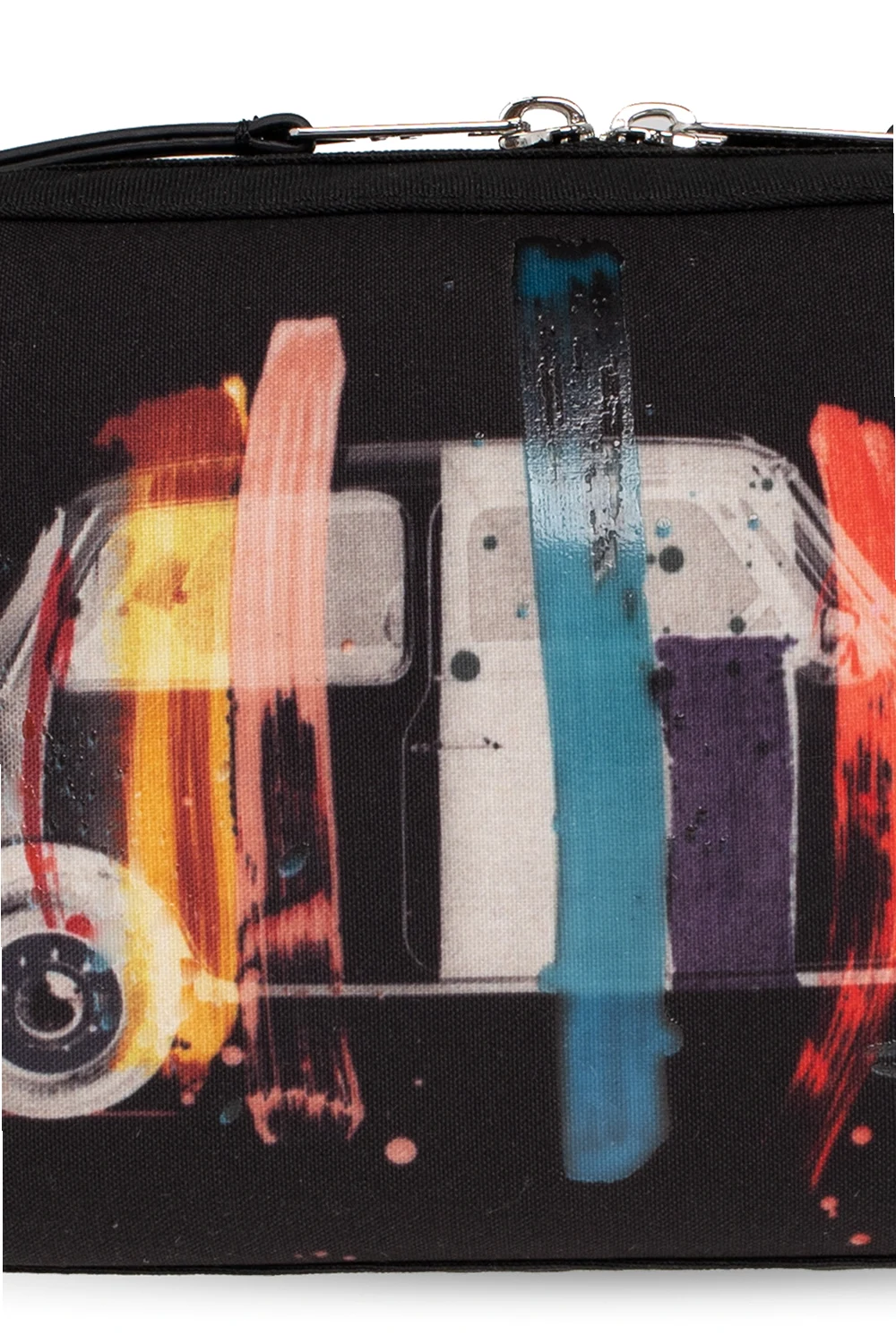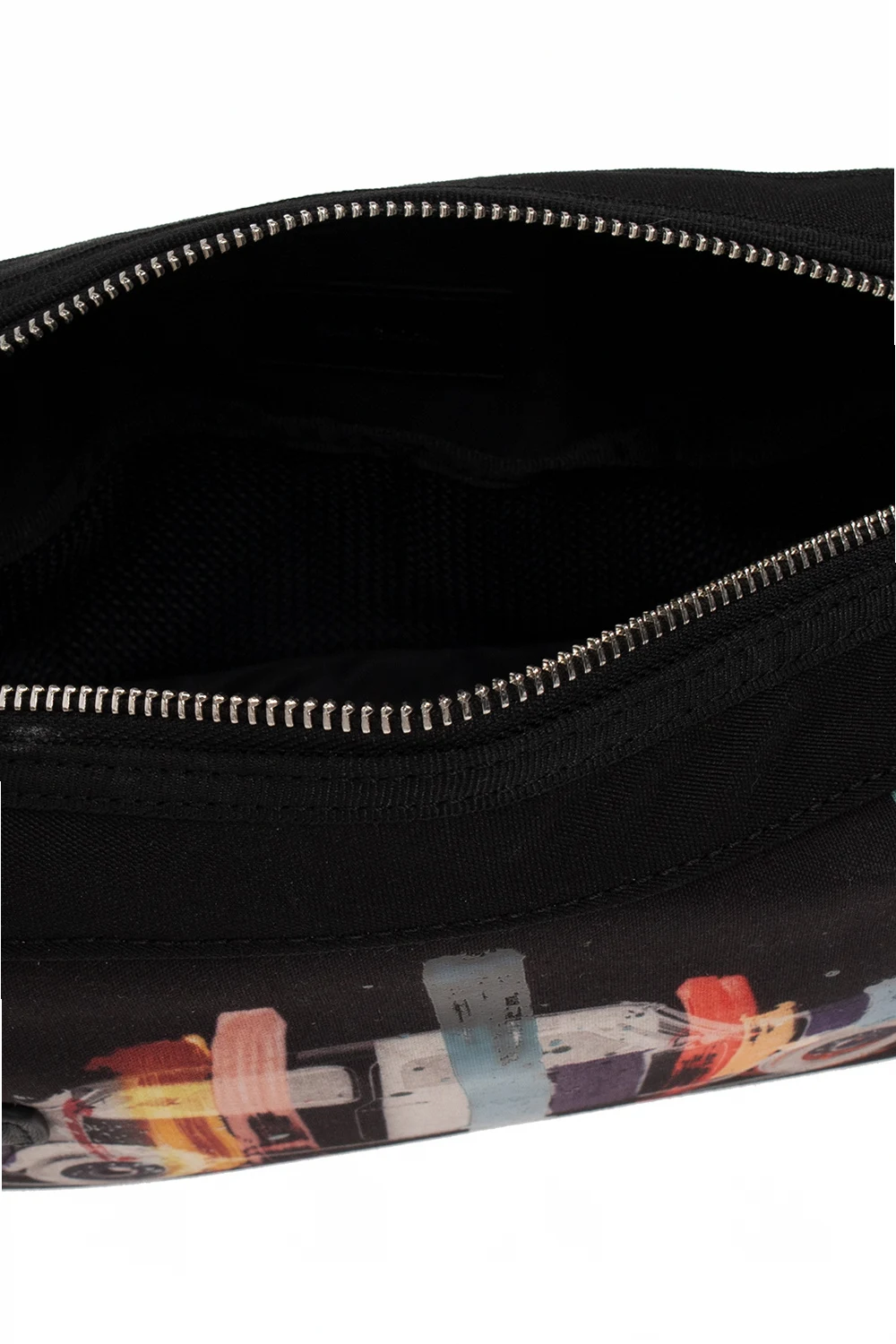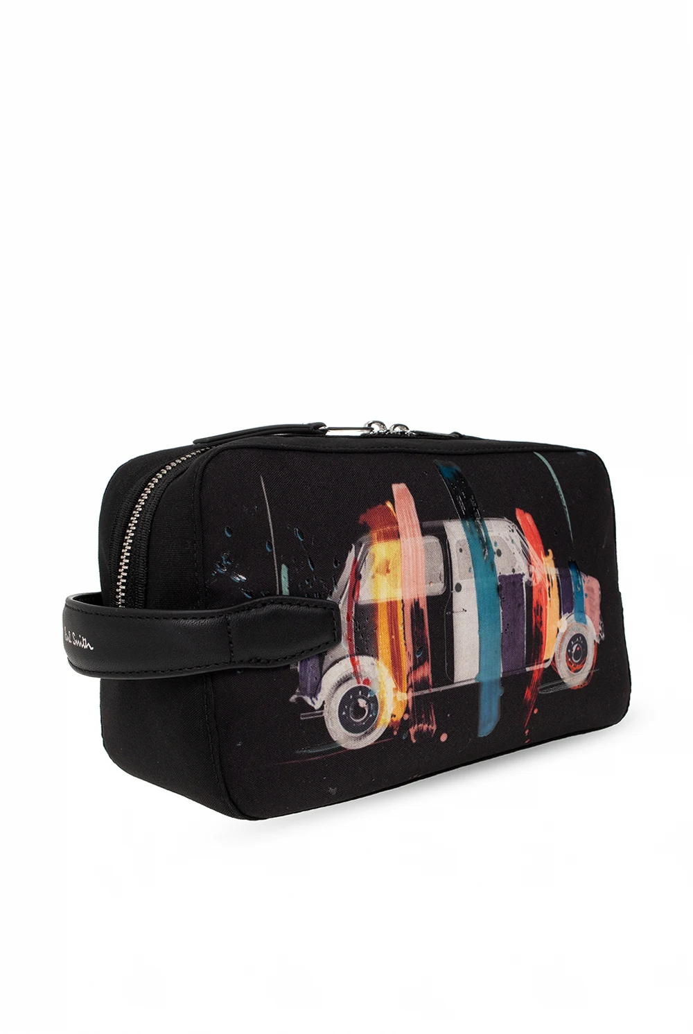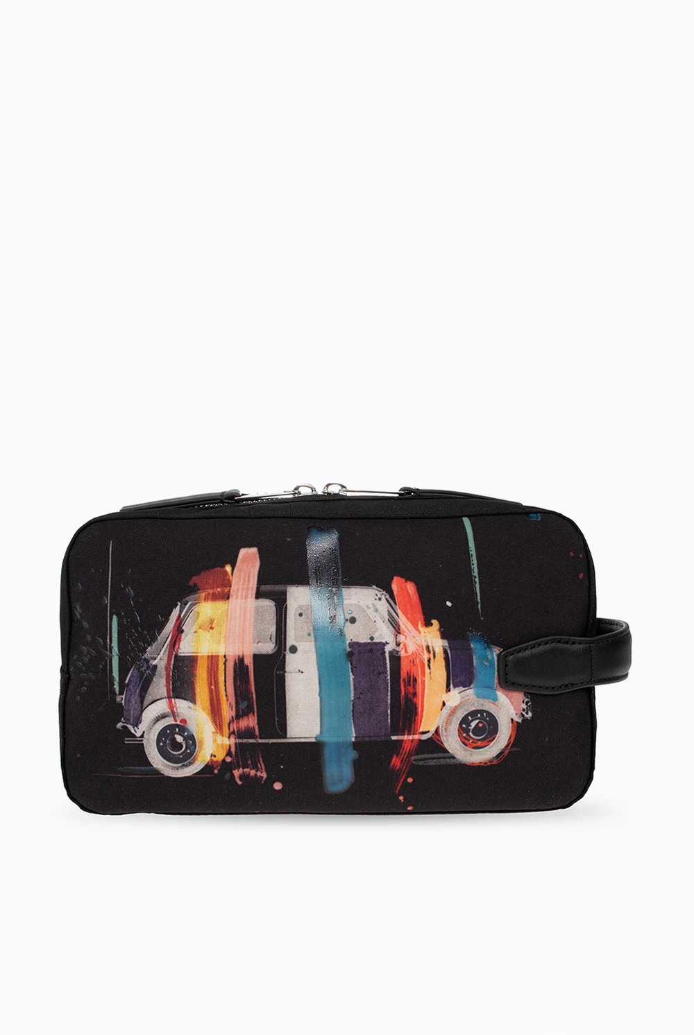 Czarna kosmetyczka Paul Smith. Wykonana z materiału z recyklingu. Zamykana na dwubiegunowy zamek. Ozdobiona kolorowym nadrukiem z motywem samochodu. Z boku skórzana półokrągła rączka z logo. Wewnątrz komora i dwie wsuwane kieszenie. Metalowe elementy w kolorze srebrnym.