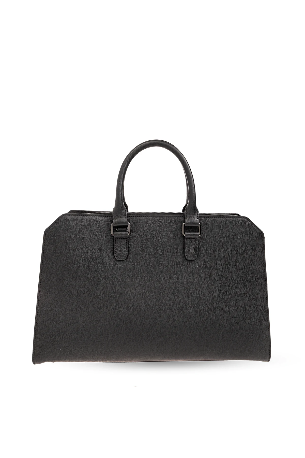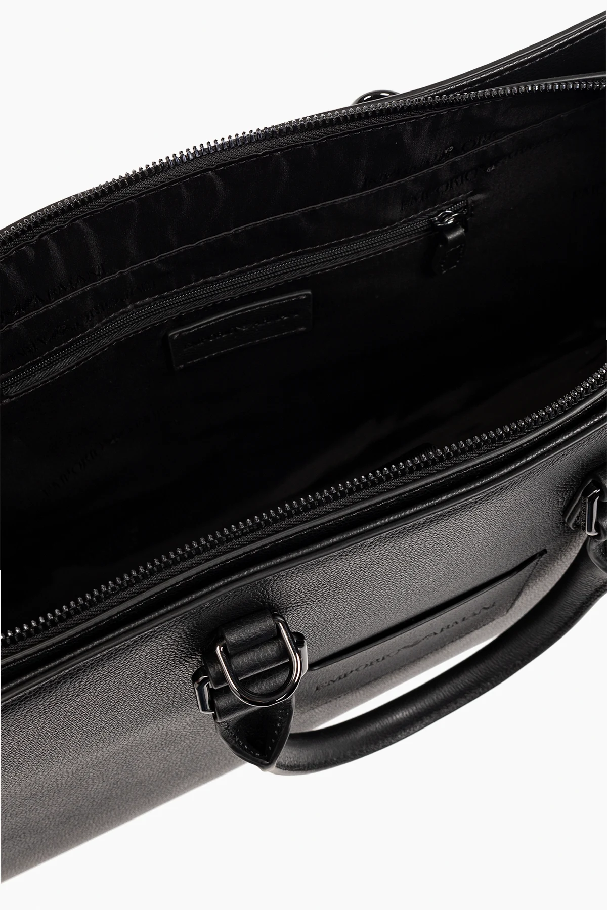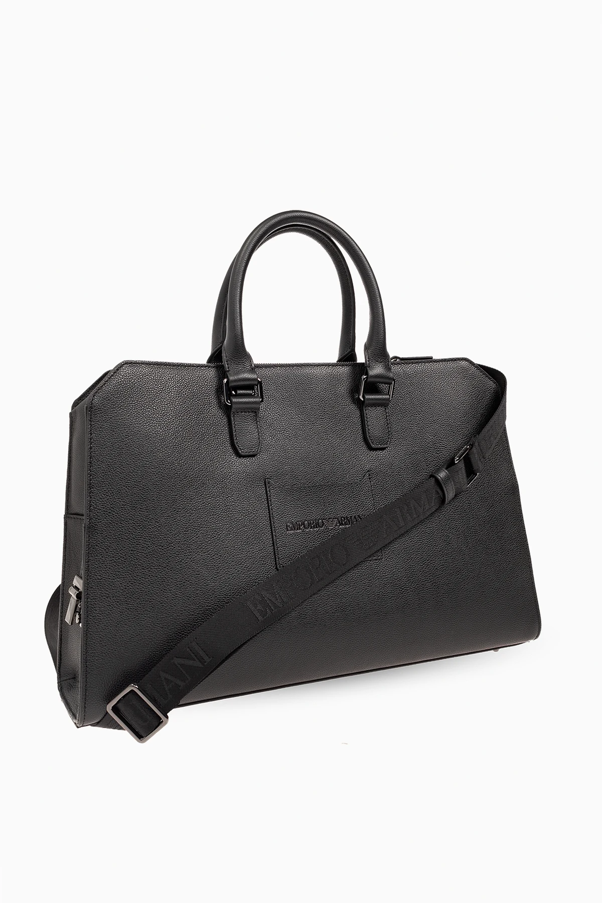 Czarna aktówka Emporio Armani. Wykonana ze skóry bydlęcej o ziarnistej fakturze. Zamykana na zamek z blokadą. Ozdobiona wytłoczonym logo. Z przodu miejsce na kartę. Dwie półokrągłe rączki. Odpinany, regulowany pasek. Wewnątrz komora, wsuwana kieszeń na laptopa oraz kieszeń zamykana na zamek. Metalowe elementy w kolorze ciemnego srebra.