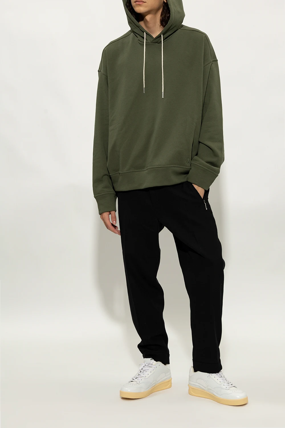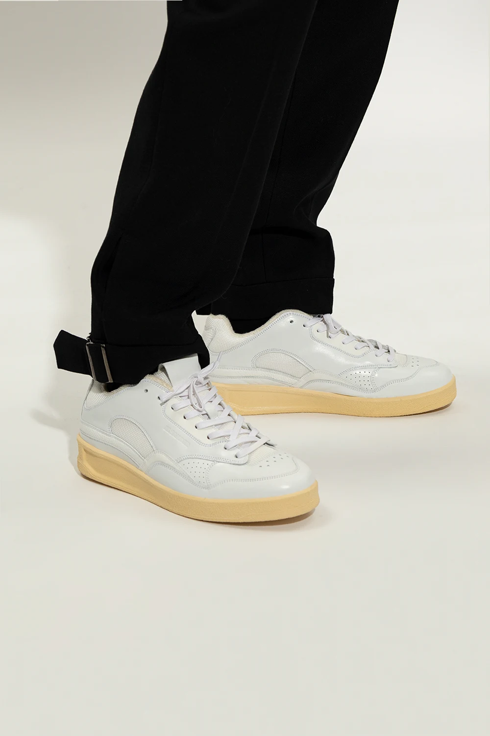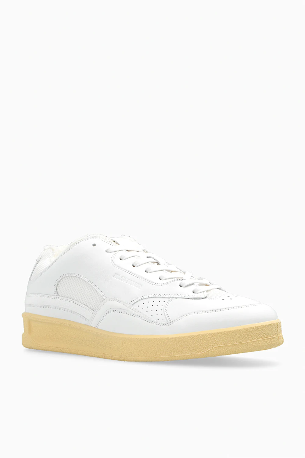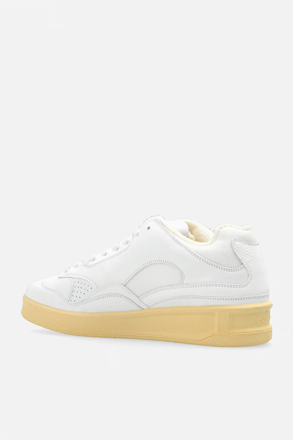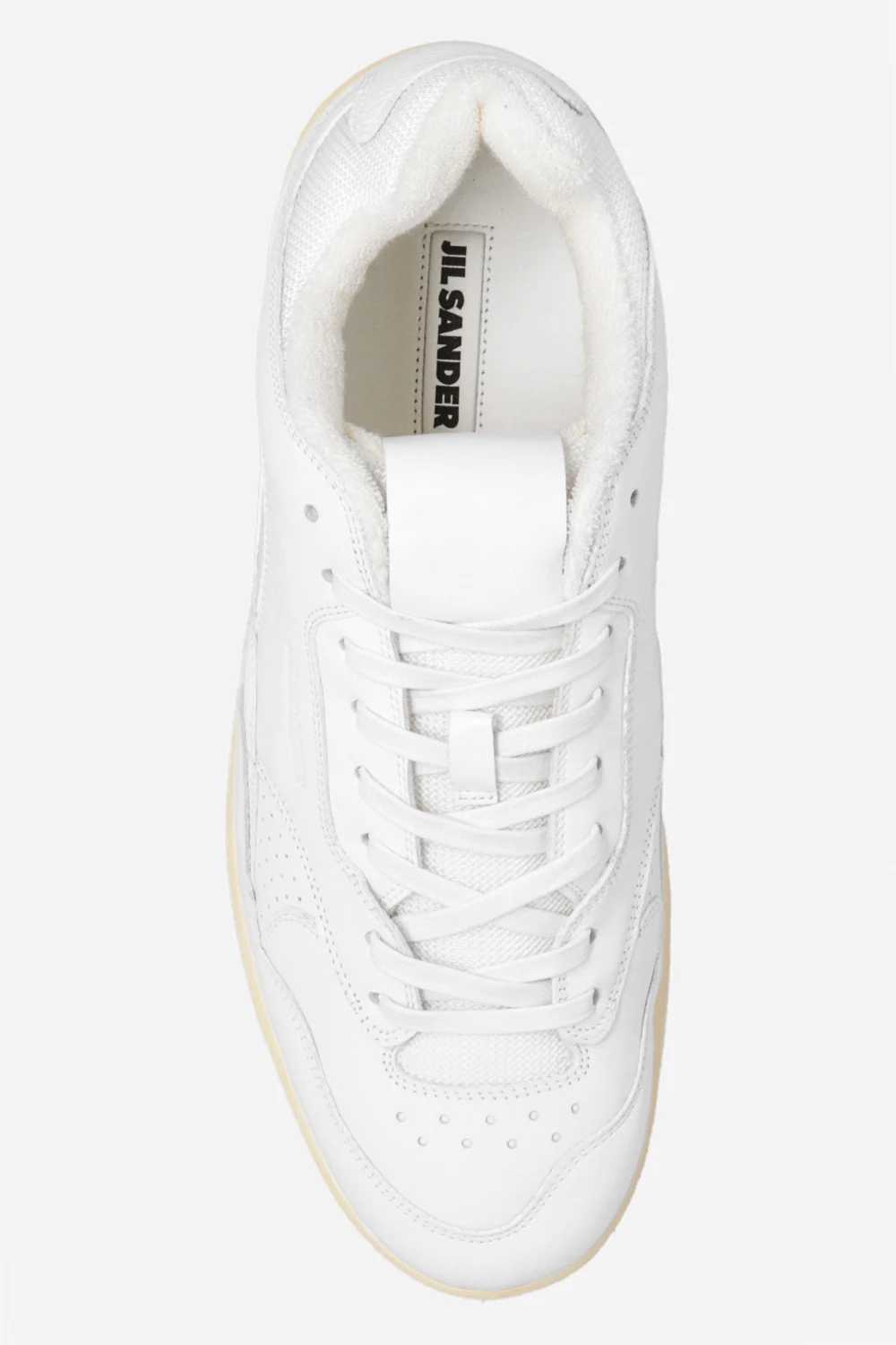 Białe, sznurowane buty sportowe Jil Sander. Wykonane ze skóry. Wykończone materiałem. Dekoracyjne perforacje. Z boku wytłoczone logo. Jasnobeżowa, gumowa podeszwa.