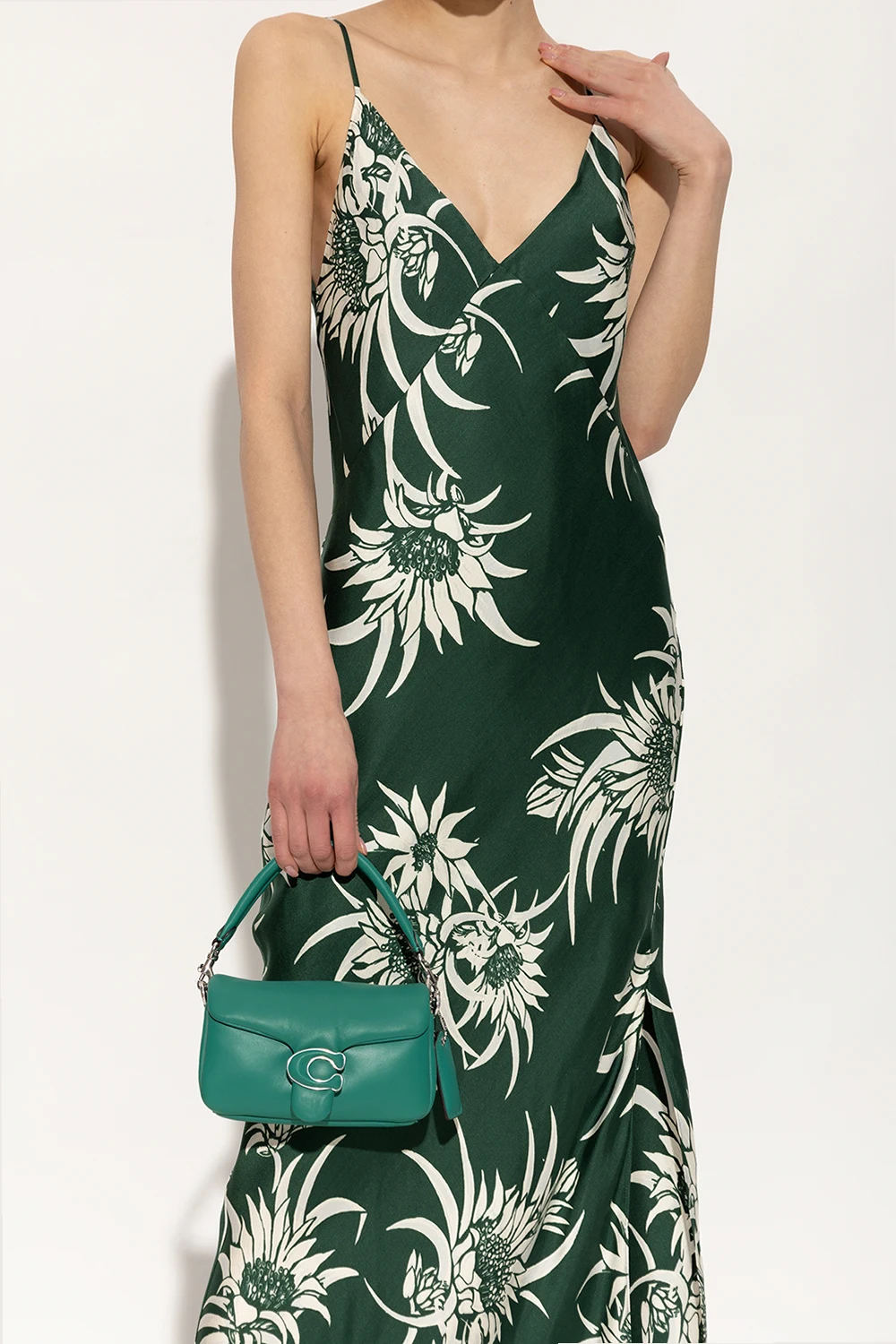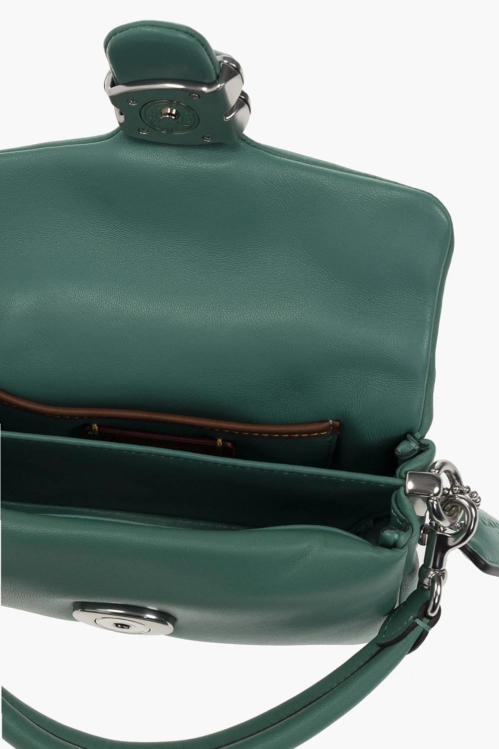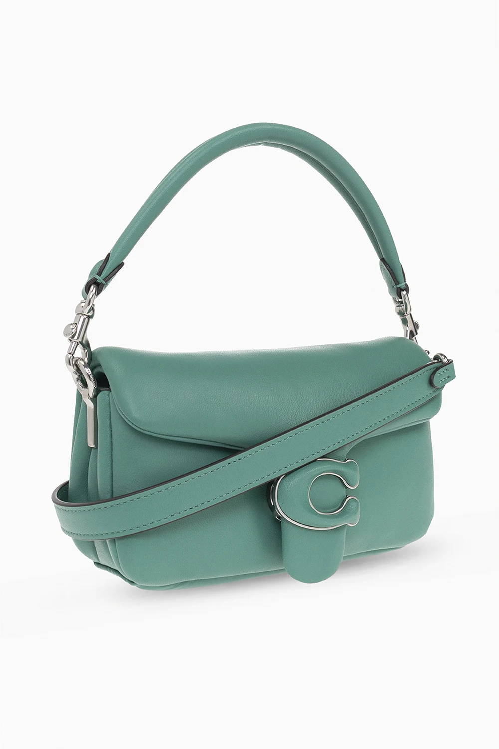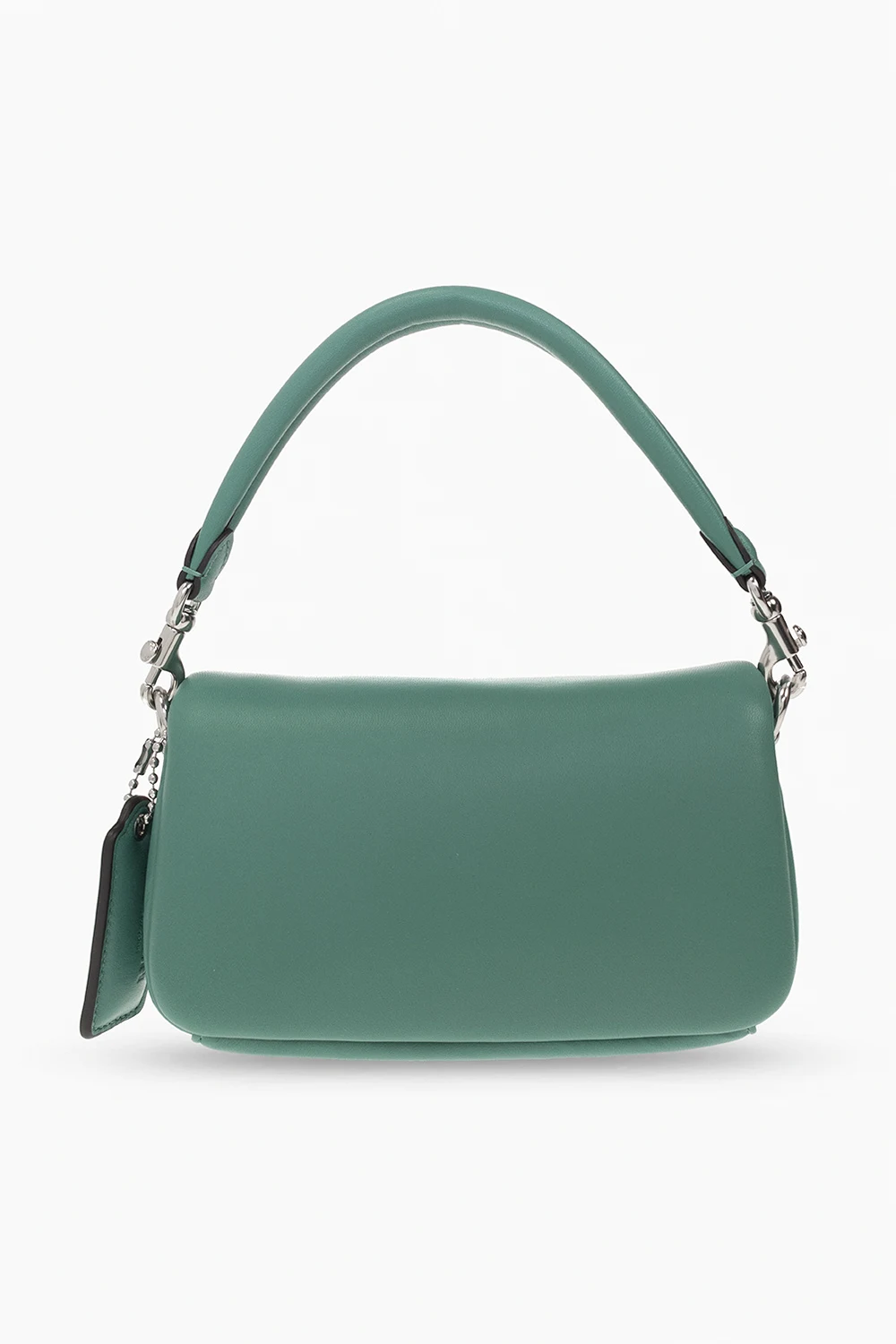 Zielona torba na ramię, model ‘Pillow Tabby 18’ Coach. Wykonana z owczej skóry. Zamykana na magnetyczny zatrzask. Ozdobiona aplikacją w kształcie logo. Dołączona charakterystyczna zawieszka. Odpinany, regulowany pasek. Wewnątrz dwie komory oraz wsuwana kieszeń. Metalowe wykończenie w kolorze srebrnym.