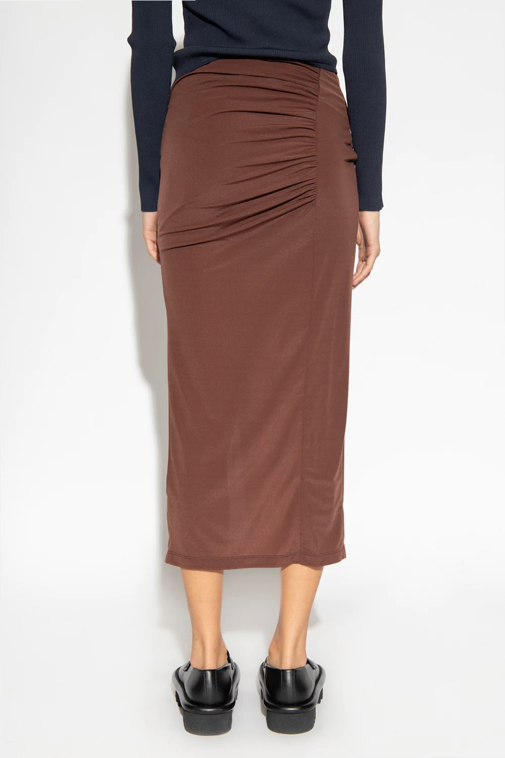 Brązowa spódnica Helmut Lang. Dekoracyjnie marszczona. Z przodu zapinana na zatrzaski.