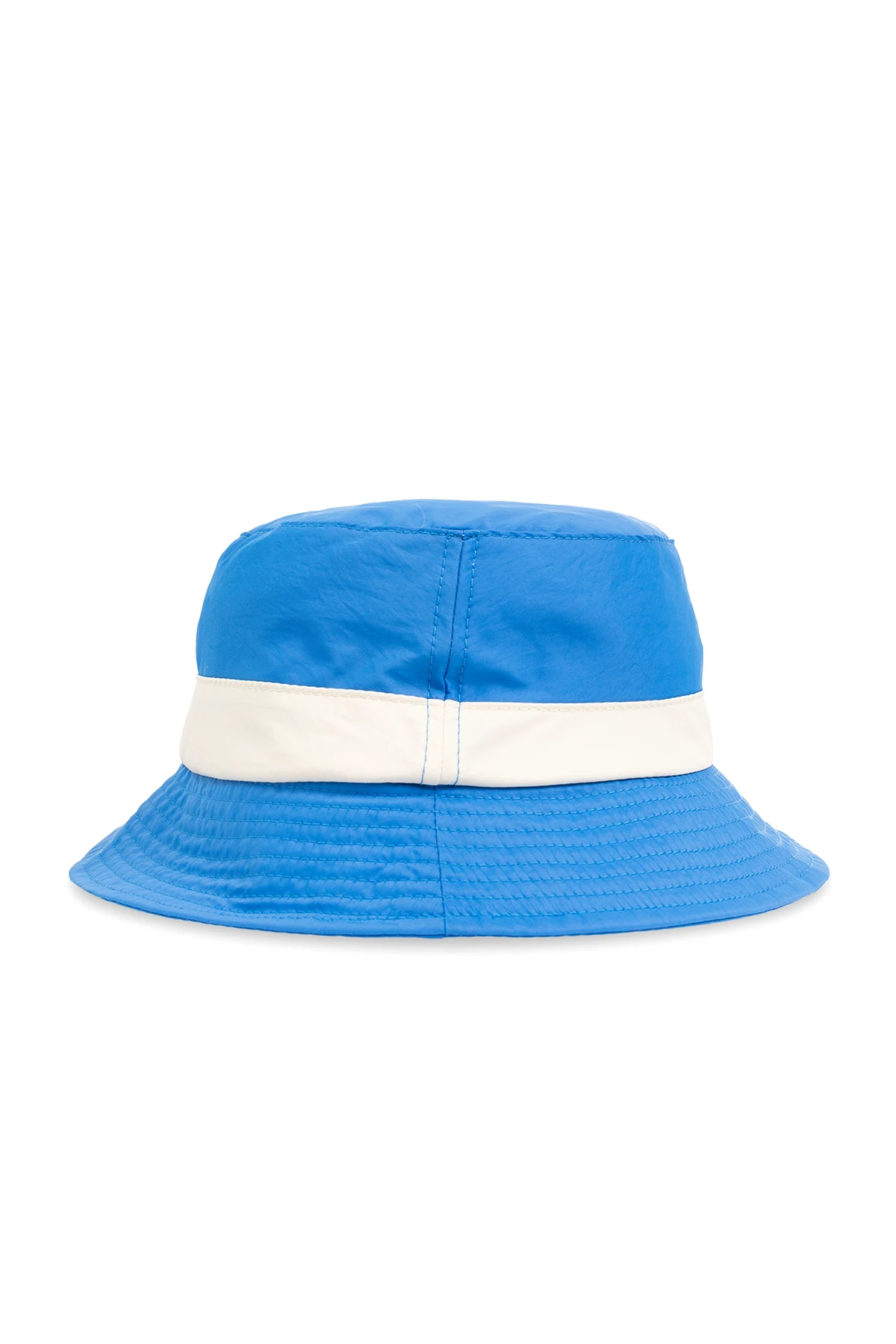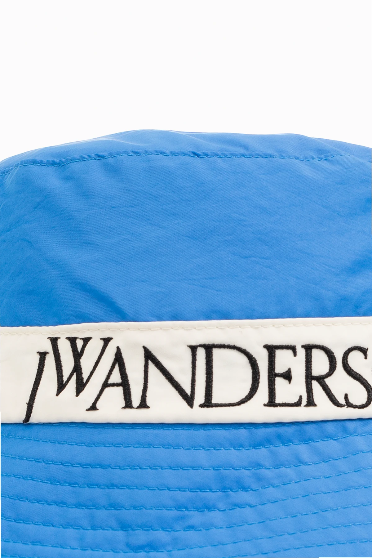Niebiesko-biały kapelusz JW Anderson. Ozdobiony wyszytym logo w kolorze czarnym.