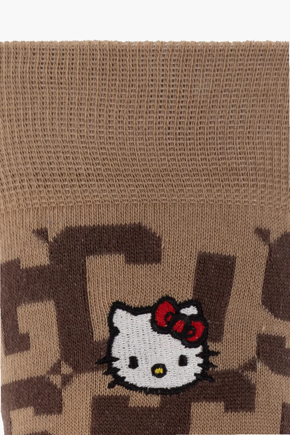 Brązowe skarpety GCDS. Wykonane z bawełny. Ozdobione wzorem z monogramem. Na jednej wyszyty kolorowy motyw ‘Hello Kitty’, na drugiej zielono-czerwony motyw wiśni. Wykończone ściągaczem.