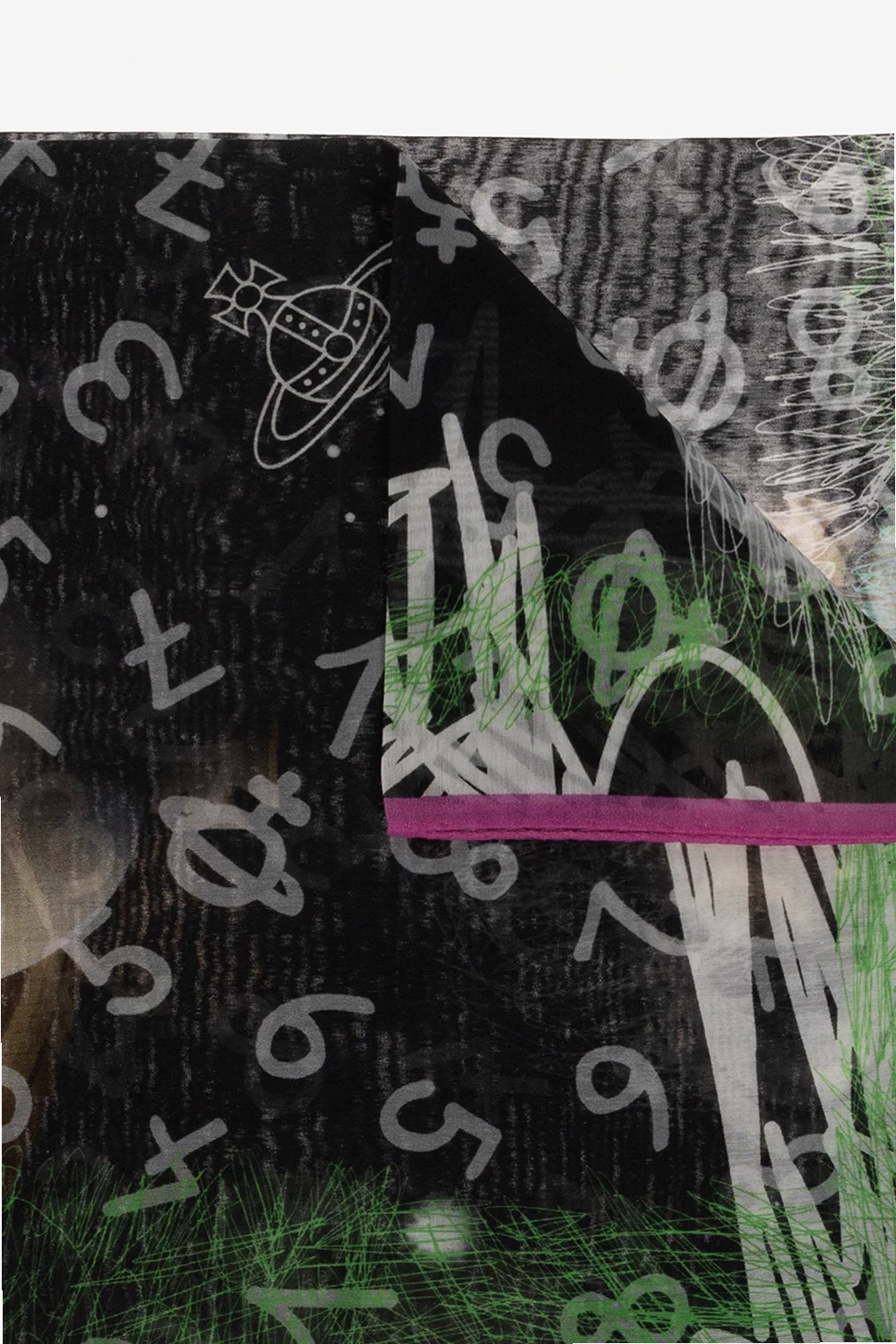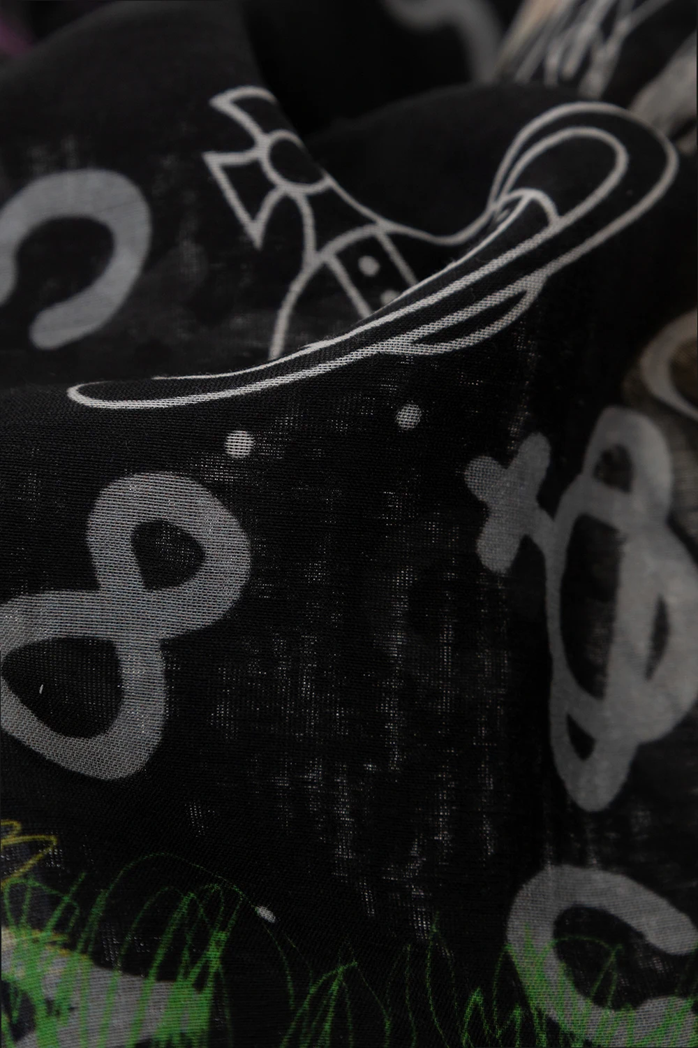Czarna, lekko transparentna chusta Vivienne Westwood. Wykonana z bawełny i jedwabiu. Ozdobiona wzorem z logo w kolorze biało-zielono-różowym.
