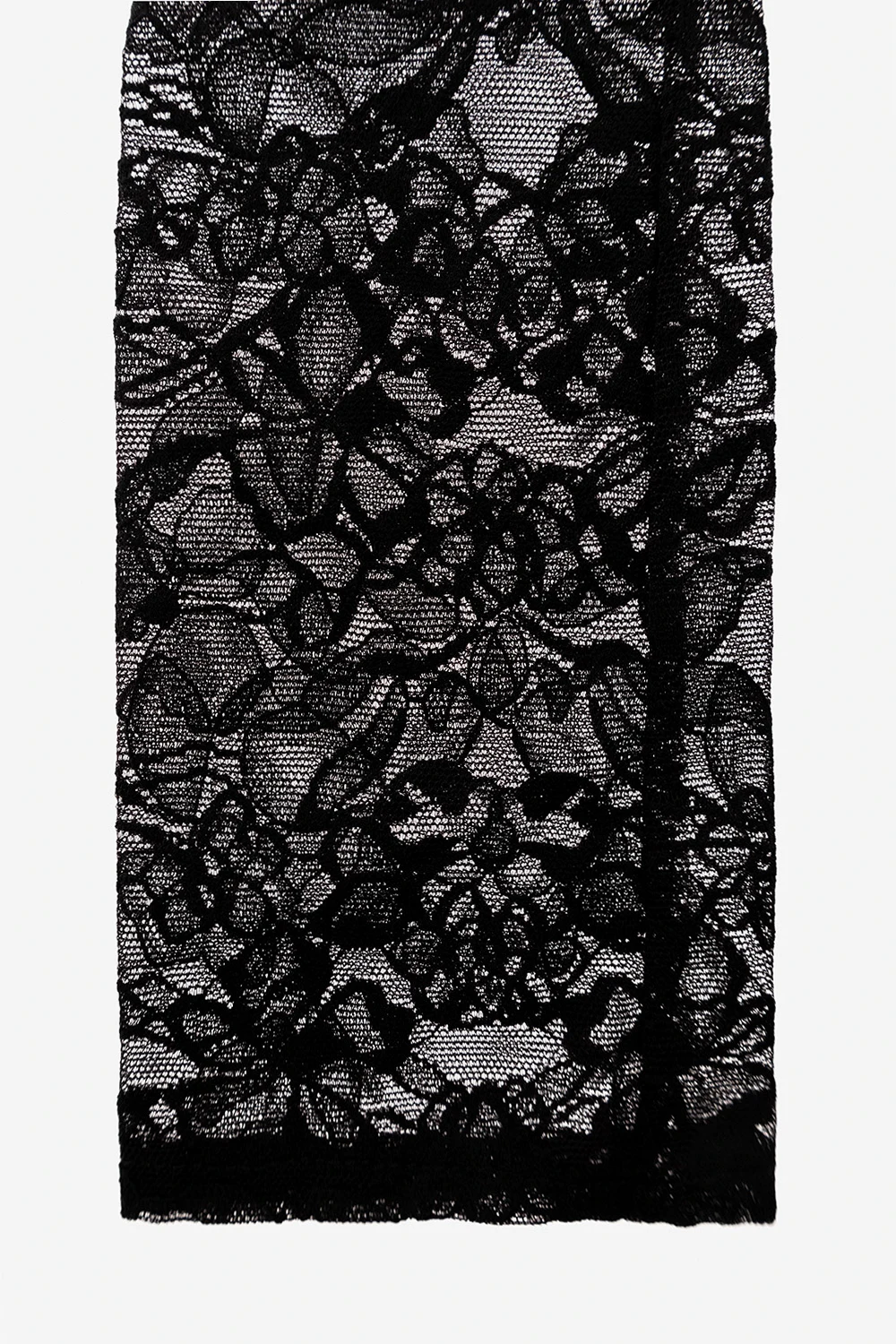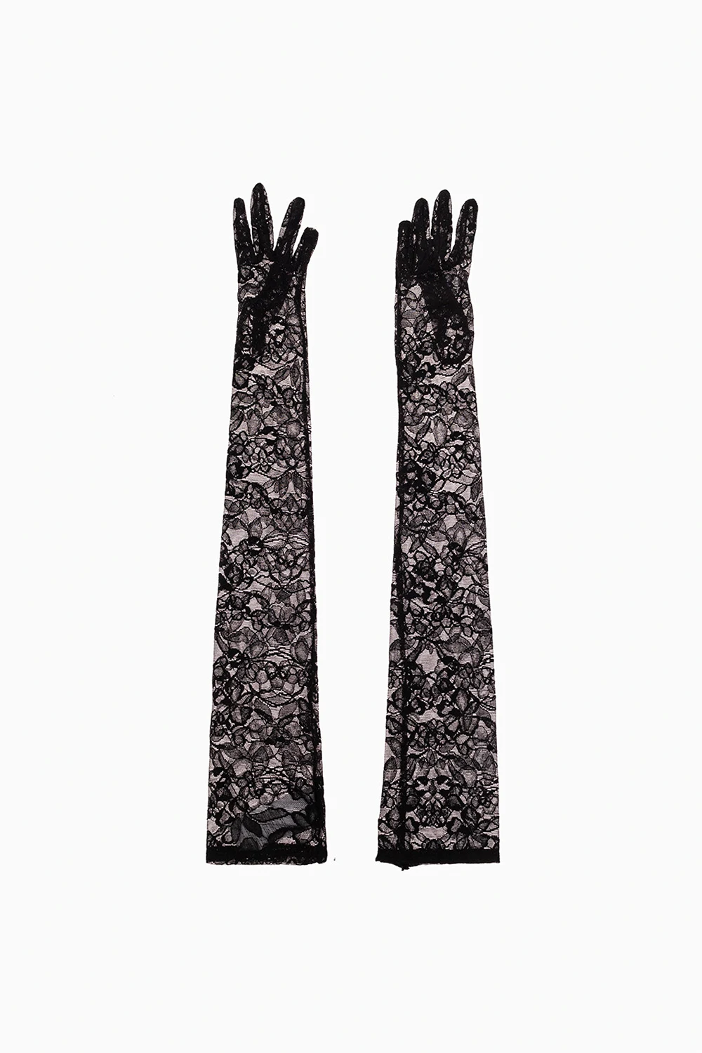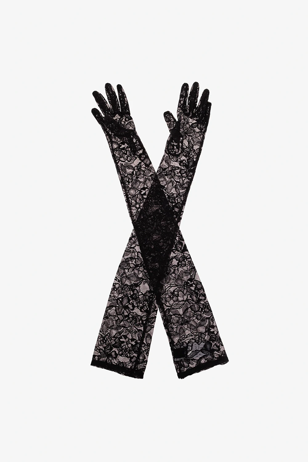 Czarne, długie rękawiczki Versace. Wykonane z koronki z motywem kwiatowym.