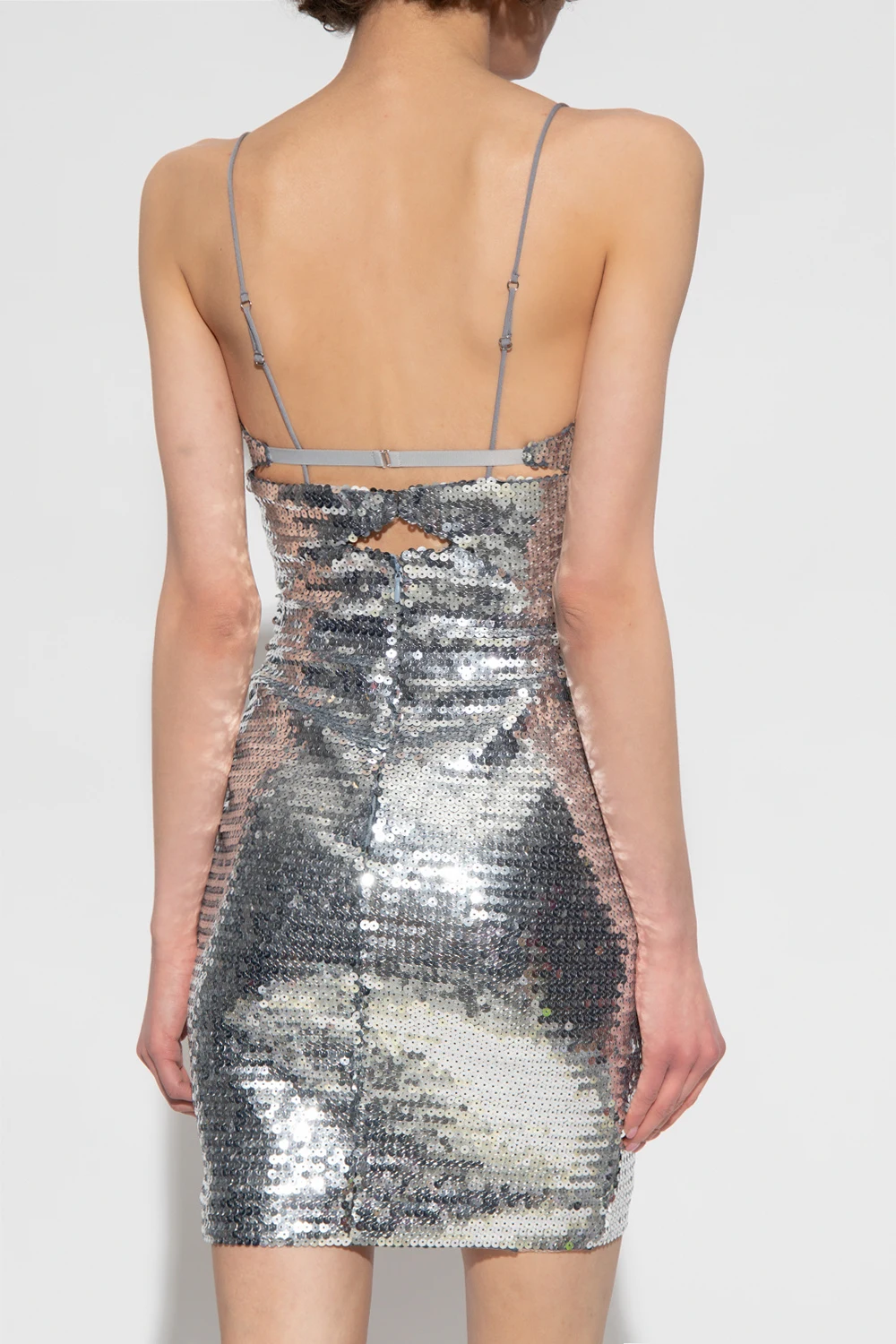 Sukienka na ramiączkach w kolorze srebrnym Nensi Dojaka. Z tyłu zapinana na zamek oraz haftkę. Regulowane ramiączka. Dekoracyjne wycięcie oraz metalowa aplikacja. Cekinowe wykończenie.